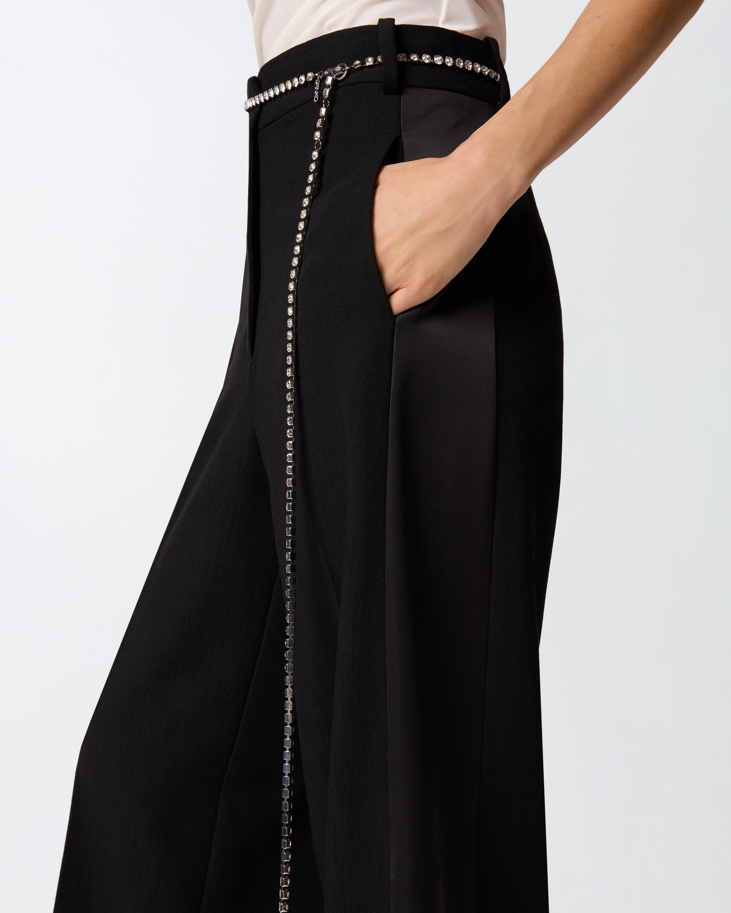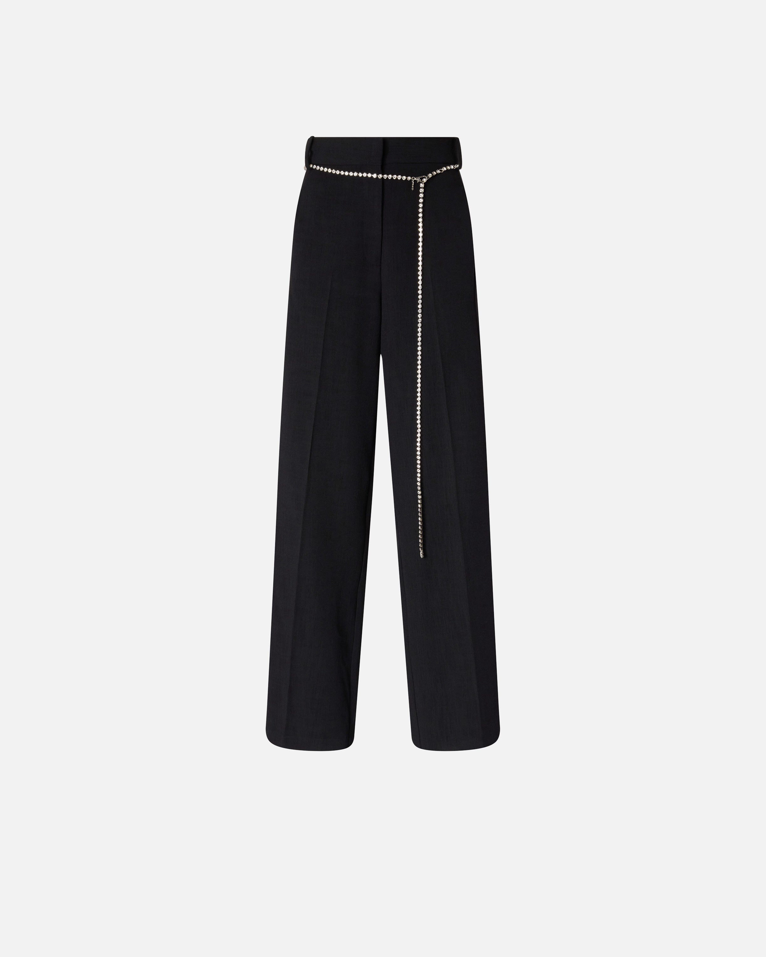 Trousers in yarn-dyed slub fabric, featuring side stripes and back welt pockets in smooth, glossy tone-on-tone satin, which create a delicate contrast with the main fabric. The garment, with internal lining, features a versatile straight-leg design, and a refined pressed crease down the middle of the leg, hidden side pockets and a hidden zip and button fastening. But the detail that makes all the difference is the slim, removable jewel belt with clasp, with set crystals that elegantly reflect light. Wear these trousers with the matching jacket for an outfit that will make you shine even on the most formal occasions. - CEDRO TROUSERS