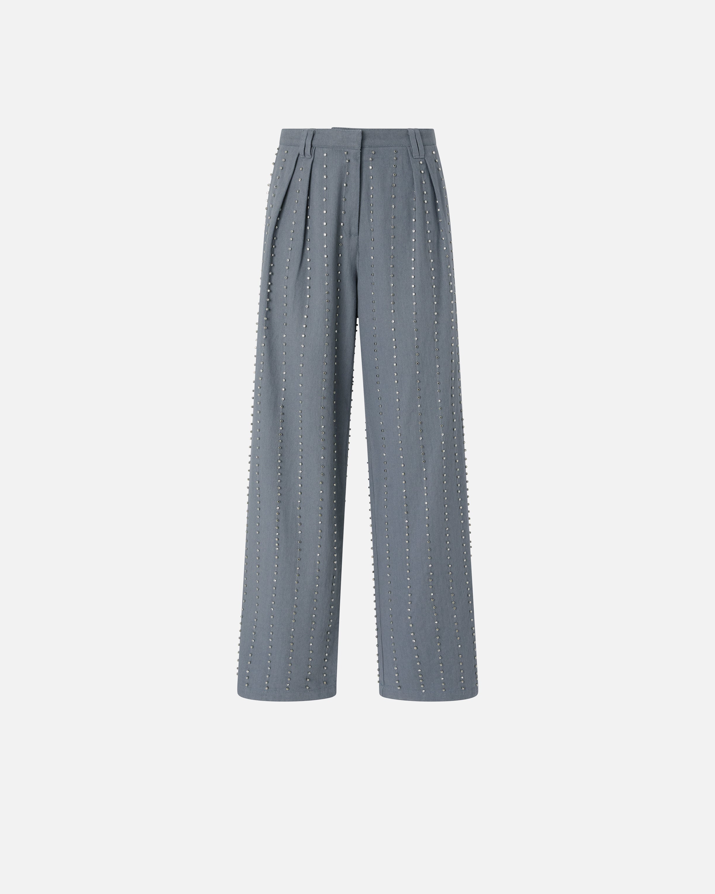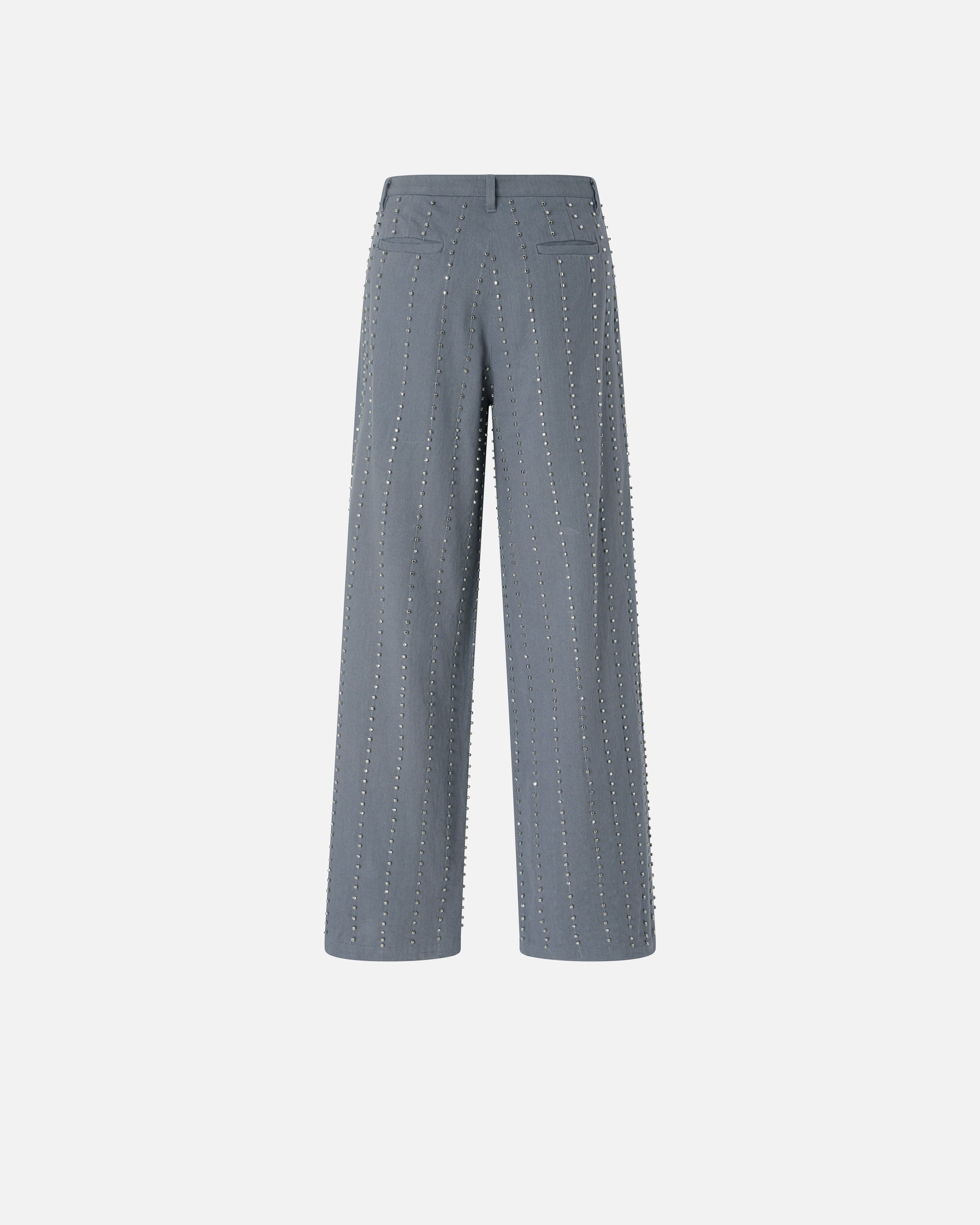 Trousers in pure cotton twill fabric with a wide, flowing appearance, featuring side pockets, rear welt pockets and refined front darts. Thanks to the striking, pinstripe-inspired motif formed by alternating small cube-shaped metallic elements and hand-embroidered set crystals, this piece is a real gem—literally. This garment is lined for greater comfort when worn. - PENNY TROUSERS