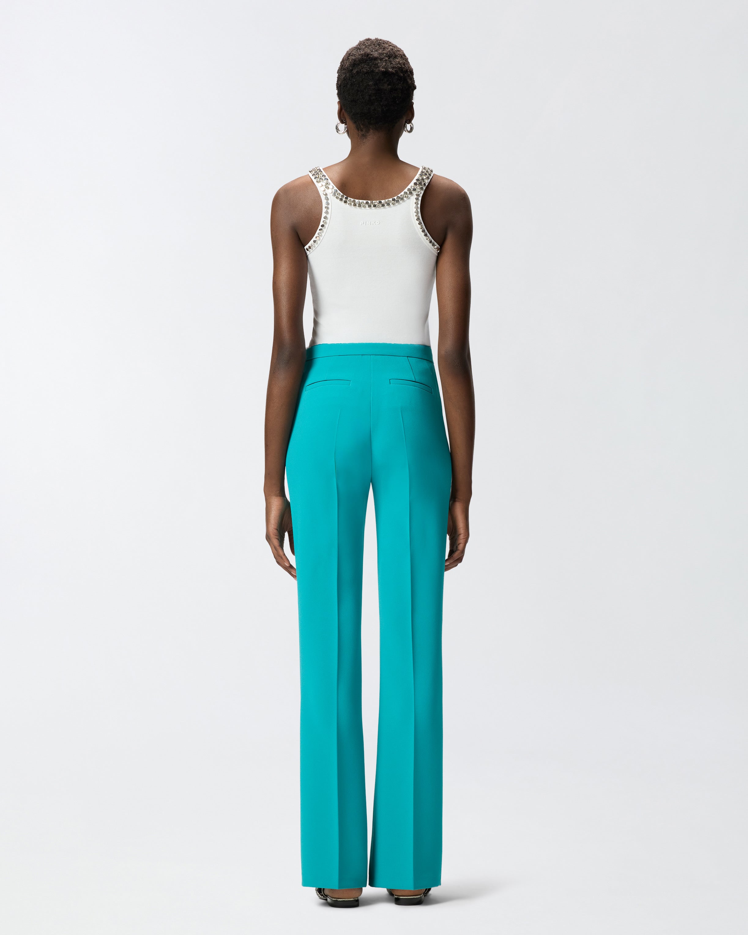 Slightly flared trousers with refined pressed pleats down the legs and two welt pockets on the back. This garment, lined with lightweight georgette, is made from technical canvas—a comfortable, breathable fabric that provides an irresistible combination of functionality and modern elegance. Wear these trousers with the matching Spencer jacket for a head-to-toe look suitable for formal occasions or pair with more casual garments for an outfit with an urban-chic edge. - EDAMAME TROUSERS