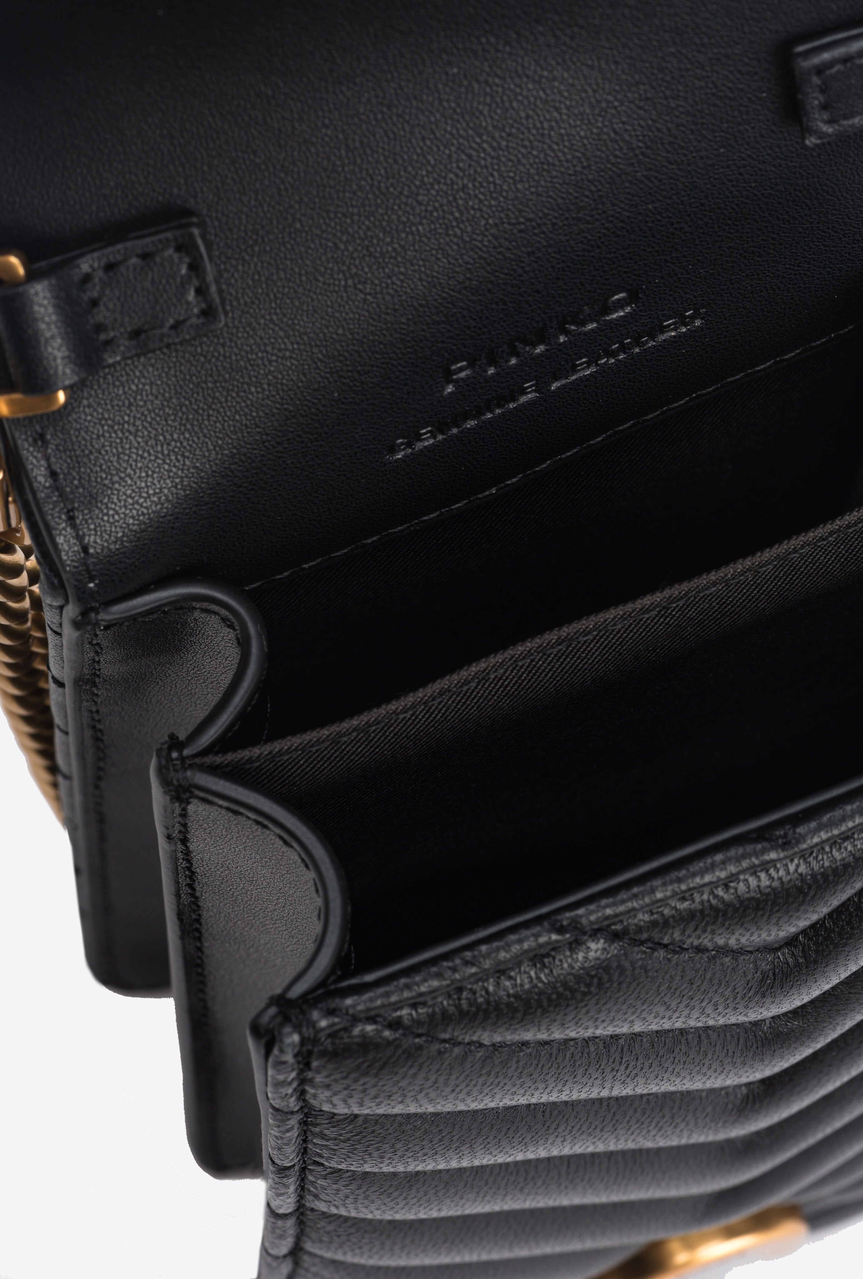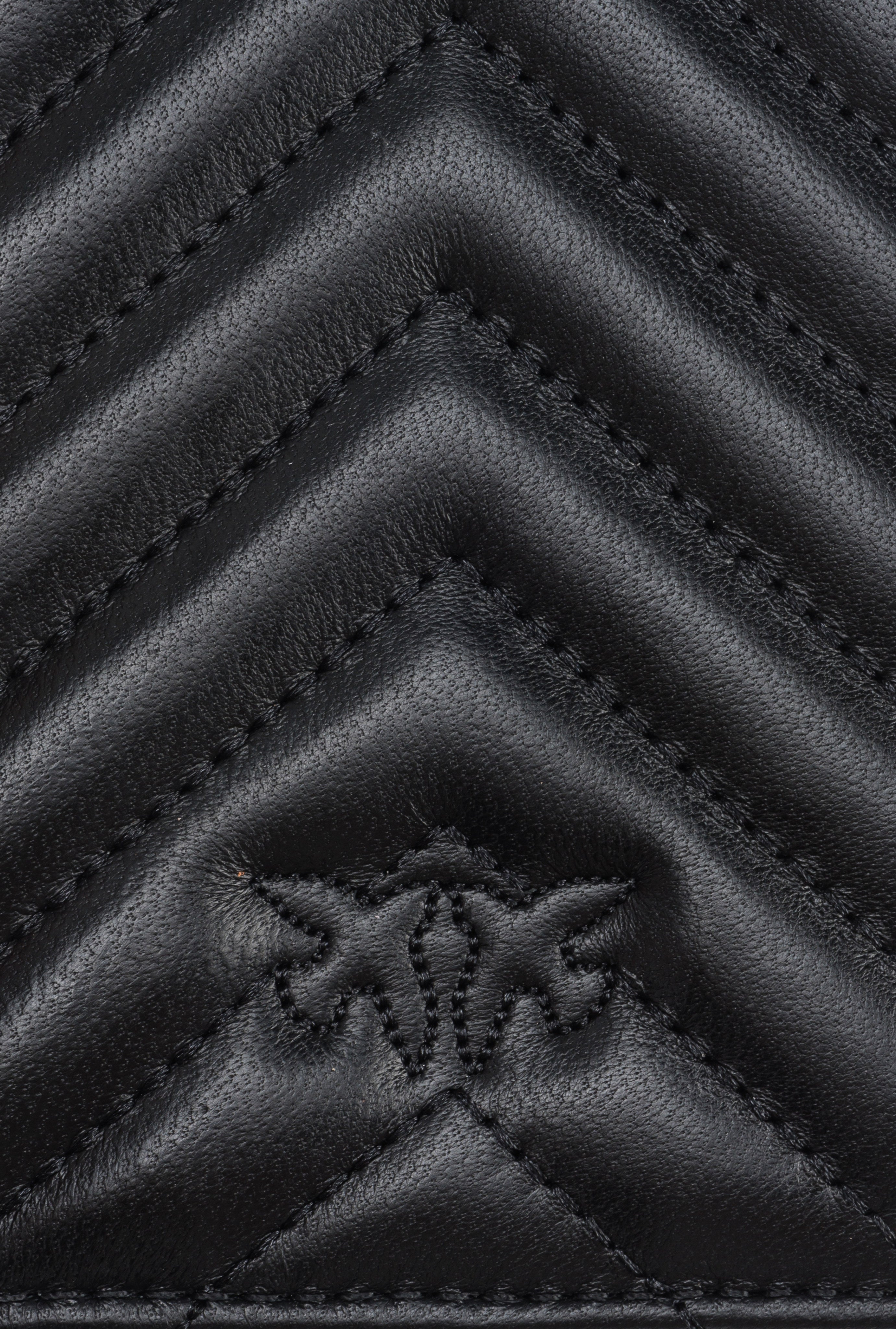 Smartphone case in quilted, chevron-patterned nappa leather with custom metal Love Birds Diamond Cut metal buckle. The accessory features microsuede inner lining and a centre divider pocket that divides the space into two compartments. Complete with a thin, removable round metal-chain shoulder strap.