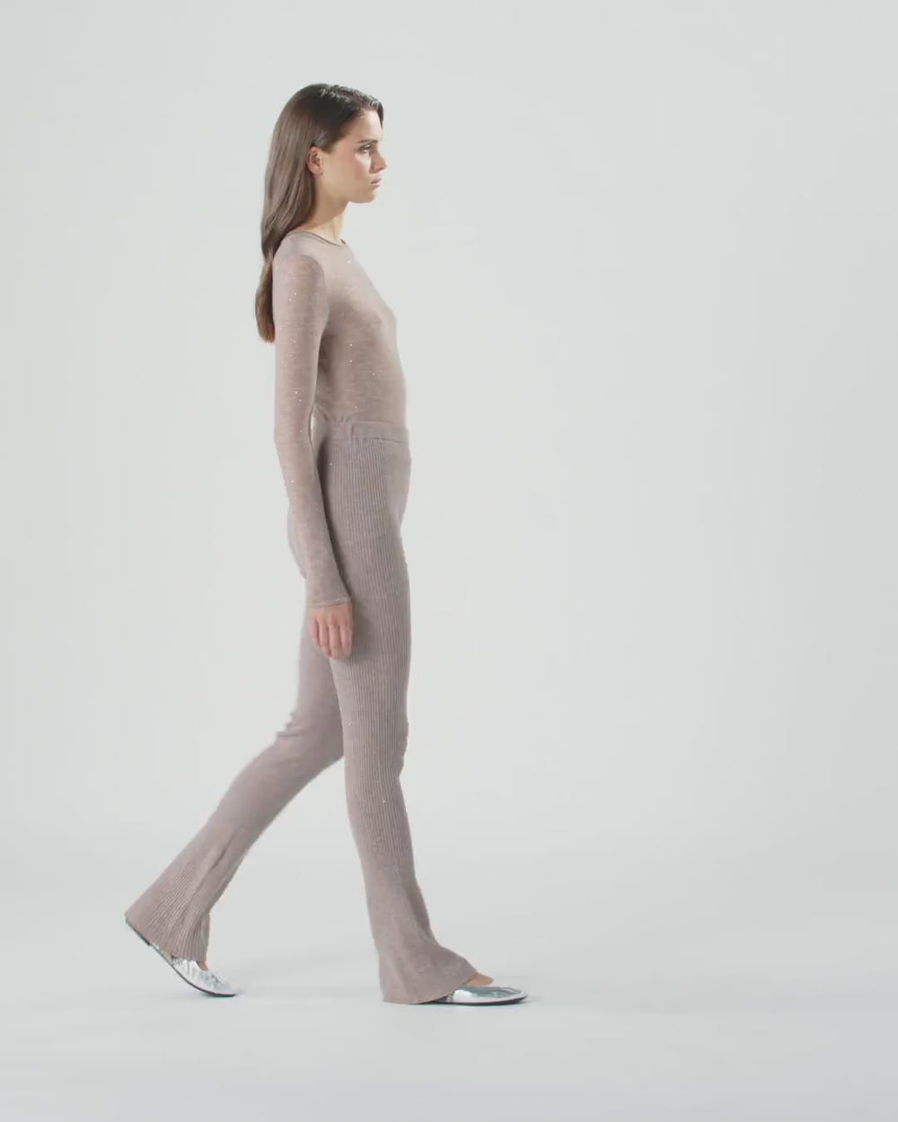 Crew-neck sweater made from a semi-sheer wool blend: a lightweight and soft yarn that is almost impalpable, which helps create a sensual and striking look. The design is embellished with micro-sequins inserted in the thread and manages to be shiny and understated and extremely comfortable to wear. The piece has undergone finishing tests to minimise the possible formation of pilling, ensuring greater fabric softness and durability. The final touch is given by the label with PINKO lettering logo on the back.