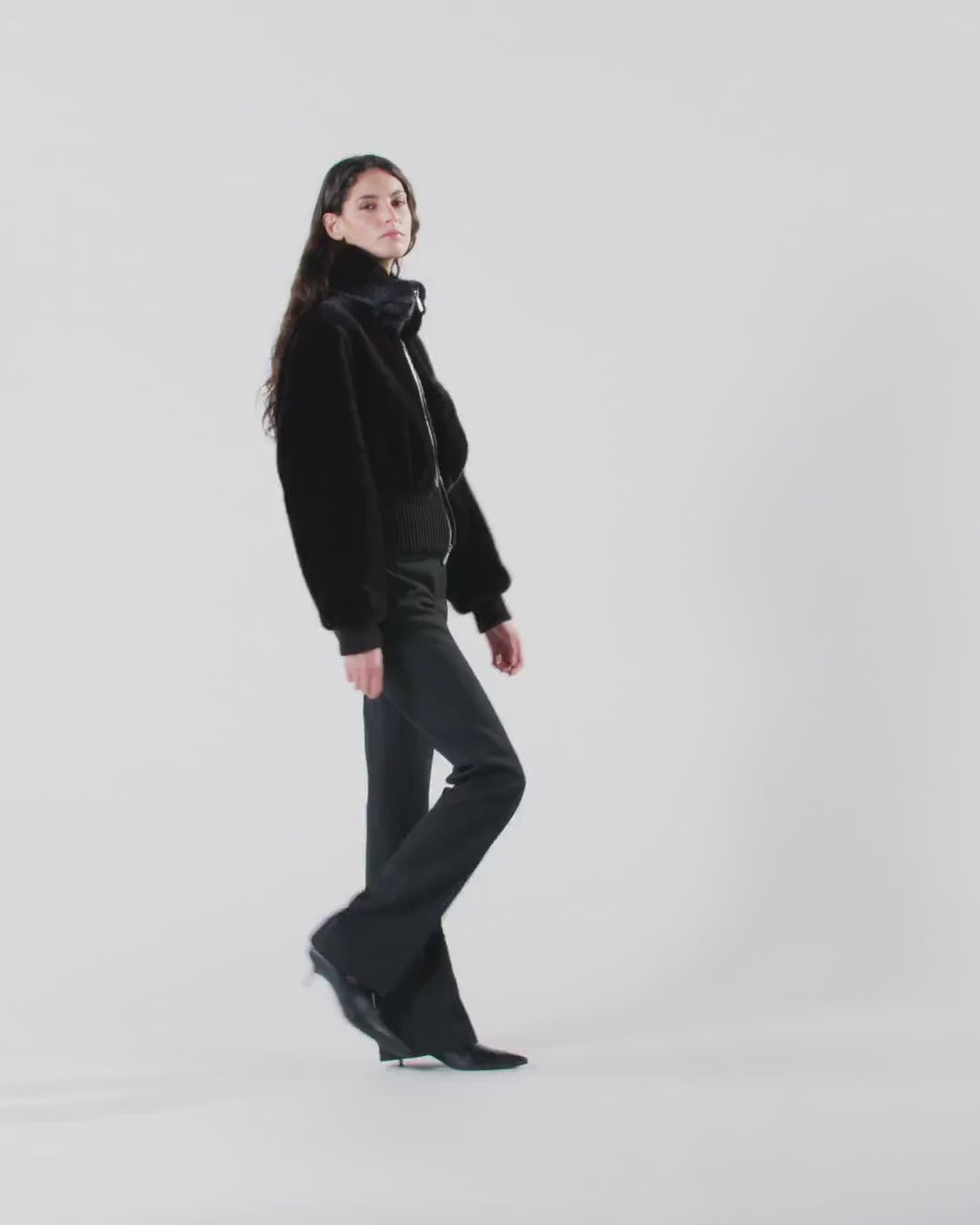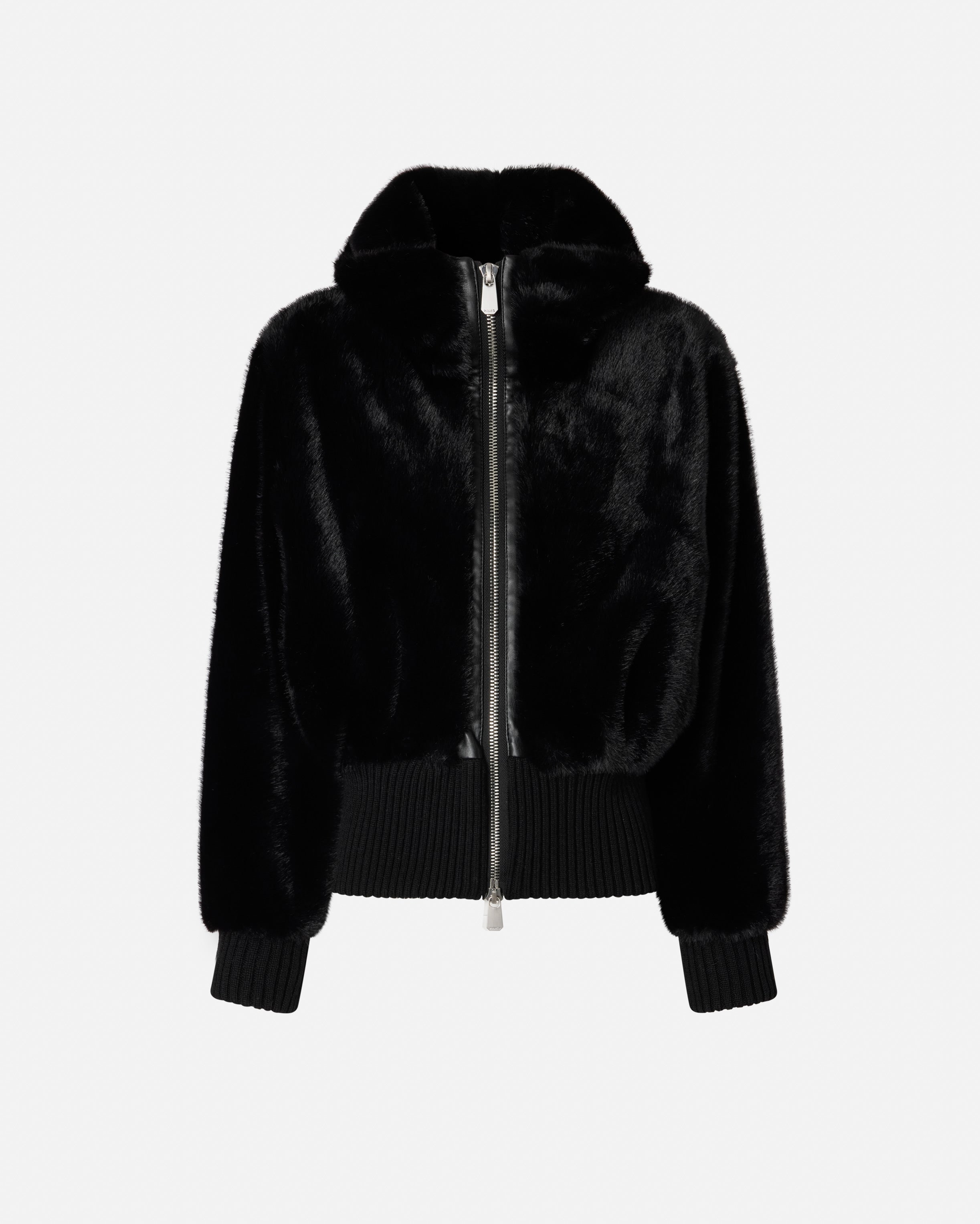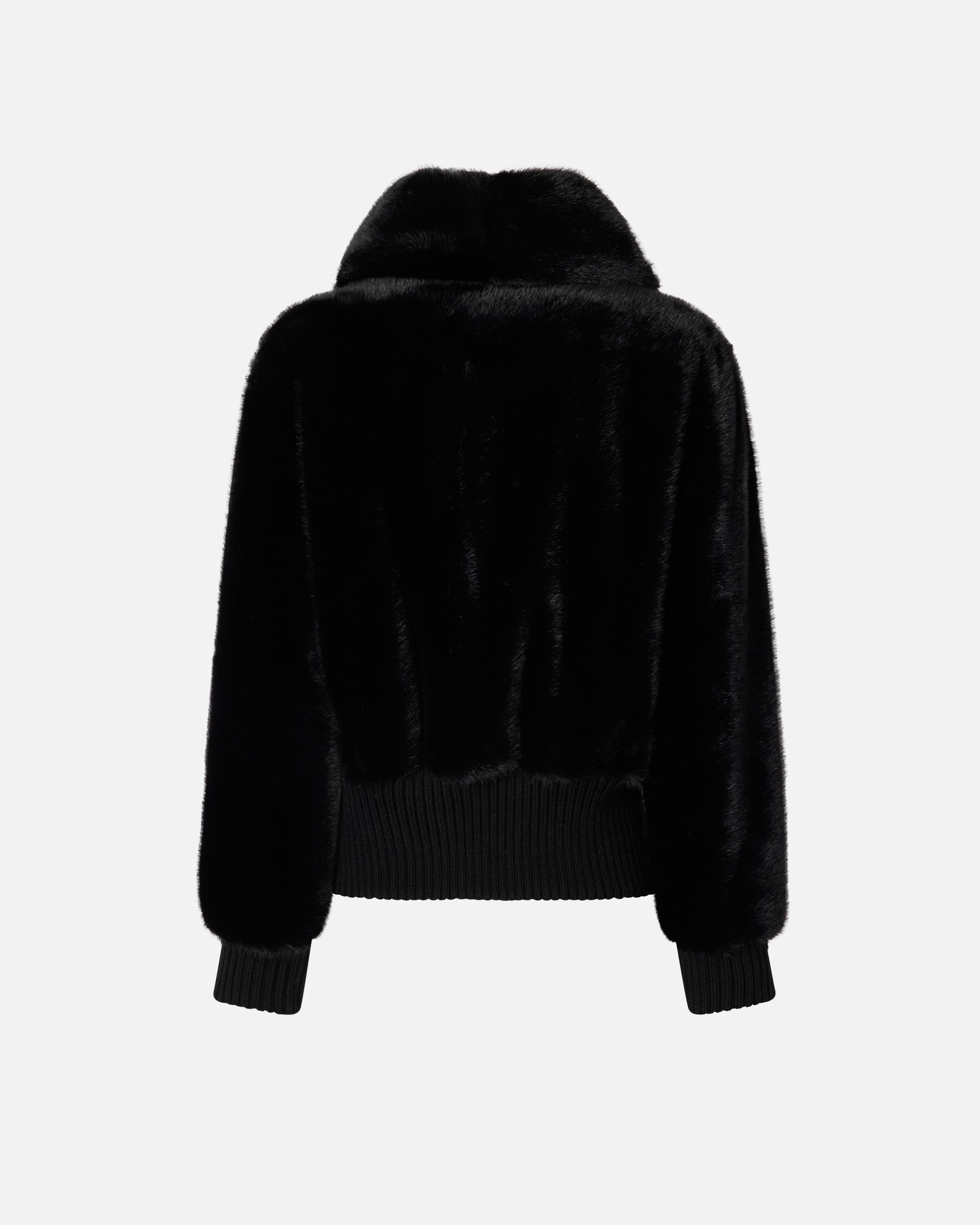 Short bomber jacket featuring a wraparound raised collar and a comfortable rib-knit hem and cuffs. This piece is made from soft Aspen fabric with a fur effect, which is particularly pleasant to the touch. The attention to detail typical of PINKO creations can also be seen in the soft nappa leather trims that outline the two-way zip fastening on the front. Lined model. Face the coldest temperatures with this garment that is ready to give you a soft hug.