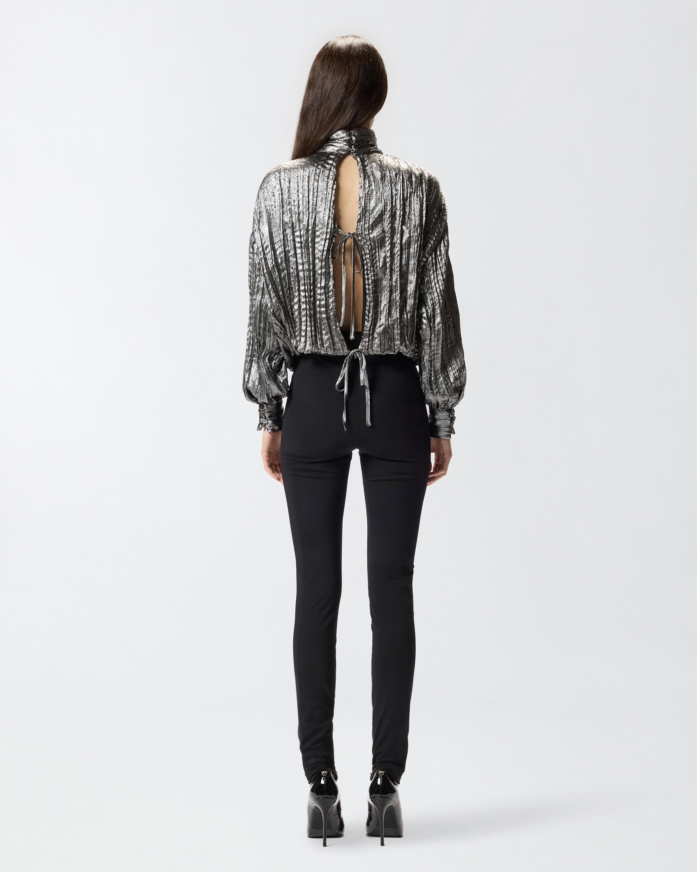 Long-sleeved blouse with high neck, made from metallic-effect fabric processed to create a crinkled look. The balloon sleeves and pleating give the piece a dynamic edge, while the ties that form two cut-outs on the back lend a sensual touch. Make your evening looks shine with this simple yet refined piece.