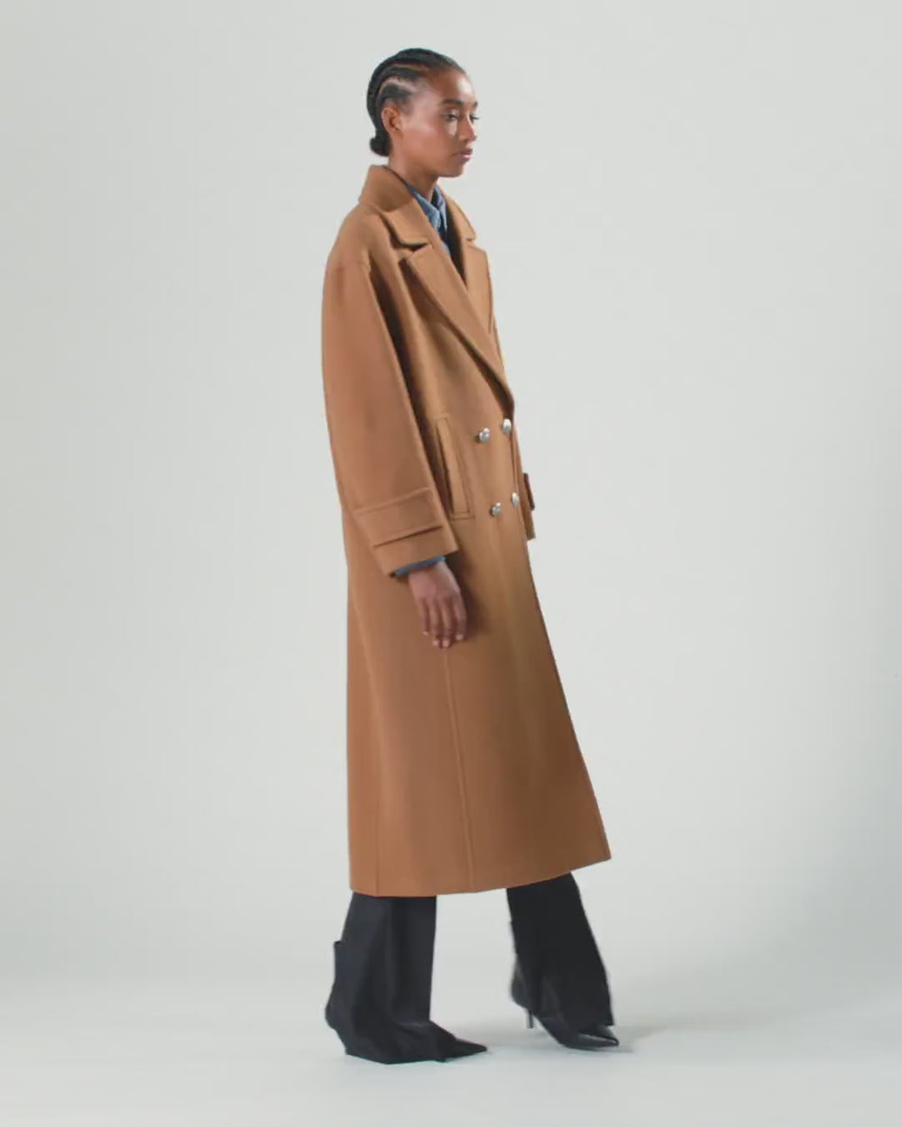 Lined long wool-blend cloth coat, featuring a lapel collar with wide lapels and a long vent on the back. The long set-in sleeves have cuffs finished with decorative buttoned straps. Double-breasted fastening with star-decorated metal buttons. The minimalist design gives the garment timeless elegance.
