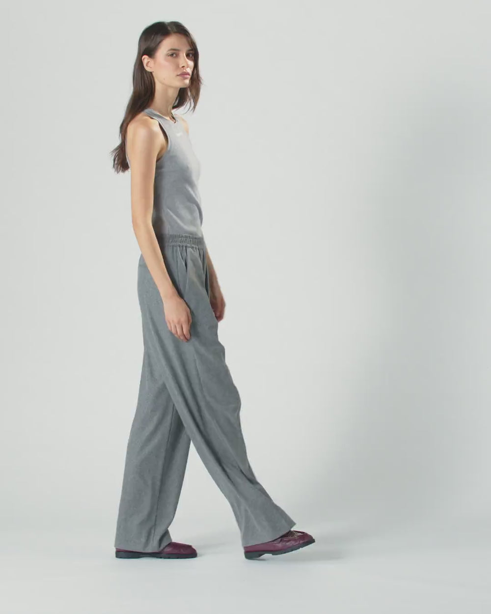 Long trousers made of yarn-dyed wool-blend jersey flannel, a fabric perfect for combining tailoring and comfort, and featuring a wide-leg silhouette with flared leg at the hem. The style combines sartorial style in the details of the rear welt pockets and the typical French pocket, with the sporty comfort of the gathered waist with elastic. Wide-leg trousers are the new must-haves of formal and elegant looks, whether for broken looks or for a new suit concept.