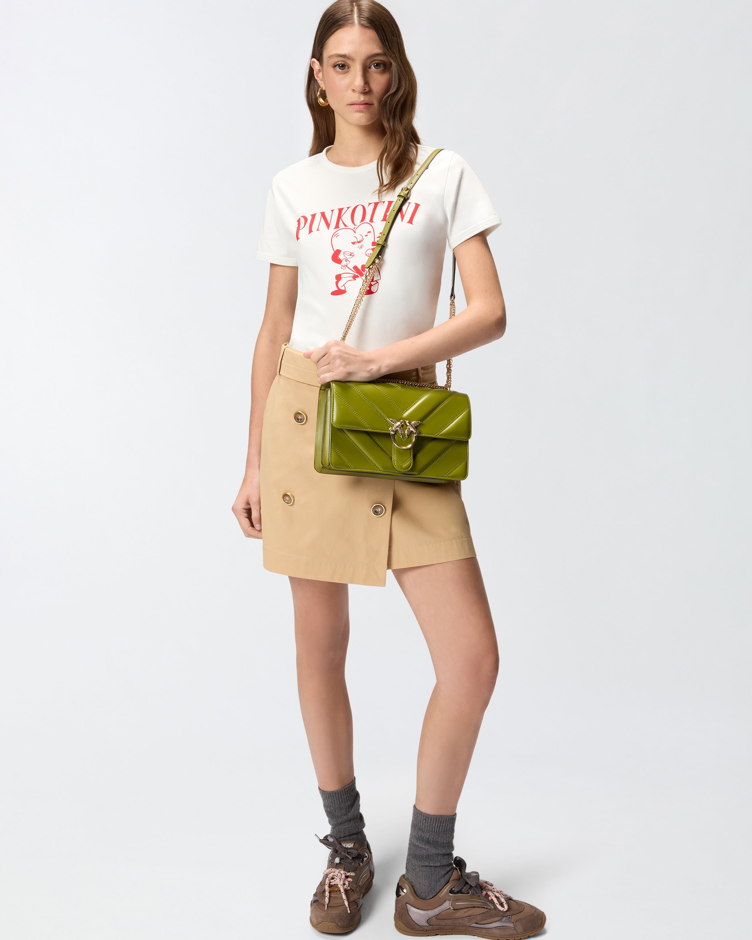 The Love Bag One medium-sized handbag features a chevron design that alternates between soft, silky leather inserts and nappa leather inserts, creating a slightly puffy, quilted effect. The style features a magnetic button fastening complemented by the iconic Love Birds Diamond Cut buckle, and is enhanced with a shoulder strap combining a coordinated leather pad and triple chain: one with a rounded wire, one with rectangular links, and one with small round links, creating a final effect that fully reflects the brand’s creative flair. The interior, lined in cotton drill, features a zipped centre pocket that divides the bag into two compartments. Activate your PINKO bag: verify the authenticity of your product and access a personalised experience by scanning the Love Birds embroidery on the back of the bag with your smartphone! - LOVE ONE CLASSIC TRIPLE CHAIN