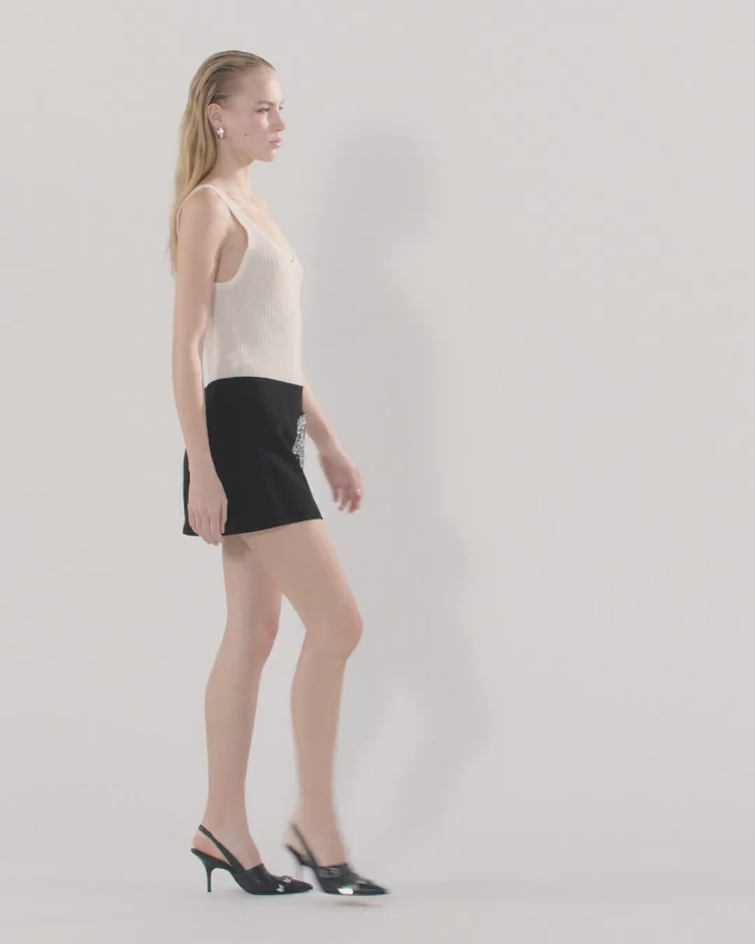 Slim-fitting mini skirt in compact-feeling stretch viscose fabric, perfect for providing a naturally enveloping feel. This model, featuring convenient zip fastening at the back, is made special by the appliqué on the front: a delicate, skilfully hand-embroidered tulle rose with three-dimensional effect, embellished with crystals of different shapes and sizes to elegantly reflect light. Ideal for a special evening or an exclusive party, this exquisite, feminine garment will make you the undisputed queen of the party. - CAVOLFIORE SKIRT