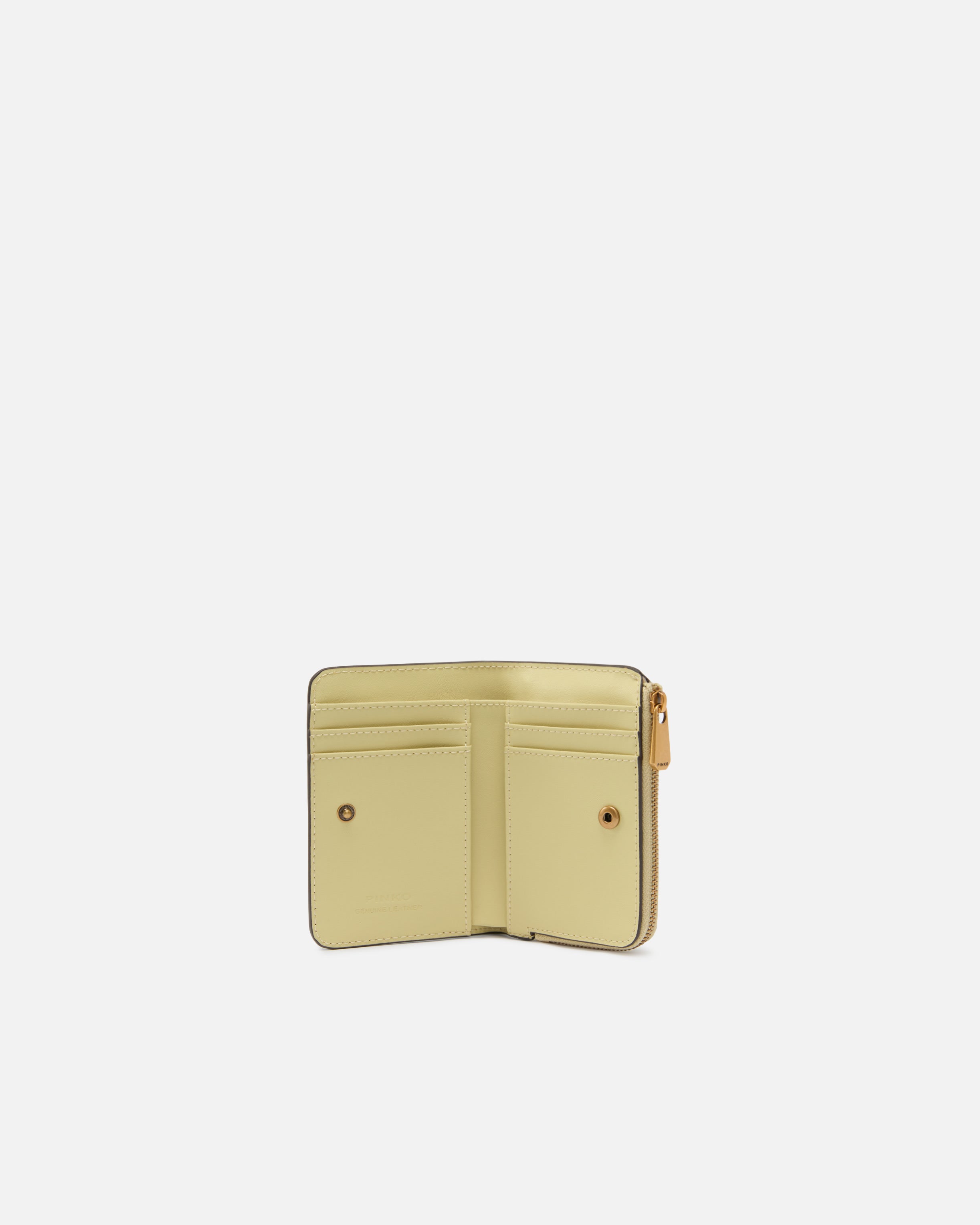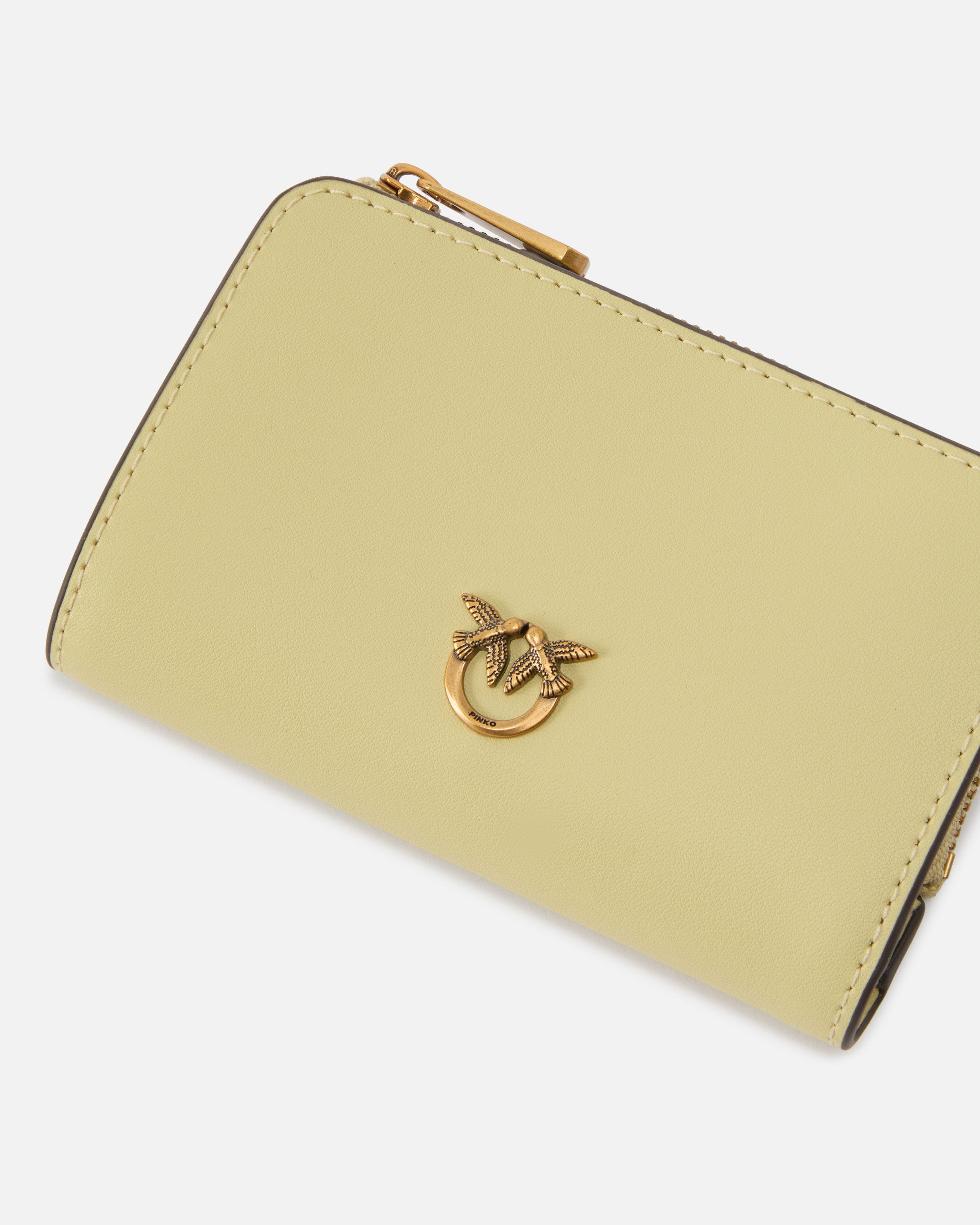 Compact and multifunctional small rectangular wallet in soft, silky leather with a smooth texture. Inside, the accessory is well organised with several slots for cards and documents, while the outside features a a zippered coin compartment and is customised with a metal plaque sporting the iconic Love Birds Diamond Cut logo. Fastened with an inner button to maintain its compact shape, this wallet is ideal for even the smallest bags. Activate your PINKO accessory: verify the authenticity of your product and access a personalised experience by scanning the Love Birds embroidery on the back with your smartphone! - MINI WALLET