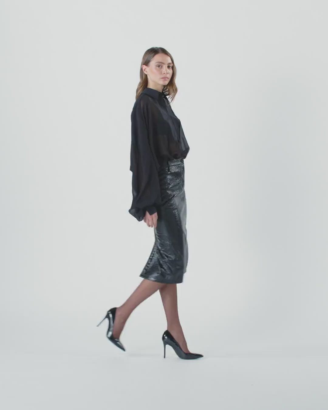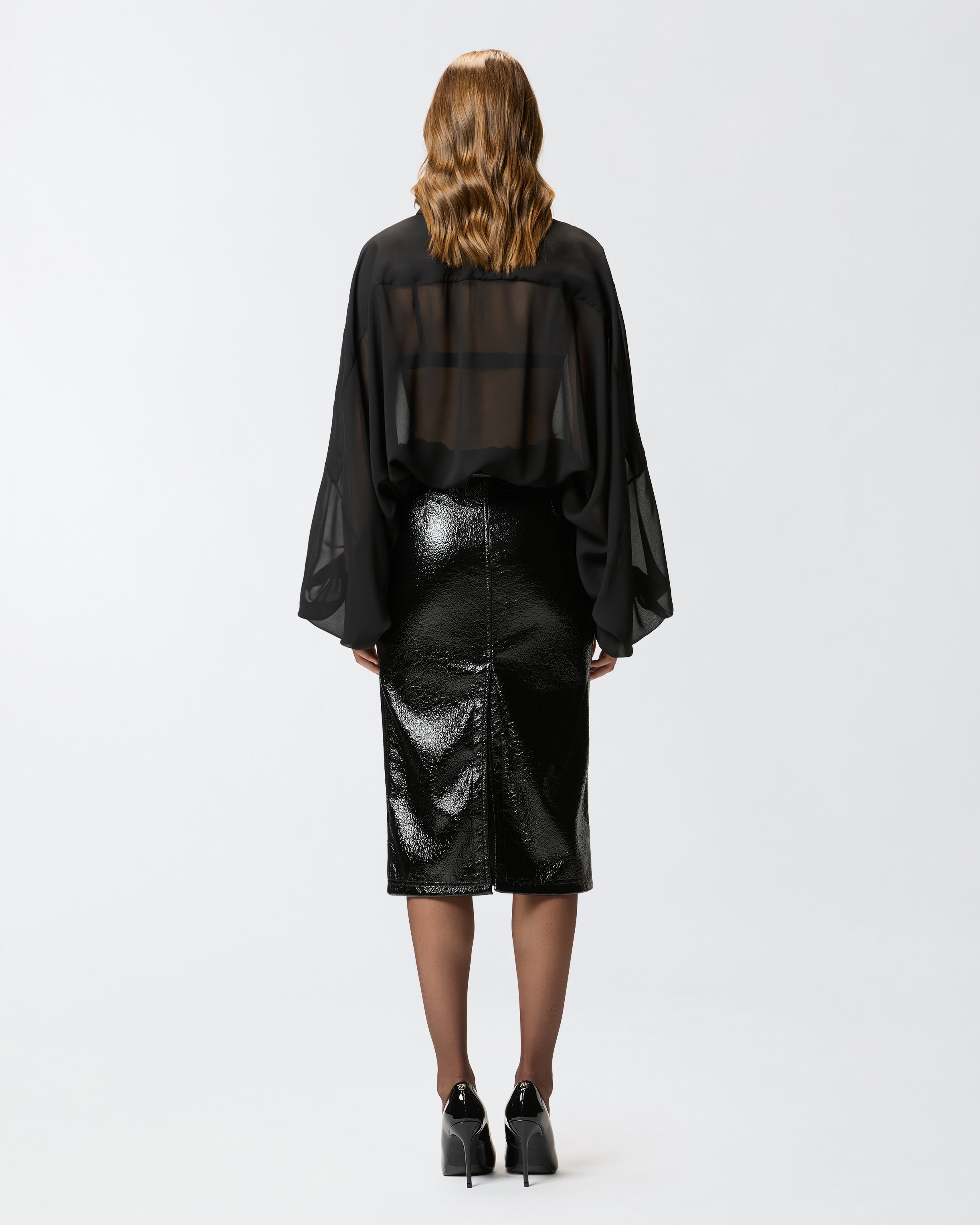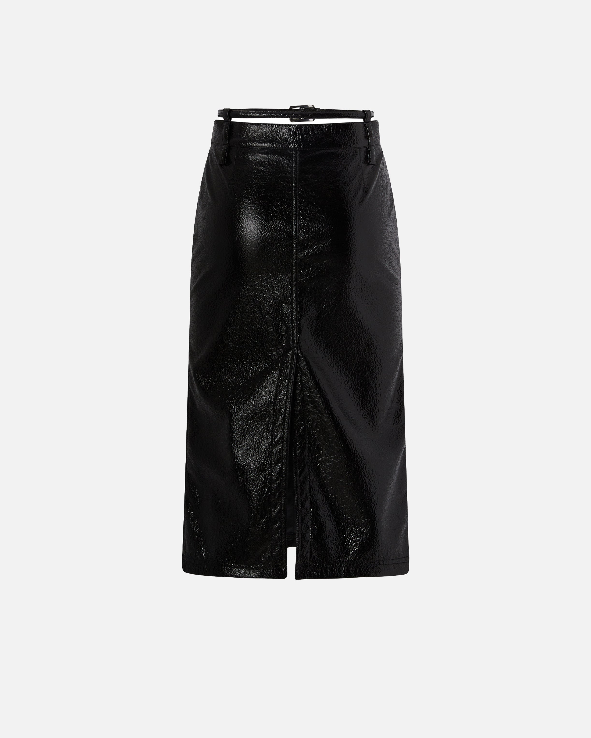 Straight-cut calf-length skirt with rear slit, made from comfortable jersey with a warm feel and patent leather-effect coating. The most interesting part of this piece, complete with practical button and zip fastening at the front, are the ring loops at the waist that allow you to wear a removable skinny belt directly on the skin. Express your femininity in a bold, original way by wearing this garment as part of a biker-style evening look.