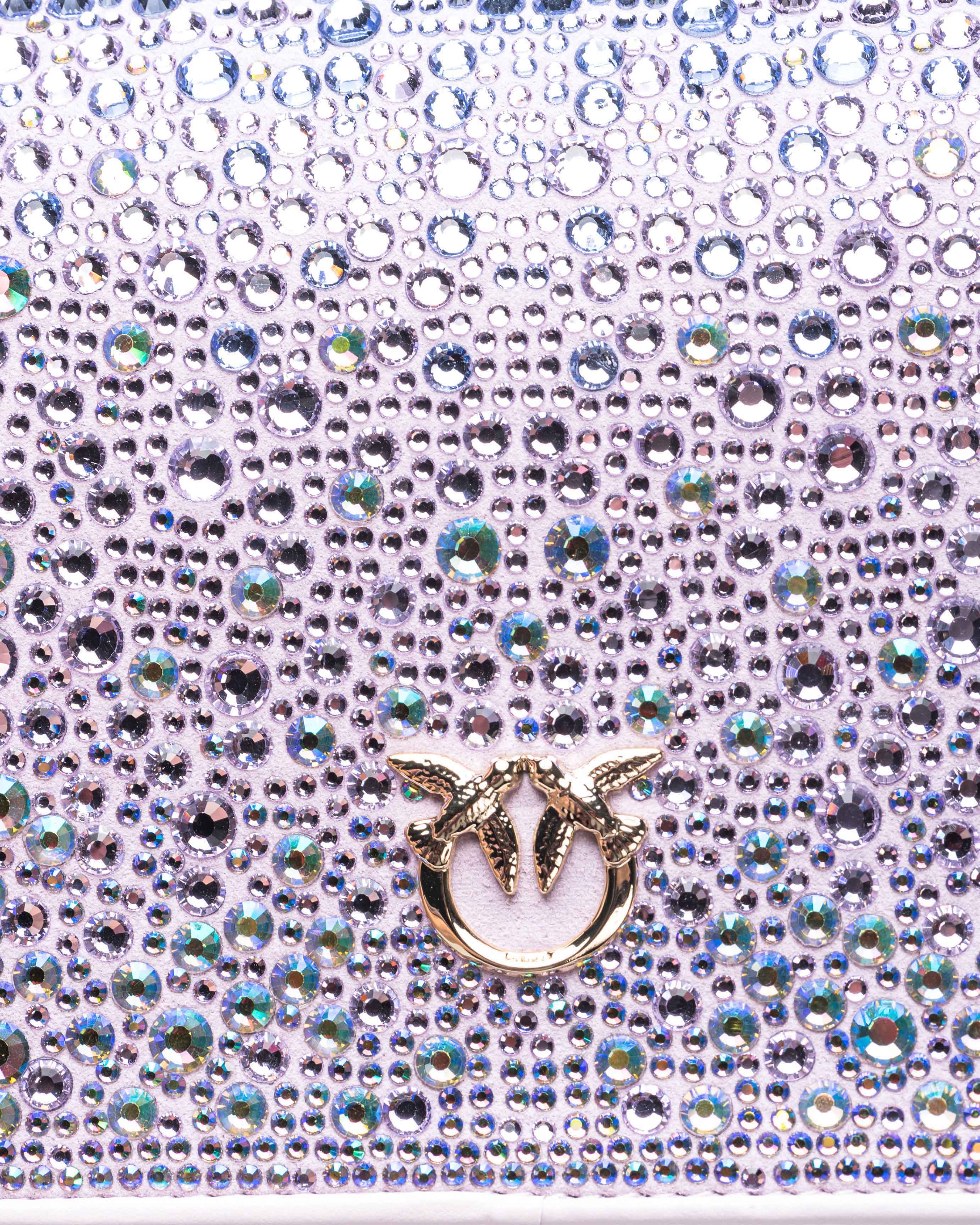 Mini Love Bag Click comprising imperfection-concealing brushed leather, in addition to suede which boasts a placed distinctive nuance, in line with the design created specifically by the PINKO team. All-over heat-transferred crystal appliqués: these comprise Europe-sourced round crystals with 8 ultra-bright facets, affixed in a secure and long-lasting way by means of the provided glue. The crystals - which come in four different sizes - are positioned, covered with a tissue and heat-pressed for several minutes. The concealed press-stud fastening is embellished by the iconic metal Love Birds Diamond Cut buckle with cut-out effect. The shoulder strap combines the classic round-link chain with practical leather shoulder padding. The bag is part of the Limited Edition special capsule collection which comprises PINKO Galleria-exclusive limited-edition models. Use the special NFC chip to enjoy a special experience, specific to the bag you have just bagged!