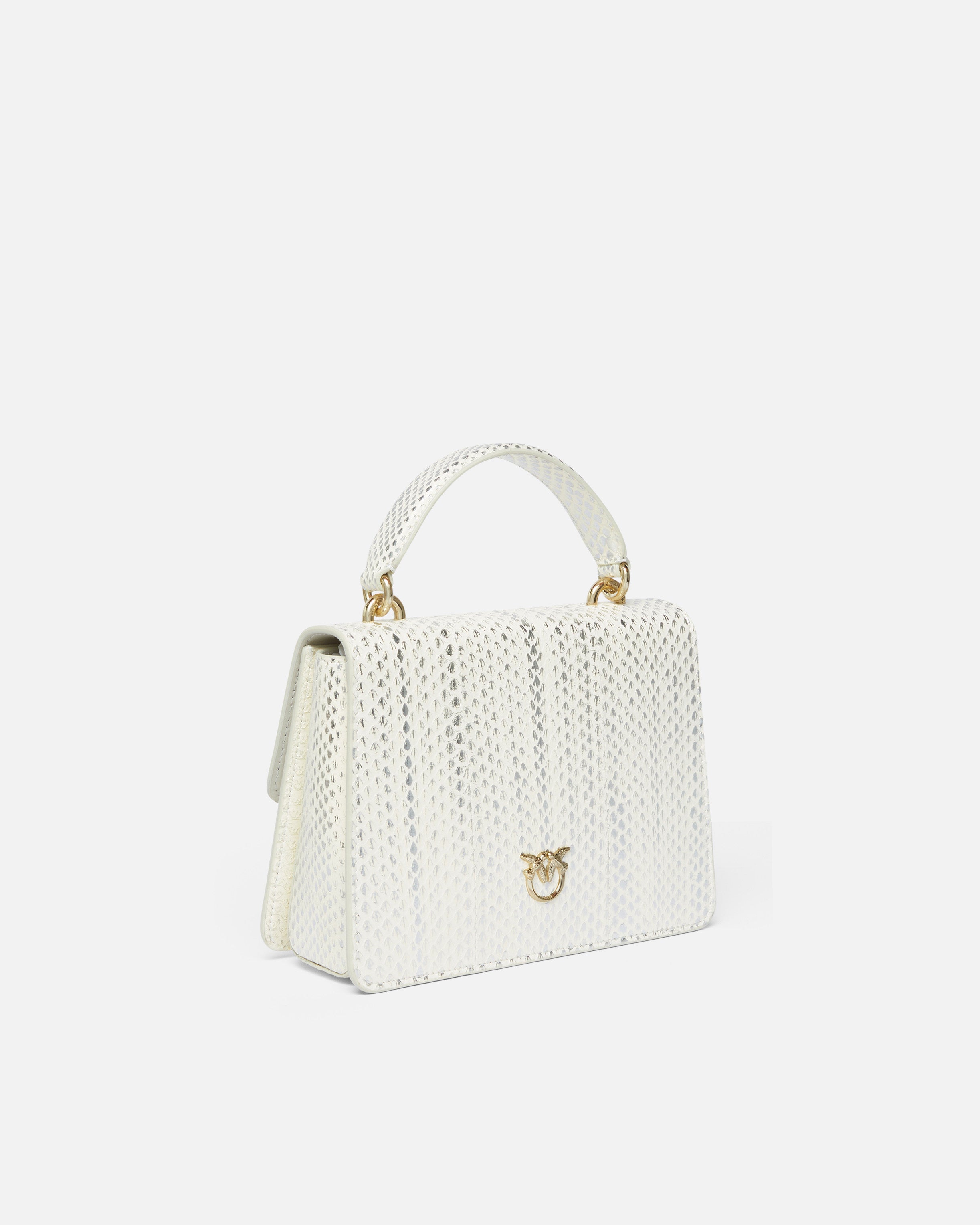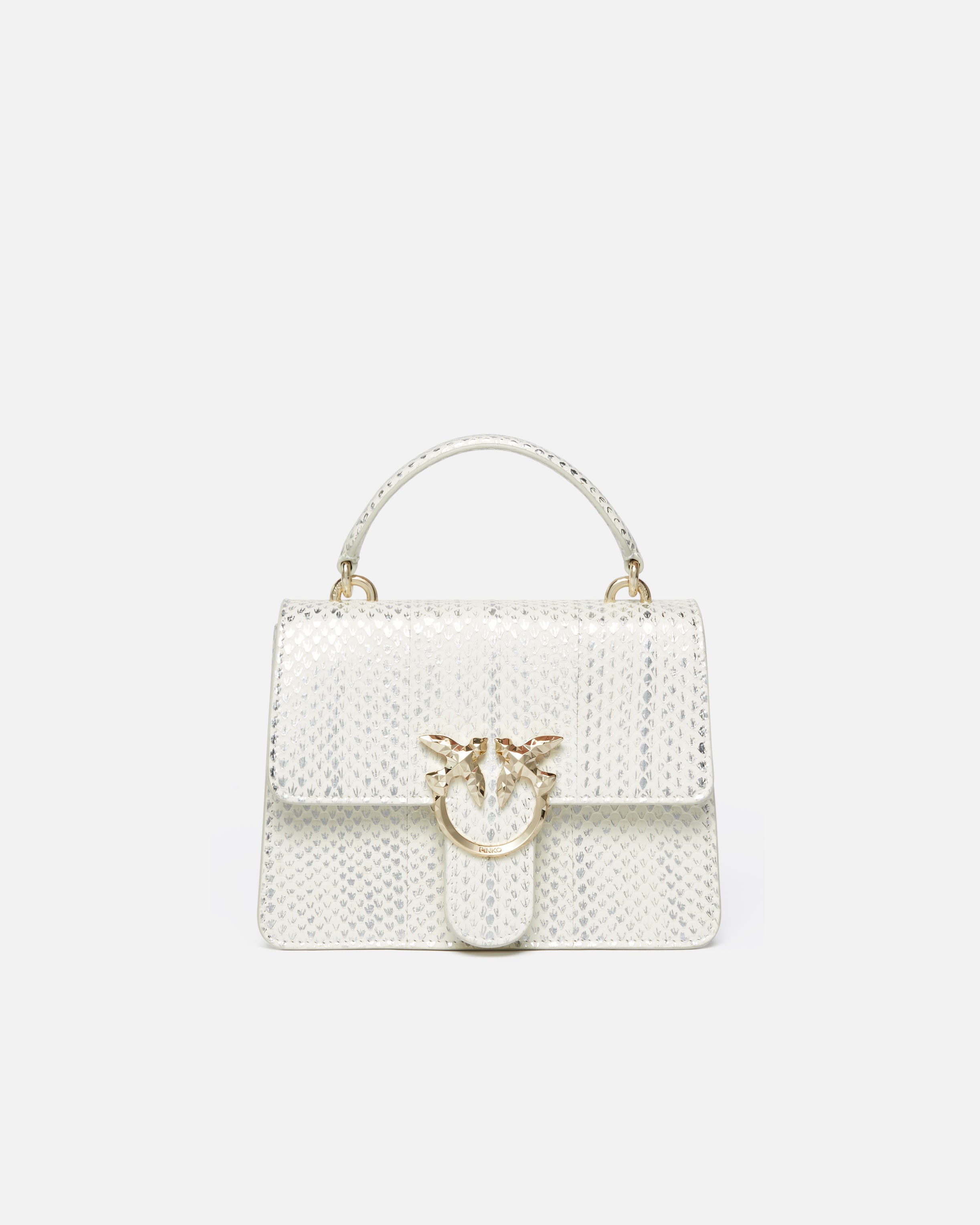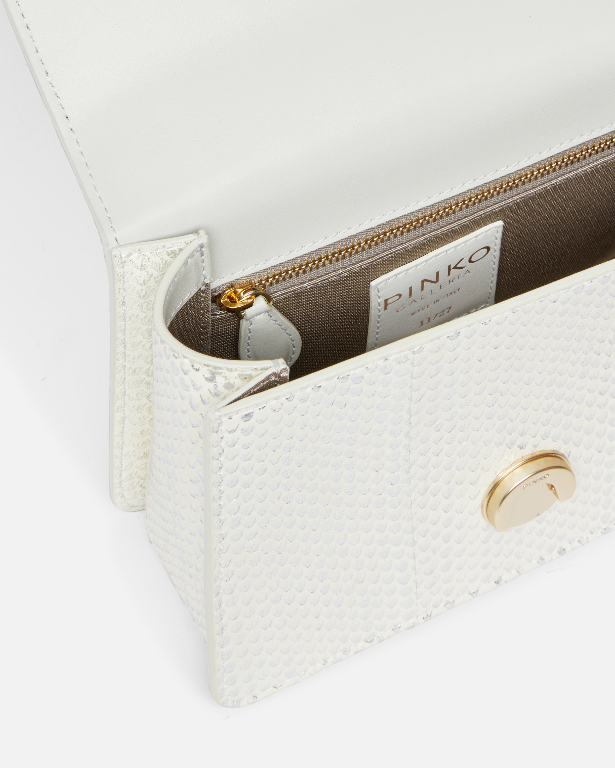 Small crossbody bag crafted from fine ayers reptile skin finished with a vintage laminated effect. This trapezium-shaped handbag features a semi-rigid structure, with a top handle for hand carrying and a detachable shoulder strap that combines the classic metal chain with a practical, adjustable leather pad, so you can carry it two ways. Inside, the bag is lined in fabric and features a practical zipped slip pocket for a better organisation of the space. The magnetic flap fastening is complemented by the iconic metal Love Birds Diamond Cut buckle embellished with a distinctive faceted effect. The bag is part of the Limited Edition special capsule collection which comprises PINKO Galleria-exclusive limited-edition models. Use the special NFC chip to enjoy a special experience, specific to the bag you have just bagged!