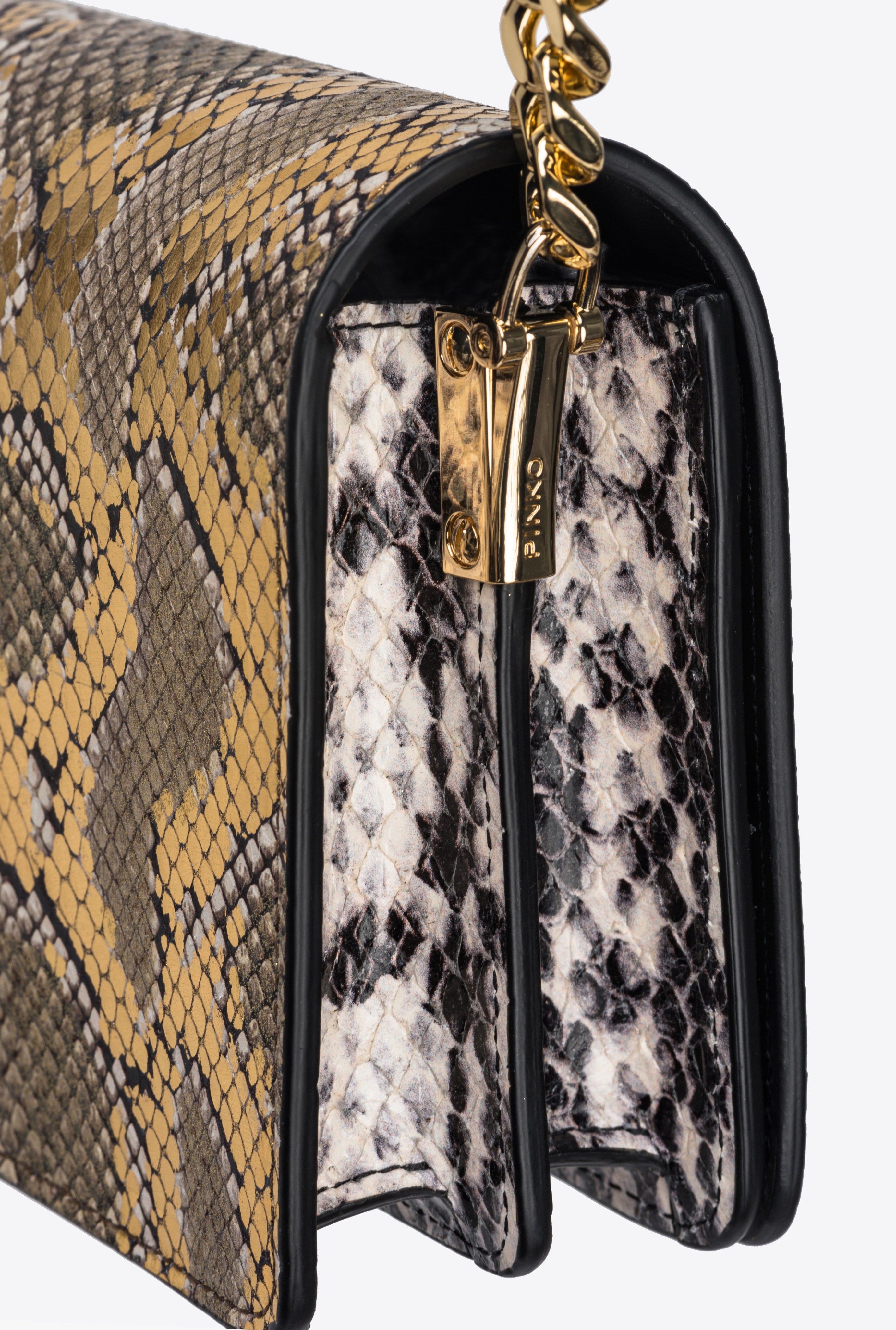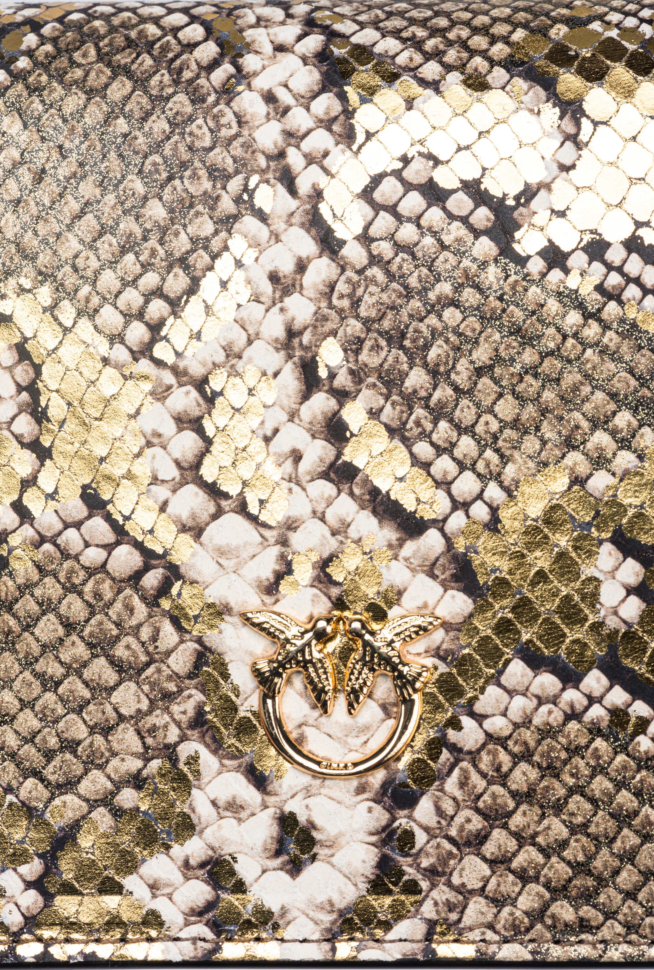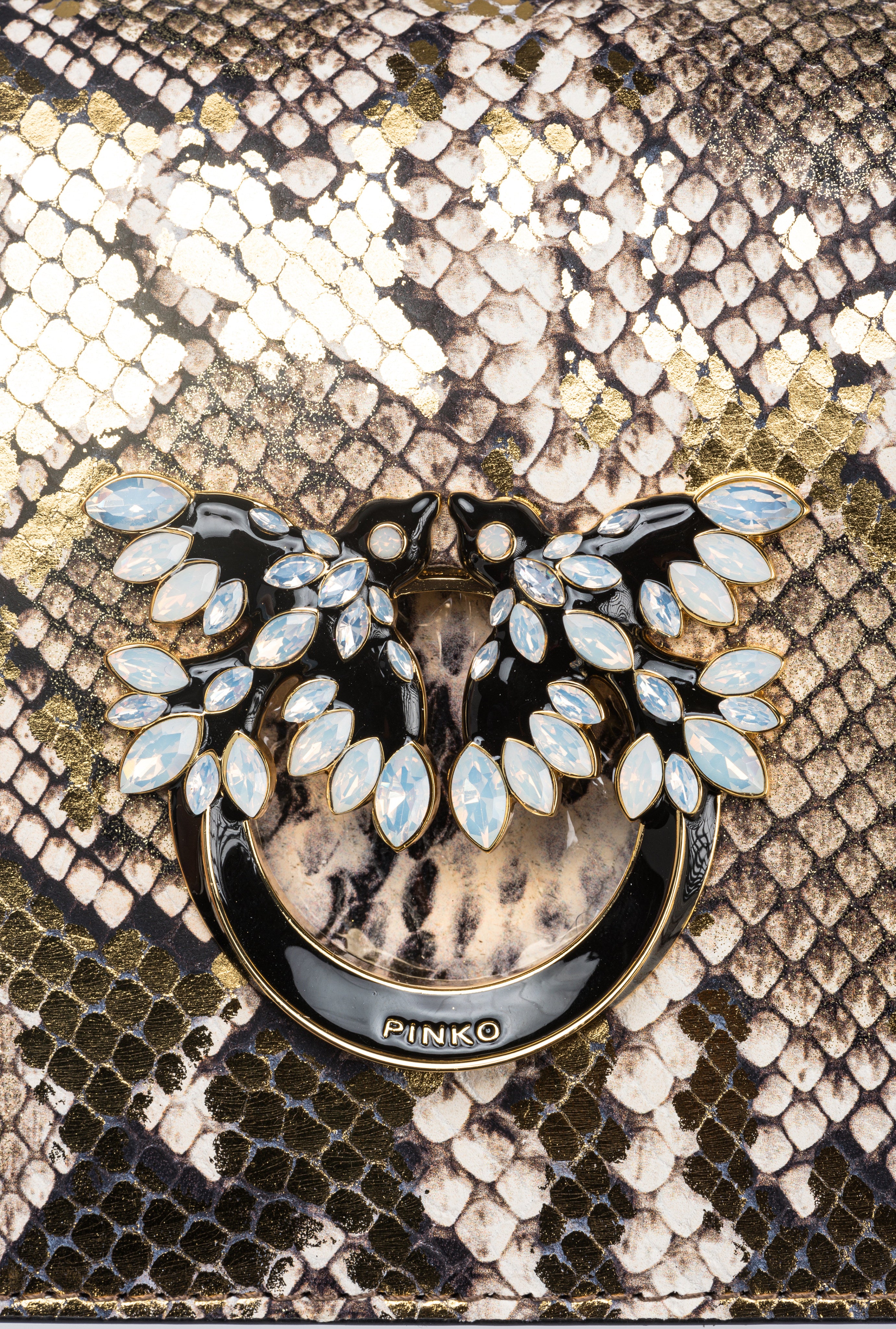 Mini Love Bag Click in reptile-print leather with a coated and laminated dual fabric-like effect. Overlaying the black and white python-print leather is a second layer of laminated golden python-print leather with glitter and black and white spots. The concealed press-stud fastening is enhanced by the iconic Love Birds Diamond Cut buckle—in gold-electroplated metal with black enamel—featuring a cut-out effect and opalescent white stones. Inside, it features contrasting lining, a slip pocket and a zipped divider pocket. The shoulder strap combines the classic round-link chain with a practical, adjustable leather pad. The bag is part of the Limited Edition special capsule collection which comprises PINKO Galleria-exclusive limited-edition models. Use the special NFC chip to enjoy a special experience, specific to the bag you have just bagged!