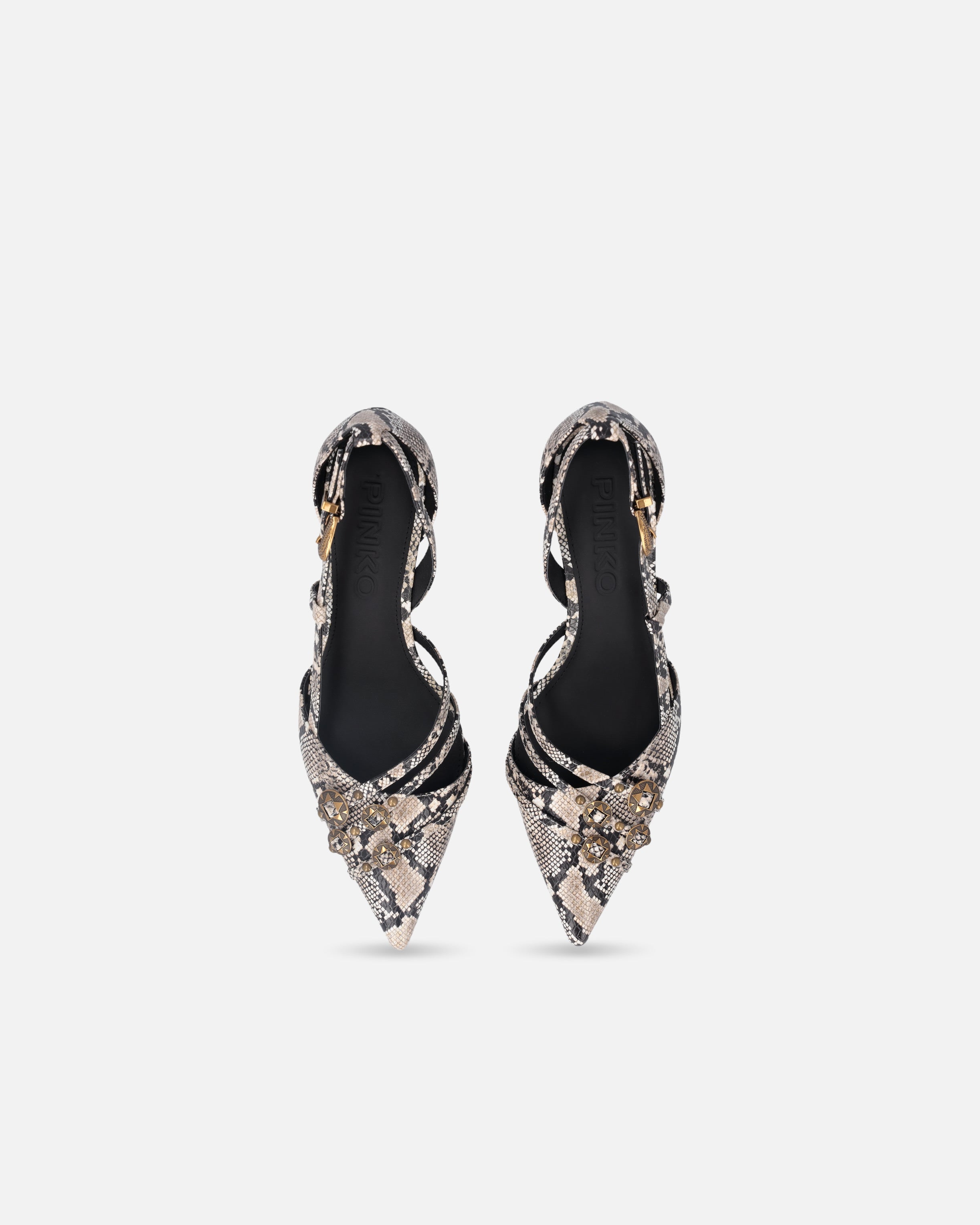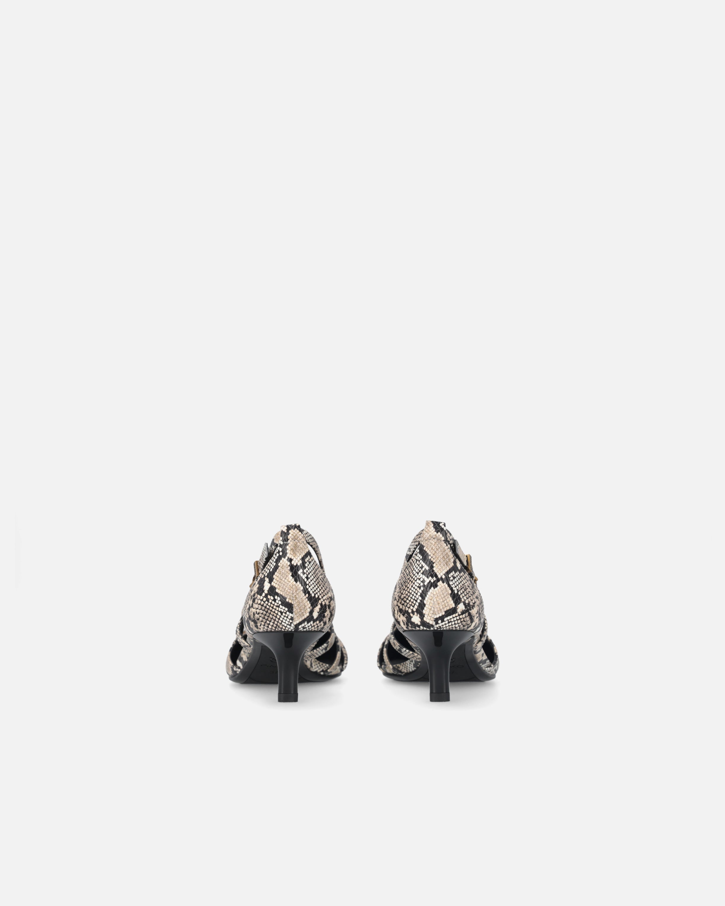 Low-heeled leather pumps with bold all-over python print. The tapered design with a pointed toe is accentuated by slender straps that delicately criss-cross over the foot, providing support and a touch of sensuality. The gold metal jewel buckle, finely decorated, adds a precious detail, while the studs on the front band give a rock-inspired, sophisticated allure. Ideal for formal looks, elegant evenings or to elevate a casual outfit with a bold, glamorous touch, these pumps are ready to win over animal-print lovers. - GLORIA 16
