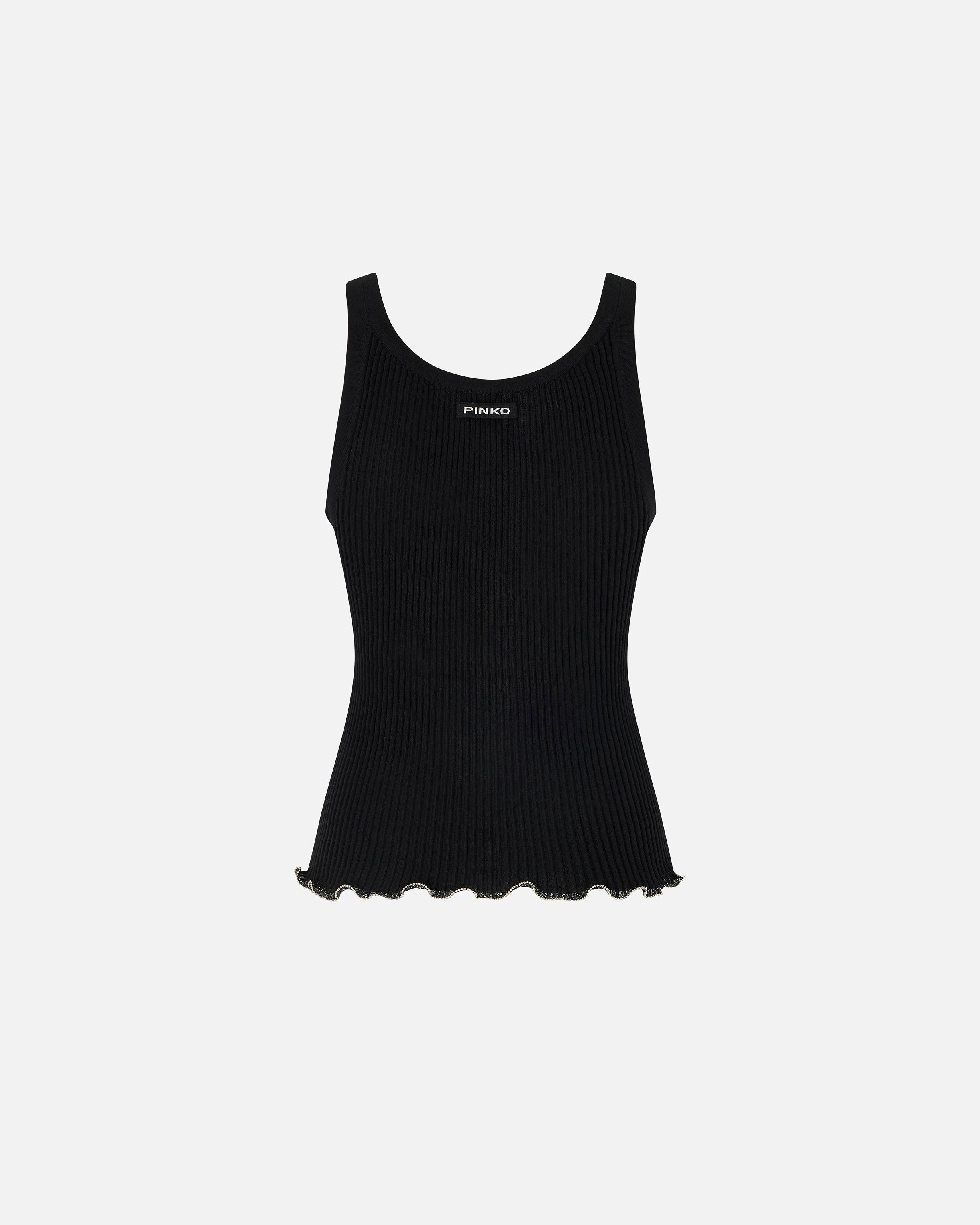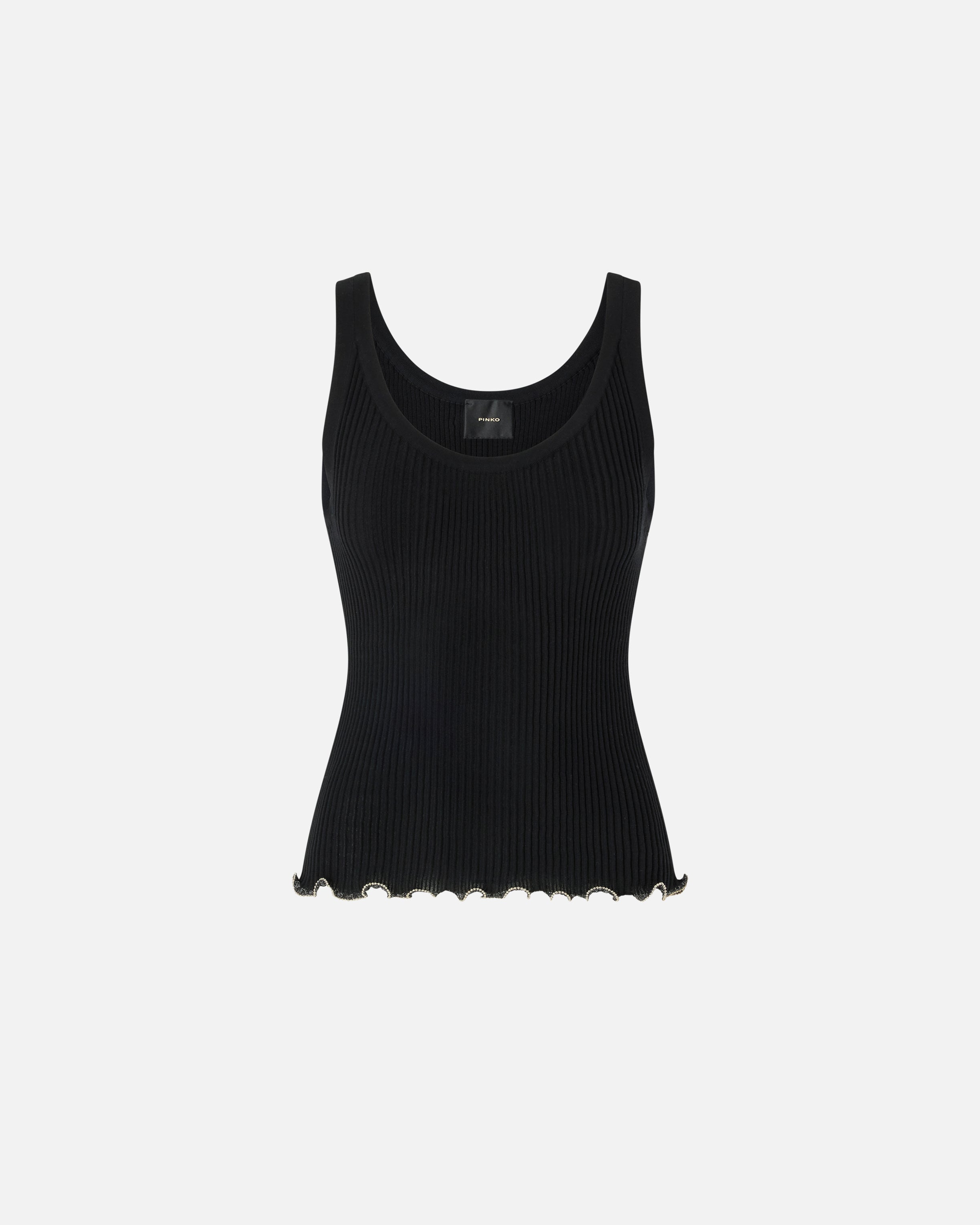 V-neck vest top in ribbed cotton-blend crepe. This garment features a gathered bottom hem embellished with small metallic spheres that create a refined interplay between the matte finish of the fabric and the sheen of the metal. The final touch is given by the label with PINKO logo lettering on the back. Pair this top with pieces in the same colour for a comfy and original head-to-toe look during your free time.