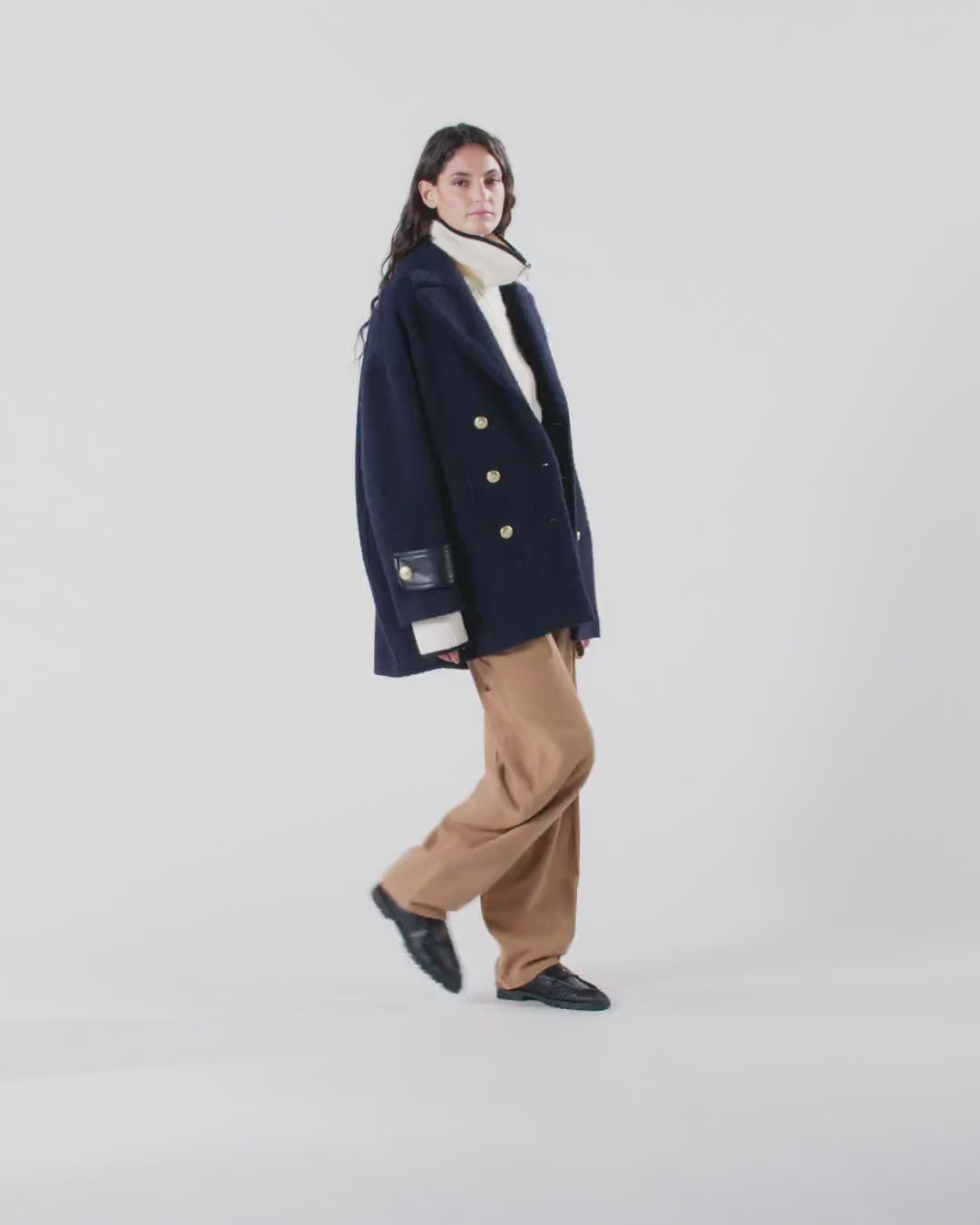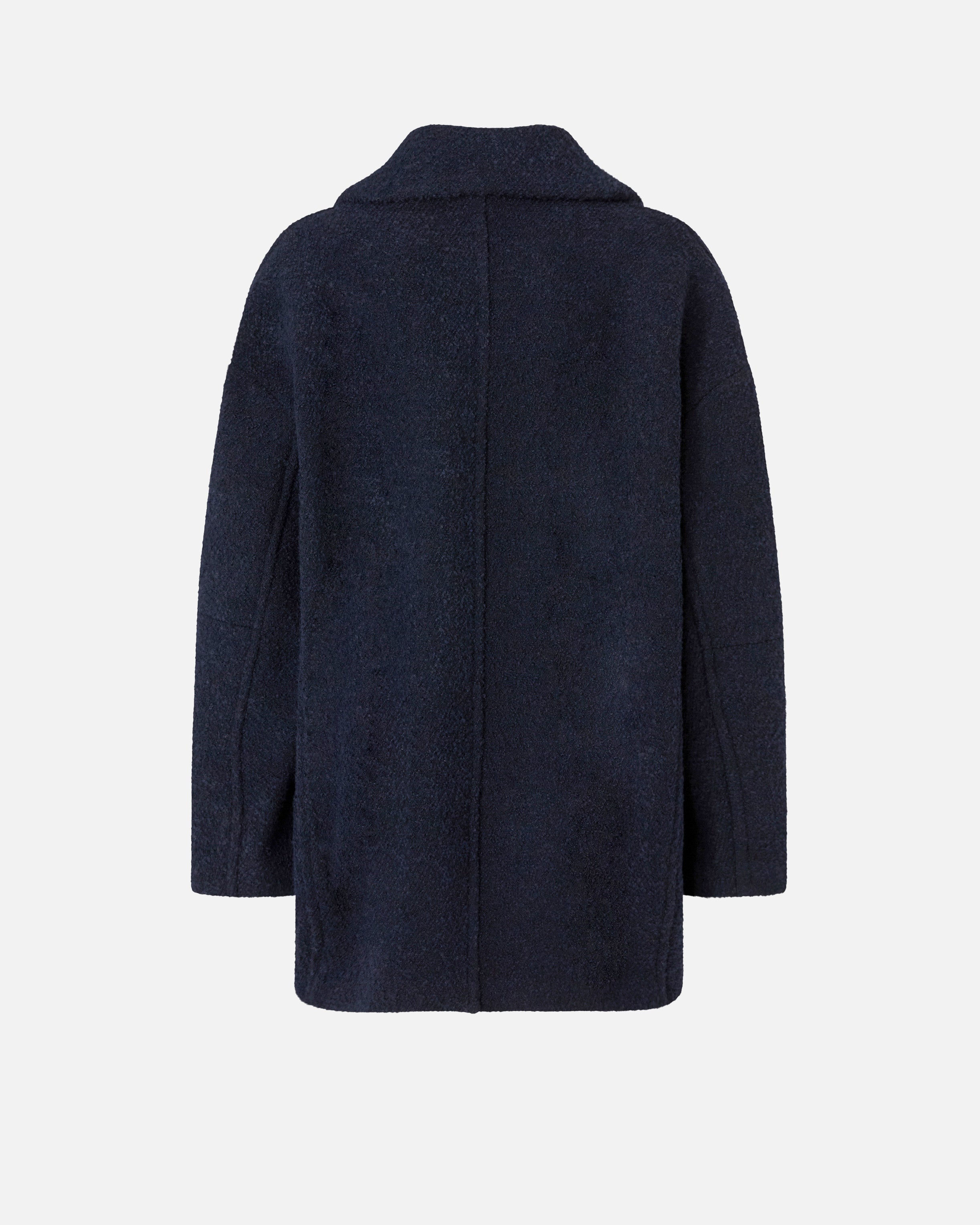 Short pea coat in diagonal-weave wool-blend bouclé fabric with coated fabric tab details on the cuffs. Lapel collar and vertical welt pockets on the front. Double-breasted fastening with star-decorated metal buttons. Wear this sailor-inspired garment for a comfortable look and timeless style.