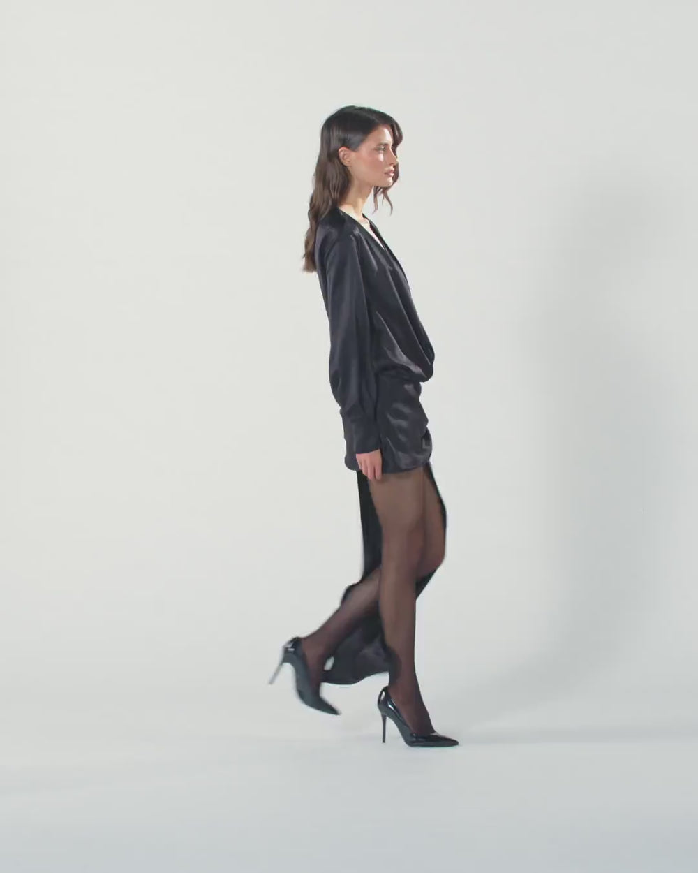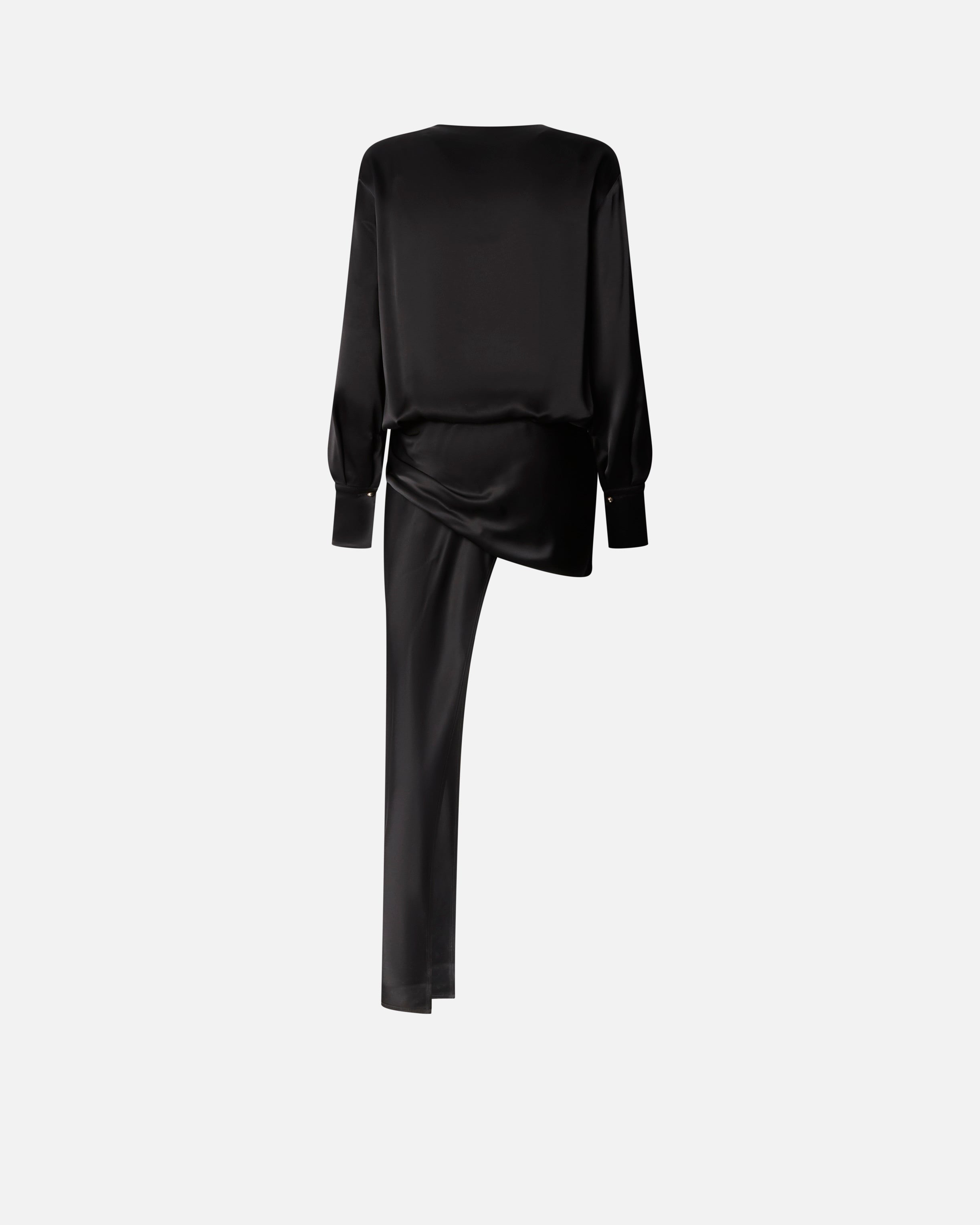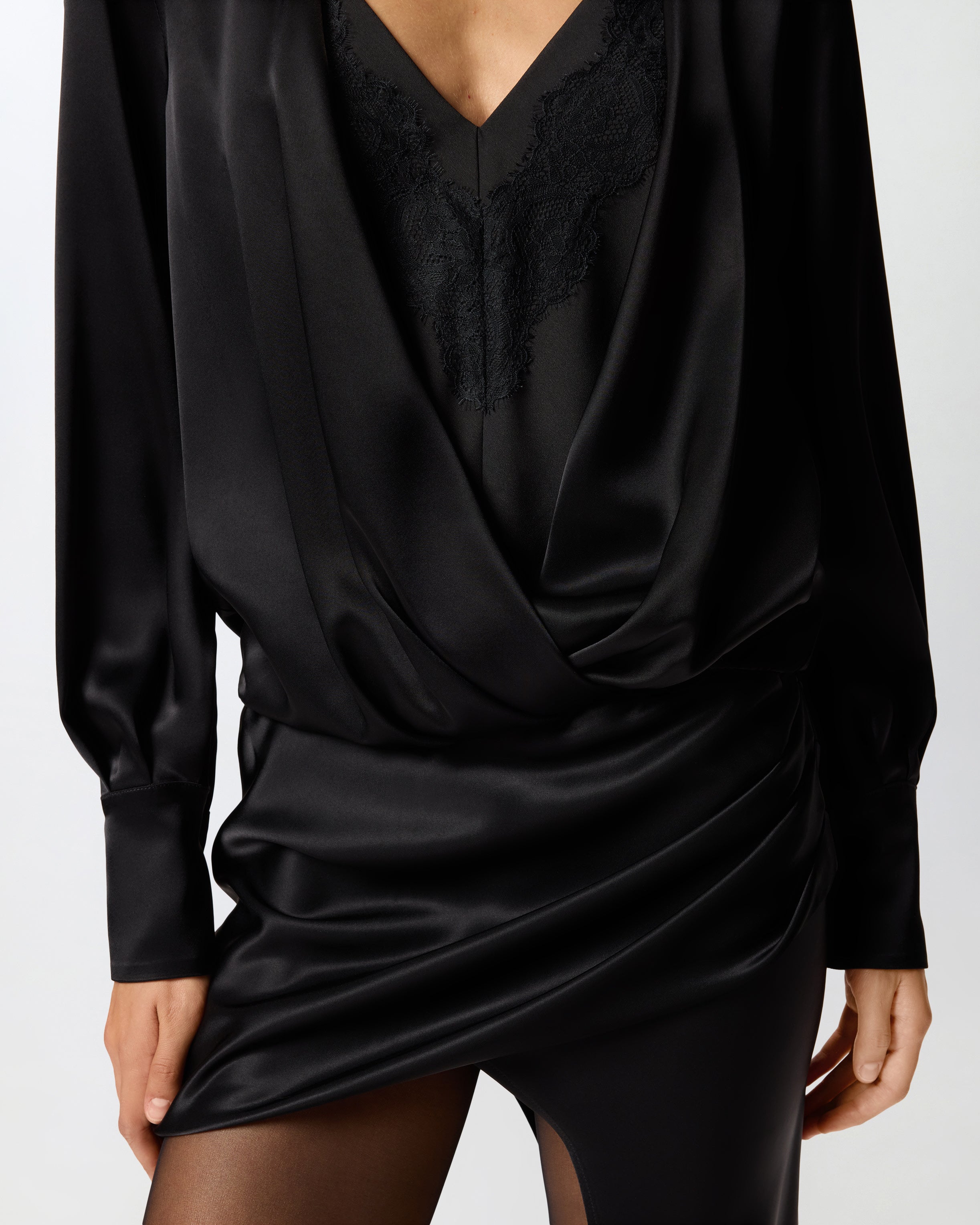 Short dress with a train on the side, an invisible side zip and gold-toned sphere button on the sleeves. The shiny satin gives the piece unique shimmer and a particularly soft hand. This piece is complemented by a touch of sensuality provided by the lingerie top with contrasting lace. Wear this design for a fluid, slinky effect that elegantly enhances the lines with sophistication and the feminine silhouette.