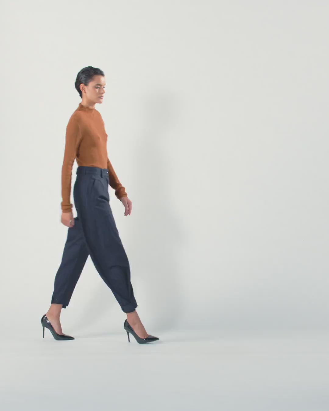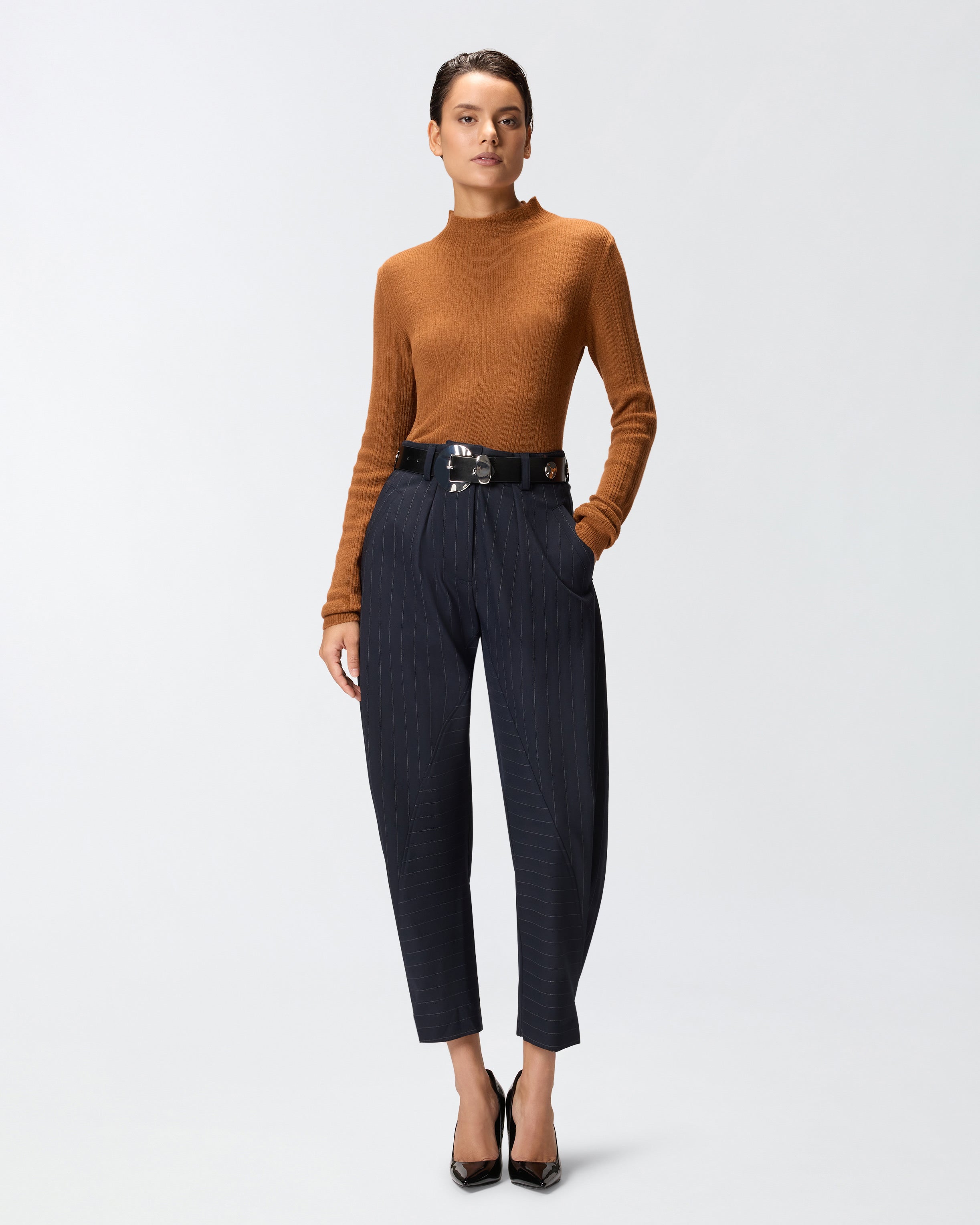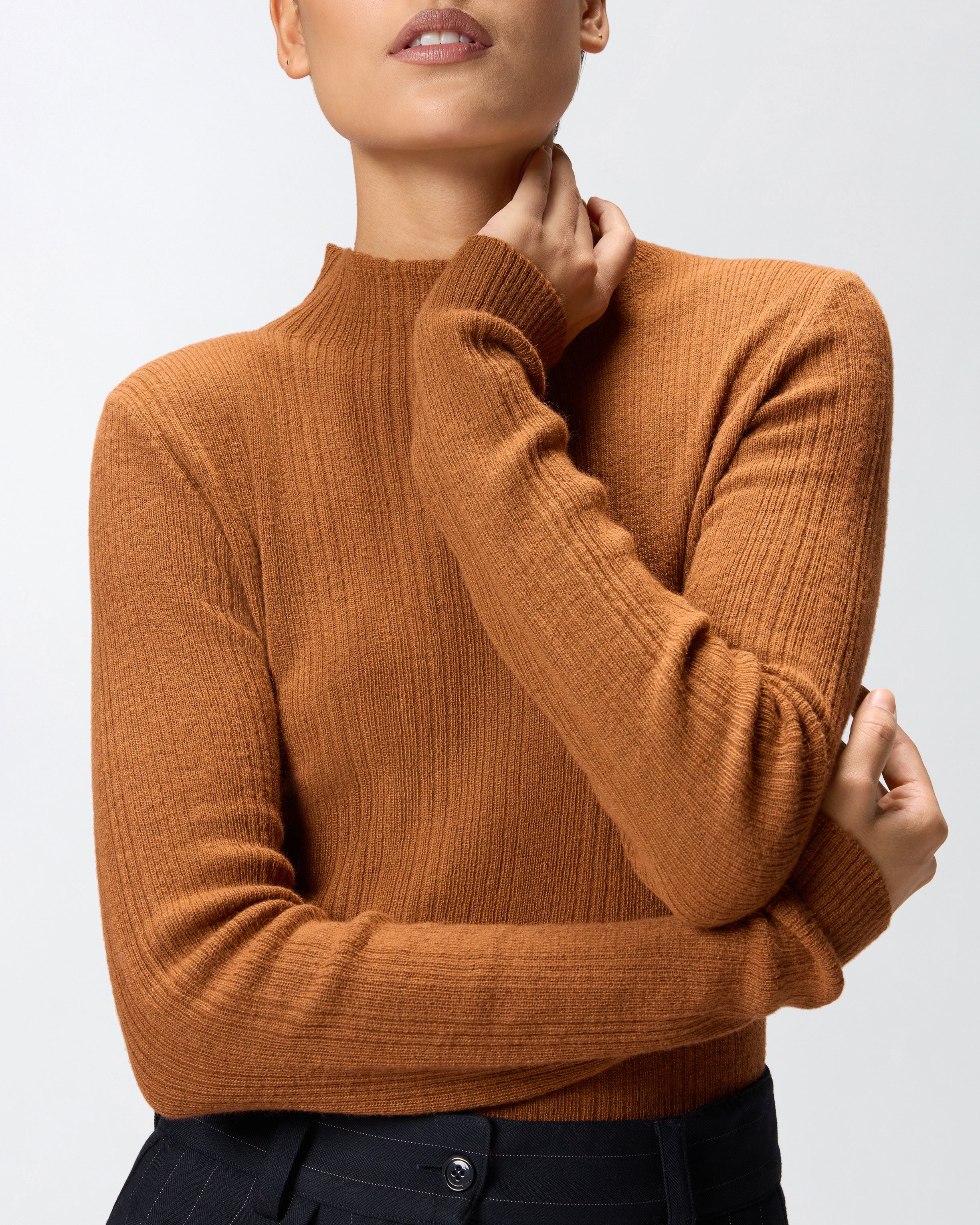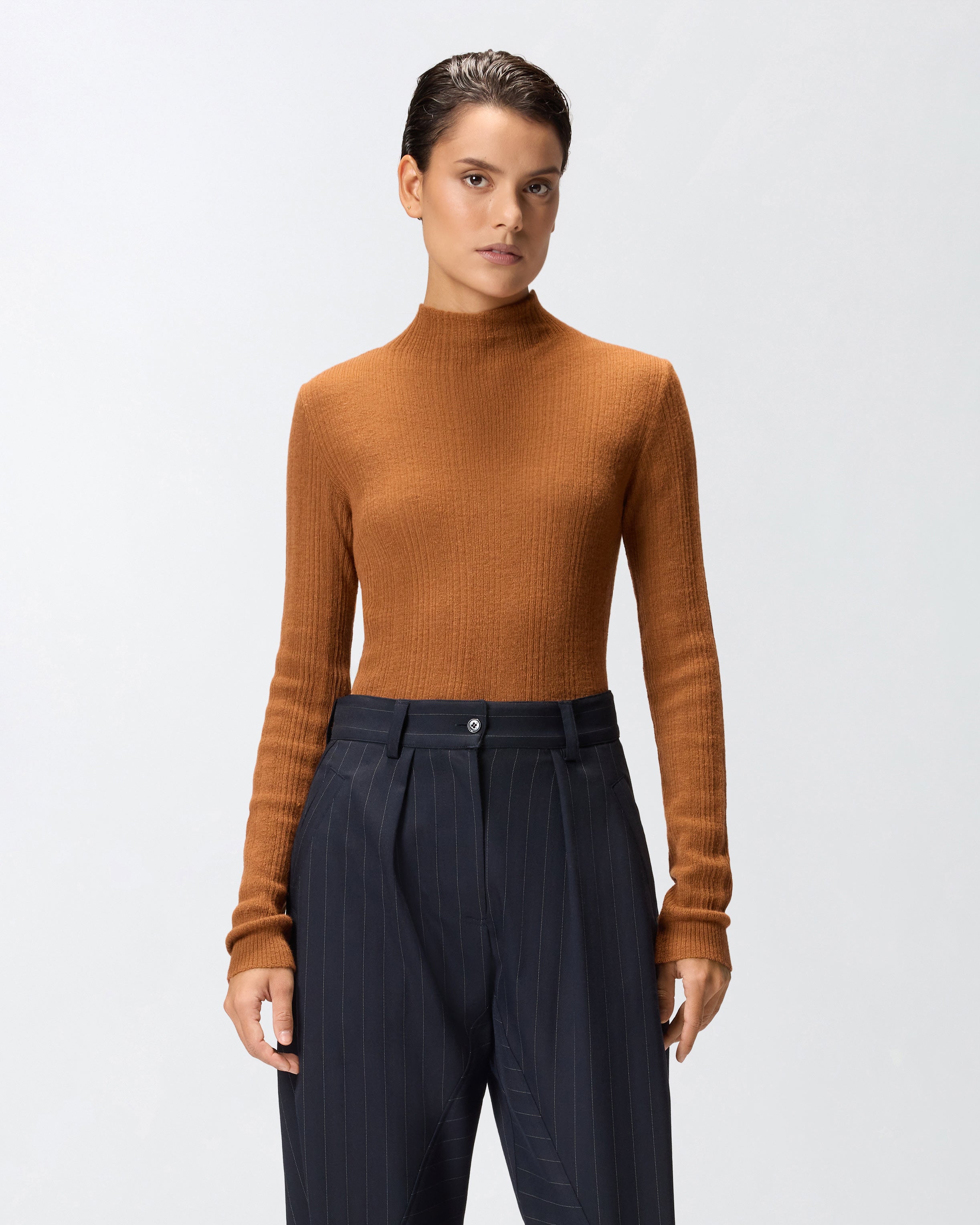 Seamless long-sleeved sweater made from a super-soft alpaca wool blend, a Made in Italy yarn able to offer a soft feel to the touch and to the wearer. The slim-fit line of the high-neck sweater is complemented by the branded label in the middle of the back. The final detail is given by the delicate all-over ribbed knit. The piece has undergone finishing tests to minimise the possible formation of pilling, ensuring greater fabric softness and durability.