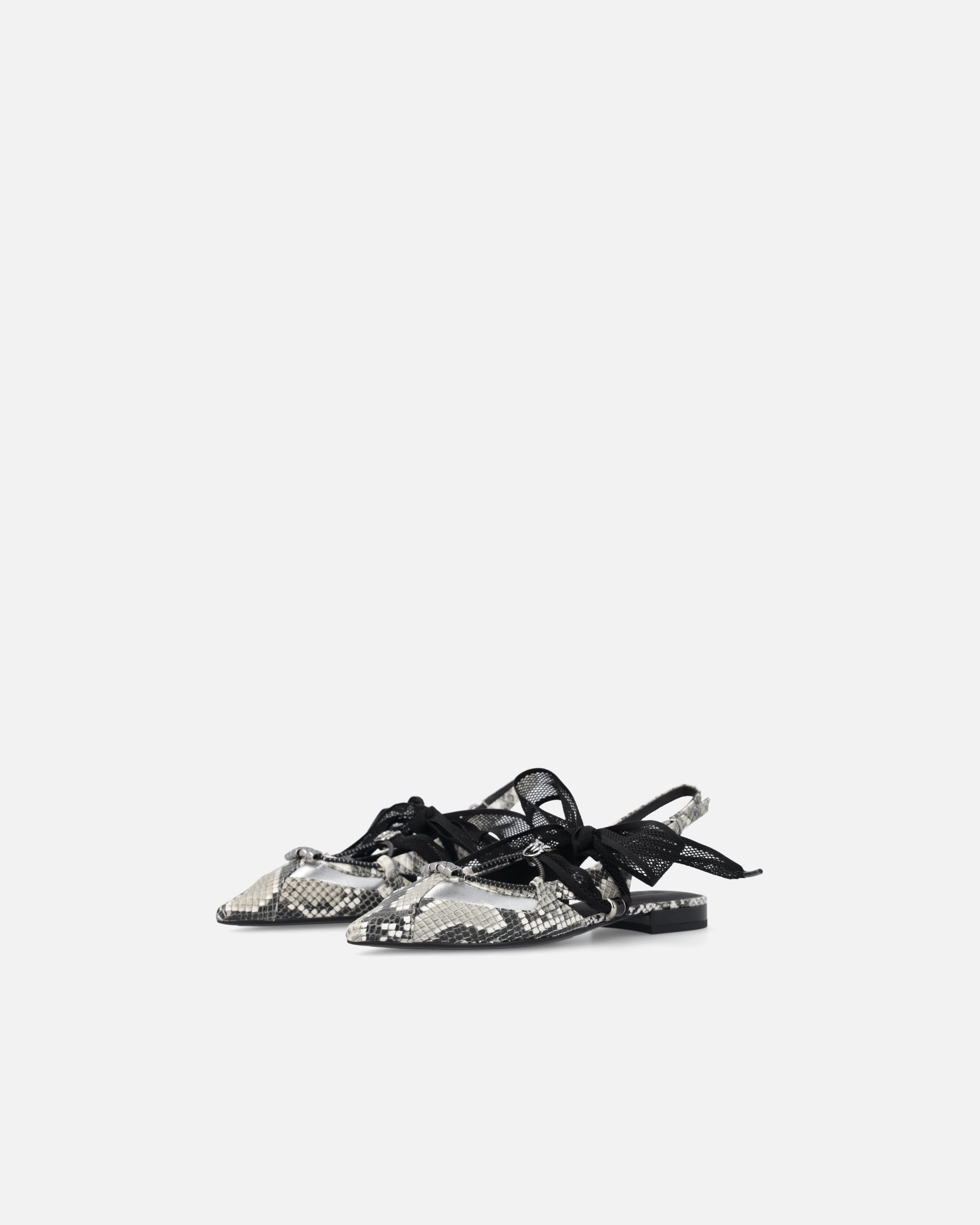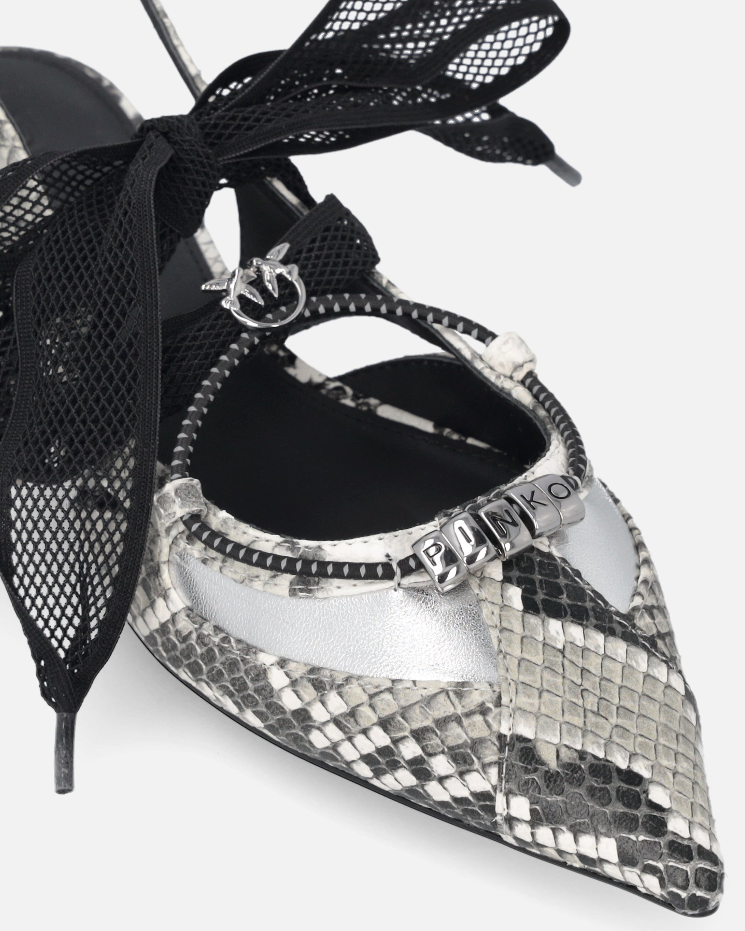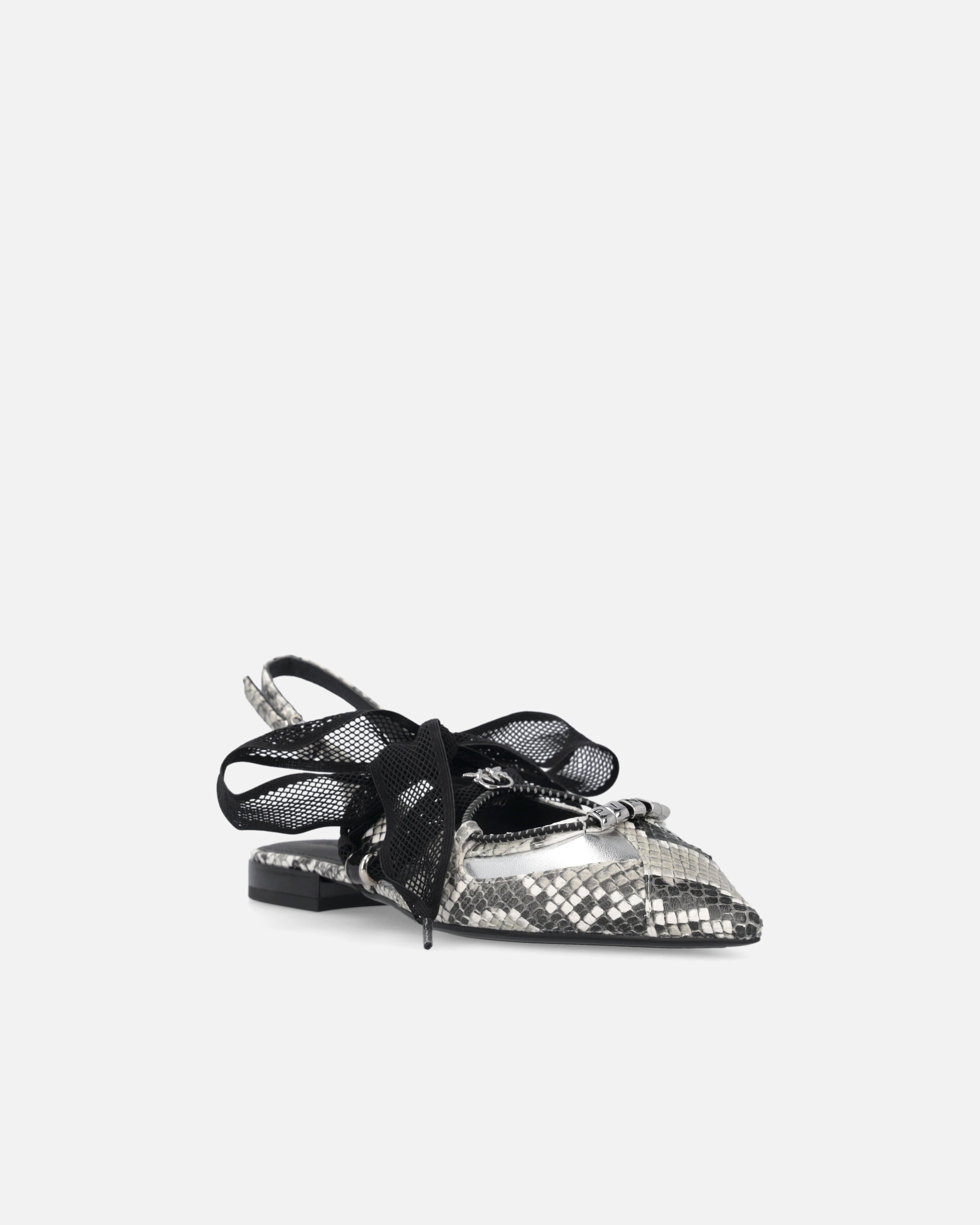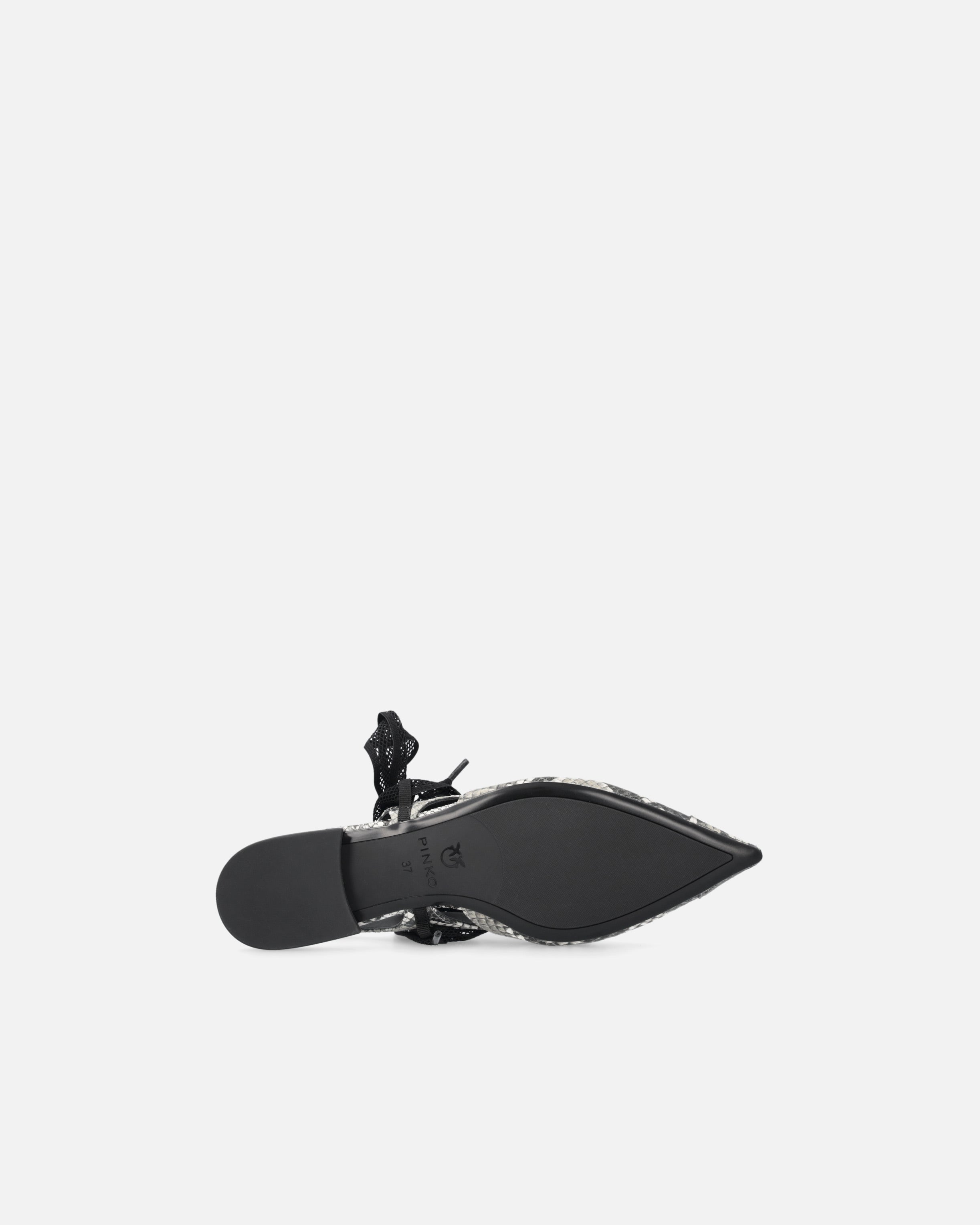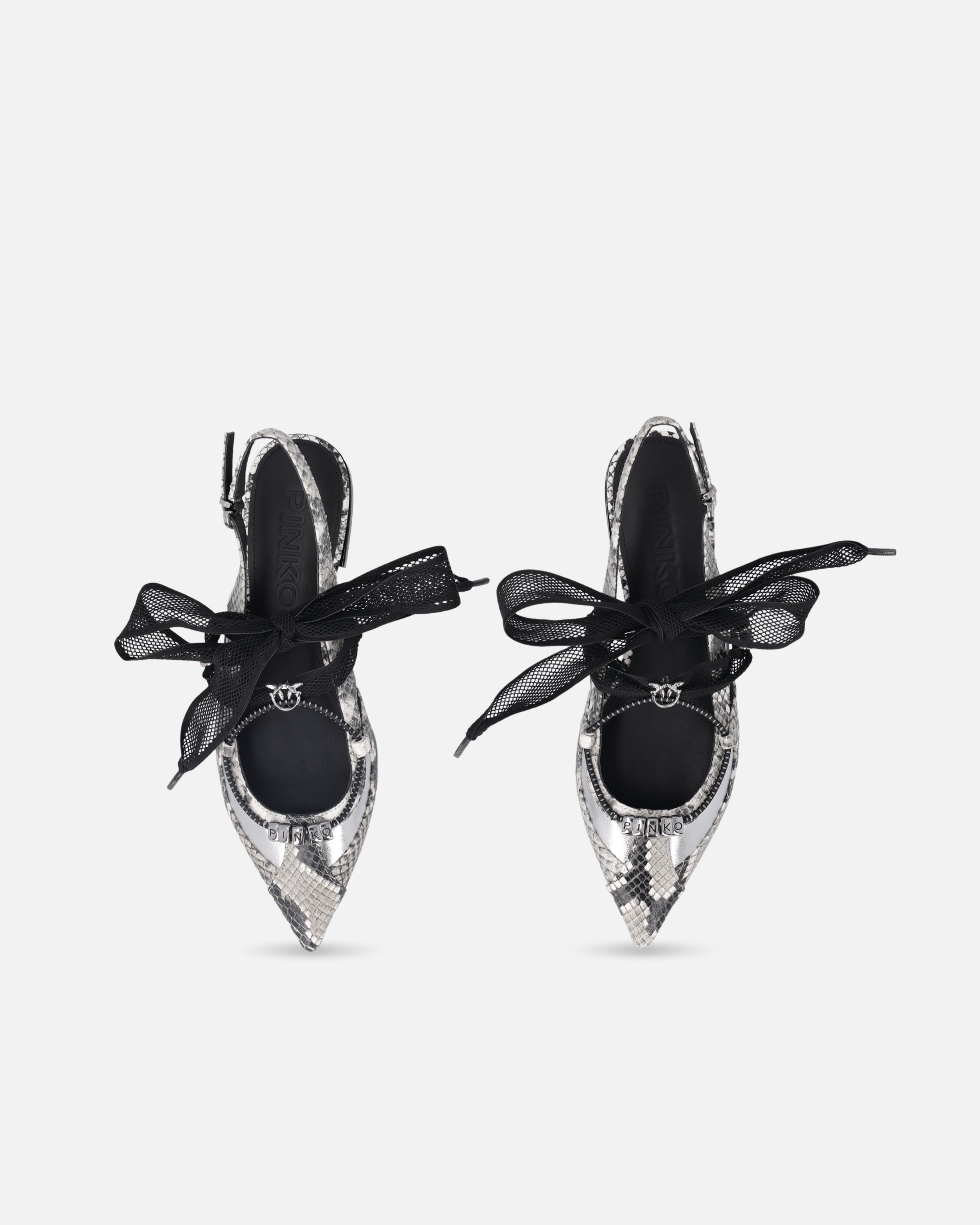 Sophisticated femininity and contemporary charm are combined in these flat slingbacks made of soft nappa leather with a flexible structure, featuring a bold all-over python print and sporty-chic ties. The mesh straps, to be tied in a bow, are embellished with a charm and a metal detail with the Love Birds logo, while the lower strap, with subtle graphic elements, is enriched by metal rings arranged to form the iconic PINKO lettering logo. This model features a streamlined silhouette with a tapered toe that gives elegance to the fit, and a flat sole that ensures lightness and comfort for everyday wear, without compromising on style. Perfect for both daytime and evening looks, these ballerinas are sure to turn heads. - GIANIRA 30