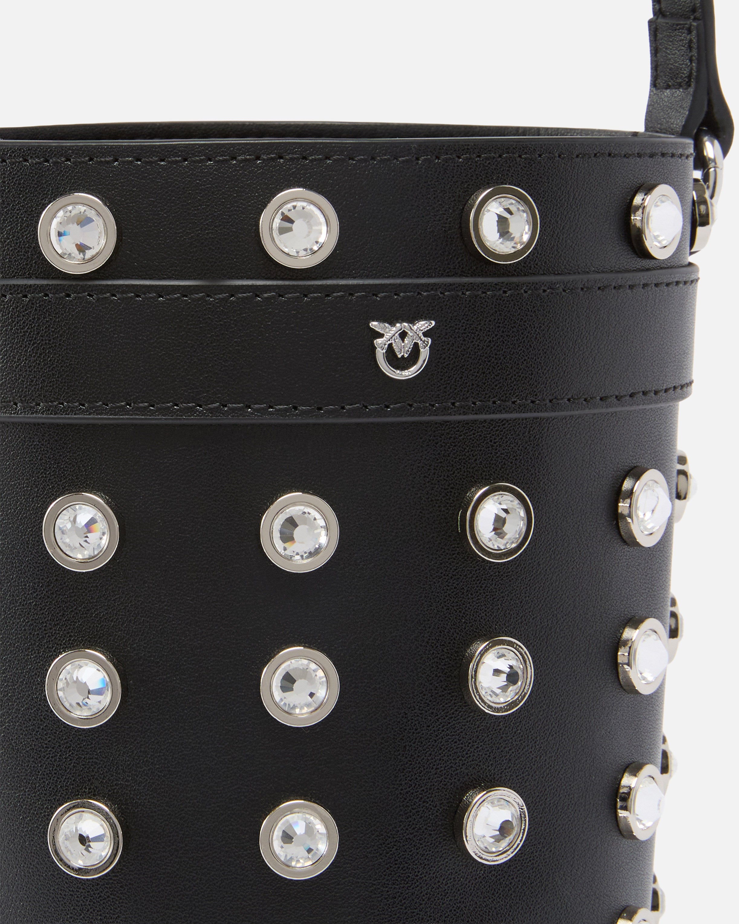 Small leather bucket bag with rigid cylindrical structure. Featuring an adjustable leather shoulder strap, inner lining and drawstring fastening, this bag is very versatile and practical. The perfect option for casual occasions. The undisputed star of this accessory, however, are the ultra-shiny rhinestones, accompanied by a small metal Love Birds logo on the front of the strap around the top. Activate your PINKO bag: verify the authenticity of your product and access a personalised experience by scanning the Love Birds embroidery on the back of the bag with your smartphone!
