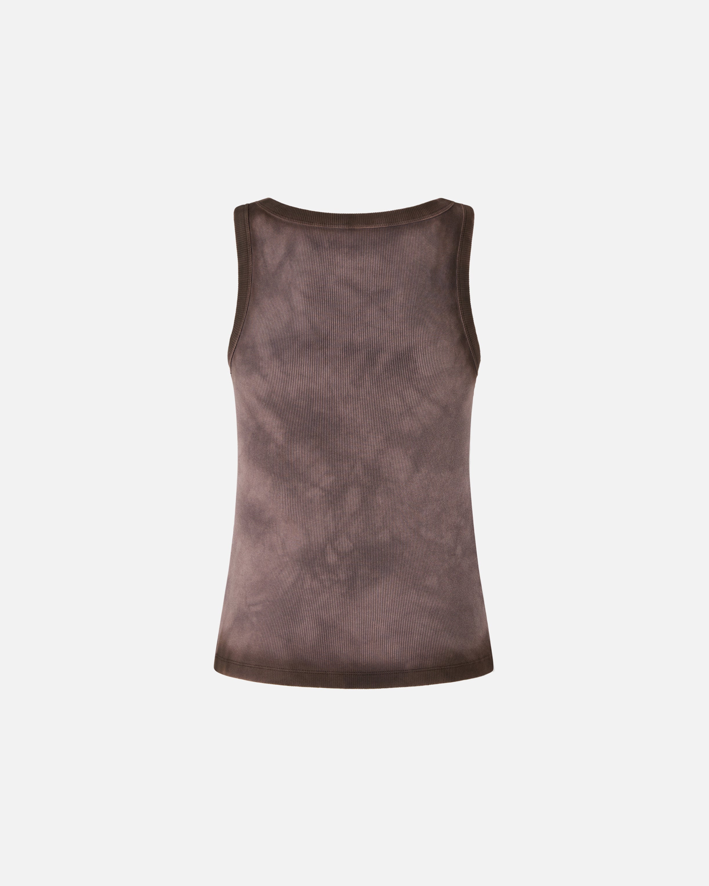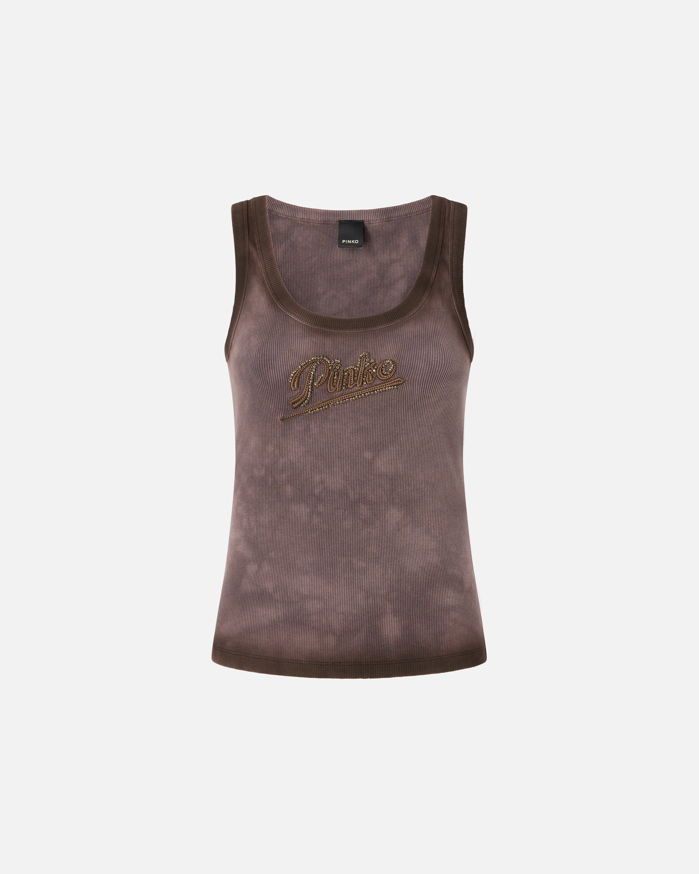 Round-neck vest top in ribbed stretch cotton fabric. A perfect fusion of urban attitude and chic spirit, the style features an all-over tie-dye effect with airbrushed, gradient edges for a spray-like effect, and is refined on the front with tonal PINKO logo lettering embroidery embellished with sparkling rhinestones. Make room in your wardrobe and elevate your everyday looks with an original, feminine garment that won't go unnoticed.