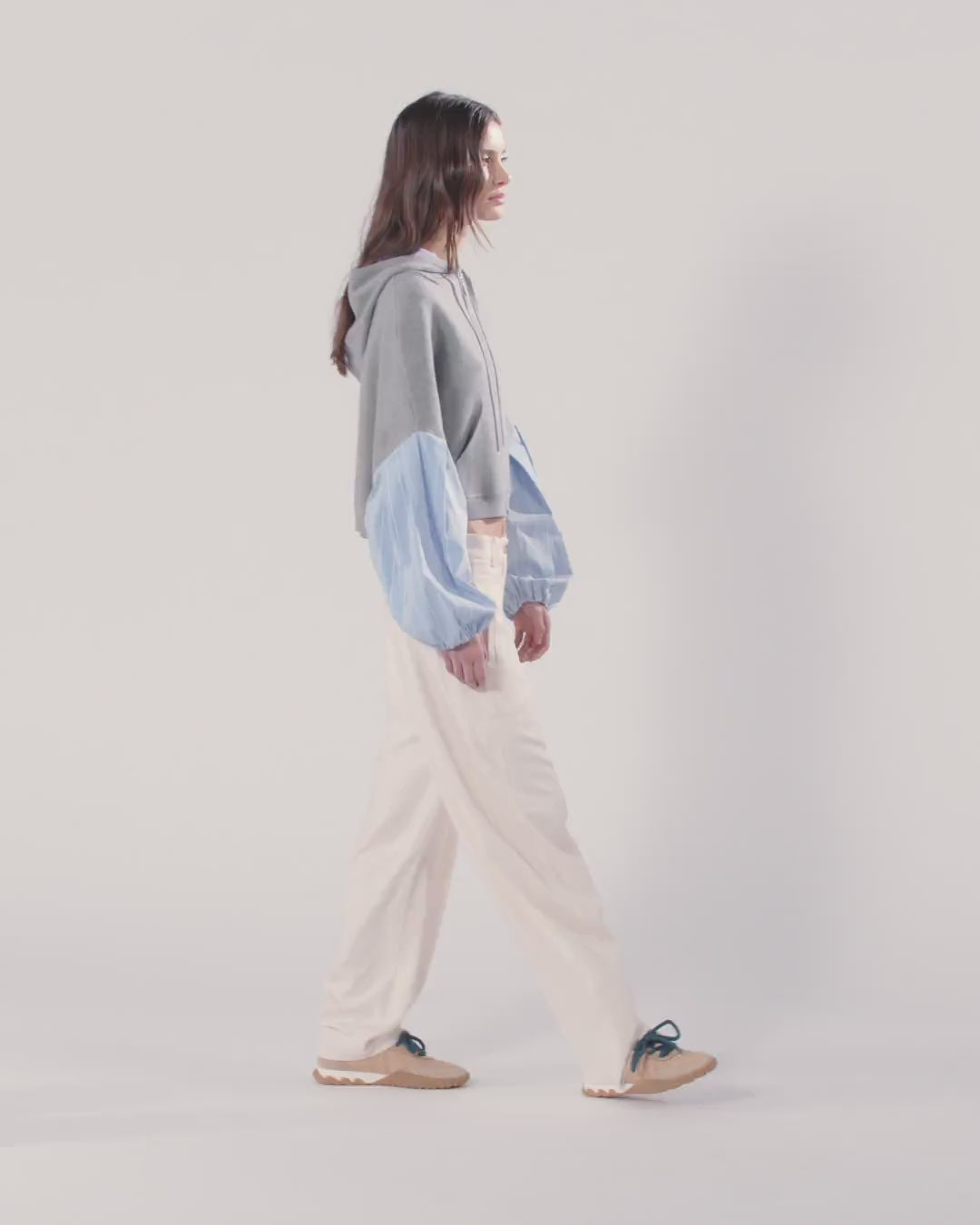 Vanisé-knit viscose-blend sweatshirt with contrasting shirt-style insert in striped stretch cotton-blend poplin that complements the sleeves and gives them a balloon-like shape. This model features elasticated sleeve ends, pouch pockets, two-way zip fastening at the front and a drawstring hood finished with a label sporting the iconic PINKO logo on the back. A garment that demonstrates the refined creativity of the brand, ideal for modern looks that combine functionality and style. - BLIZZARD SWEATER
