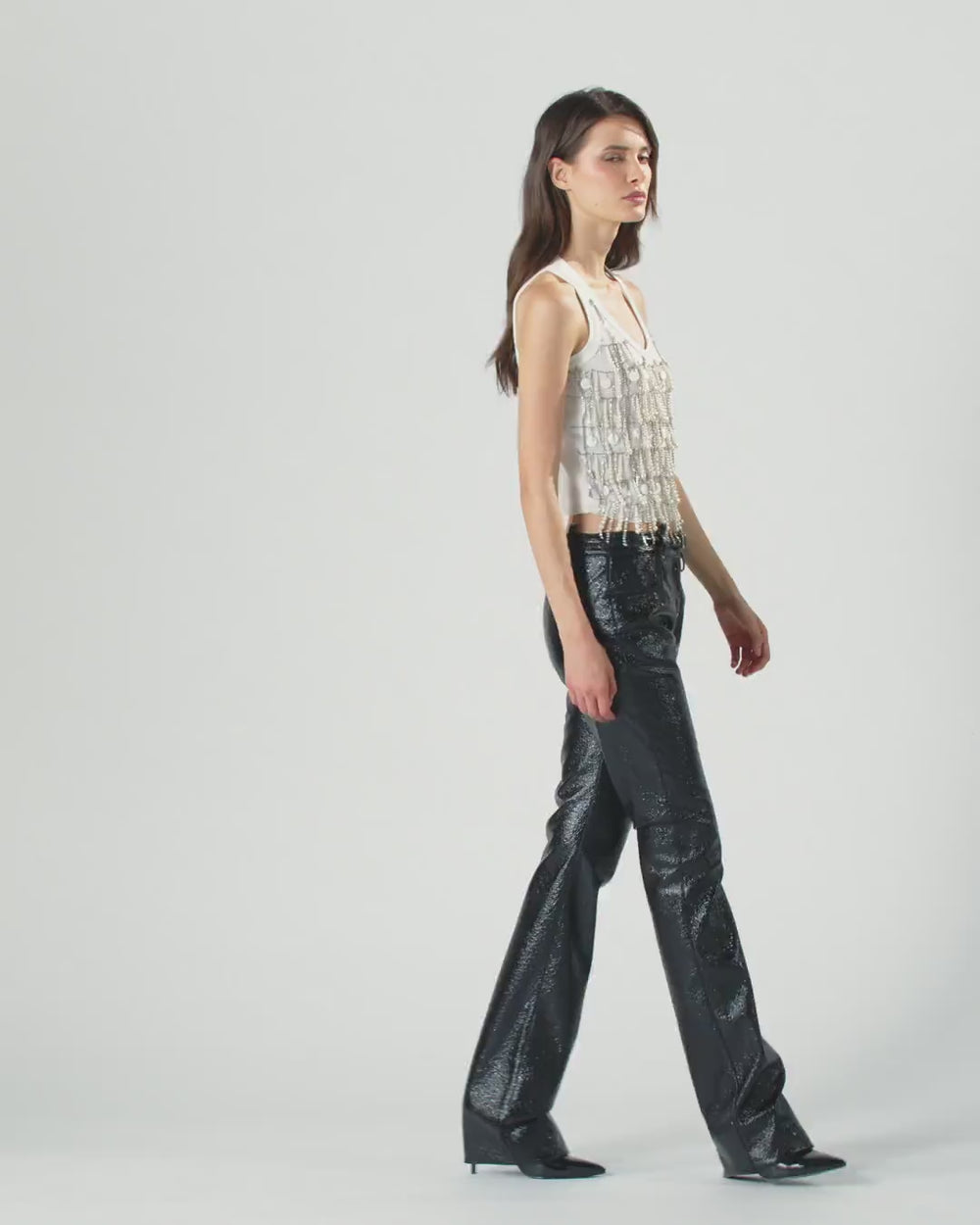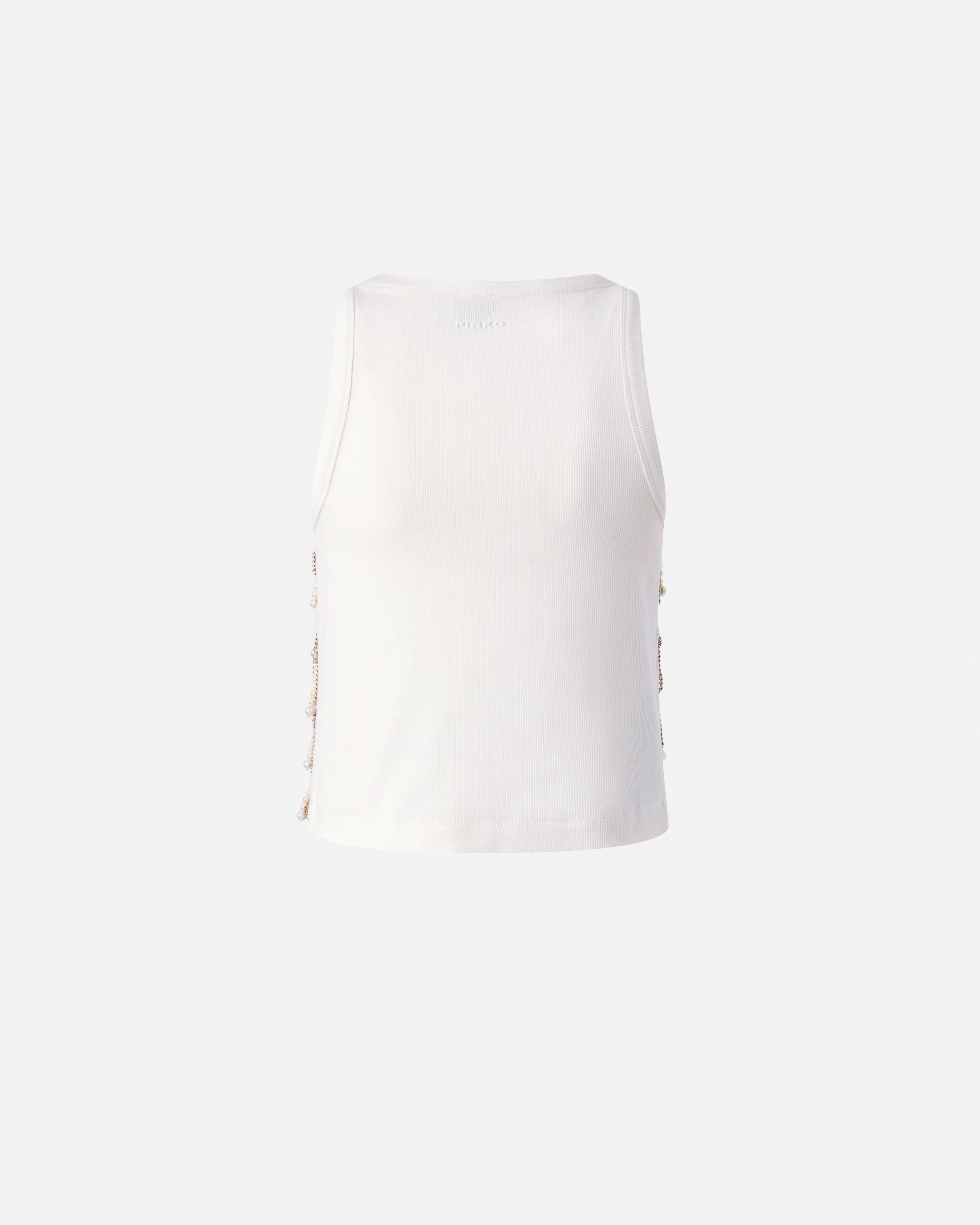 Rib-knit vest top made from cotton jersey and defined by a deep round-neck. The front features fine handmade embroidery with glass and metal chain appliqués with rhinestones, sewn one by one, to add movement and shimmer to the piece. Wear it with your favourite denim and a classic-cut blazer for a sporty, yet elegant and sophisticated look.