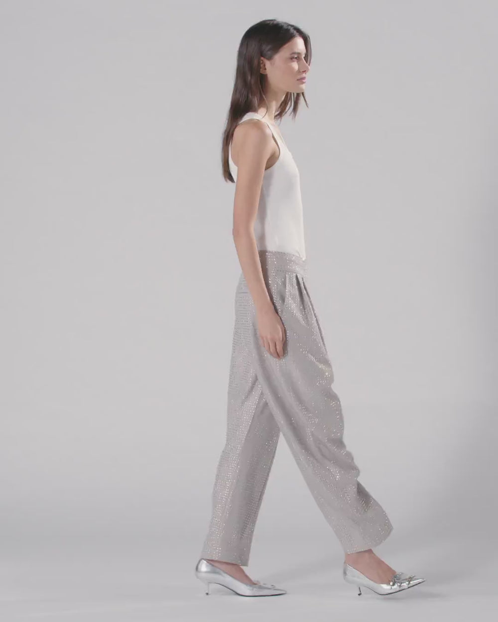 Women's trousers in fluid yarn-dyed stretch viscose blend fabric made precious by all-over luminous rhinestone applications, both on the front and on the back, along the entire length of the garment. The wide leg line is enhanced by the tailored-inspired darts at the waist, which add volume. The tailored rhinestone trousers are a business look with a jewel-like touch, adding elegance and style to your look. Wear them with the matching blazer for an original and feminine everyday outfit. The low-waisted trousers are completed with French pockets at the hips, welt pockets at the back and a double hook-and-eye fastening at the waist and zip fastening.