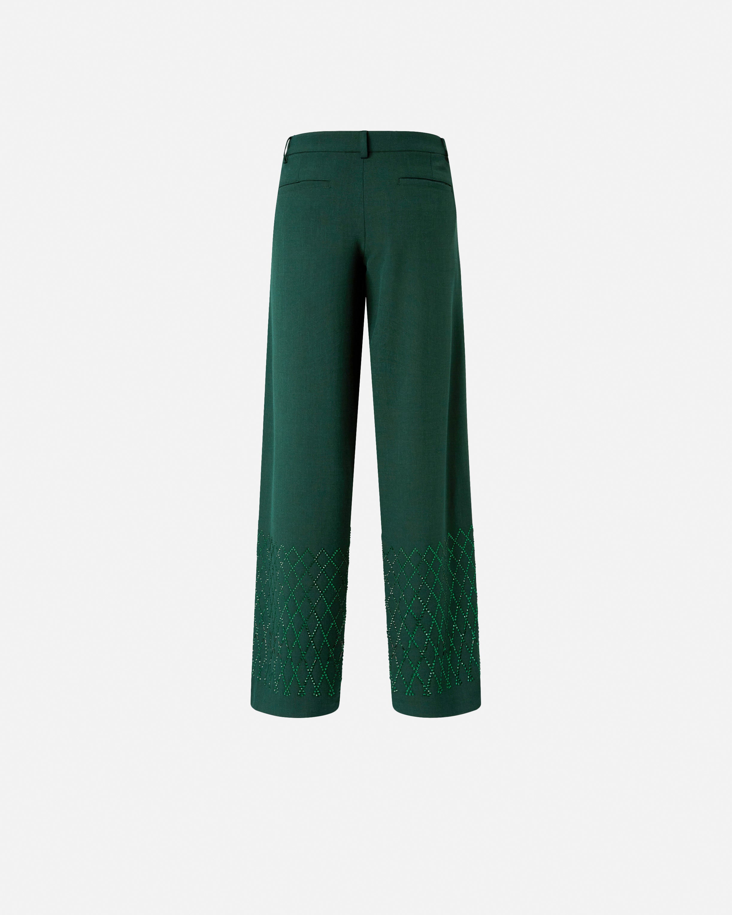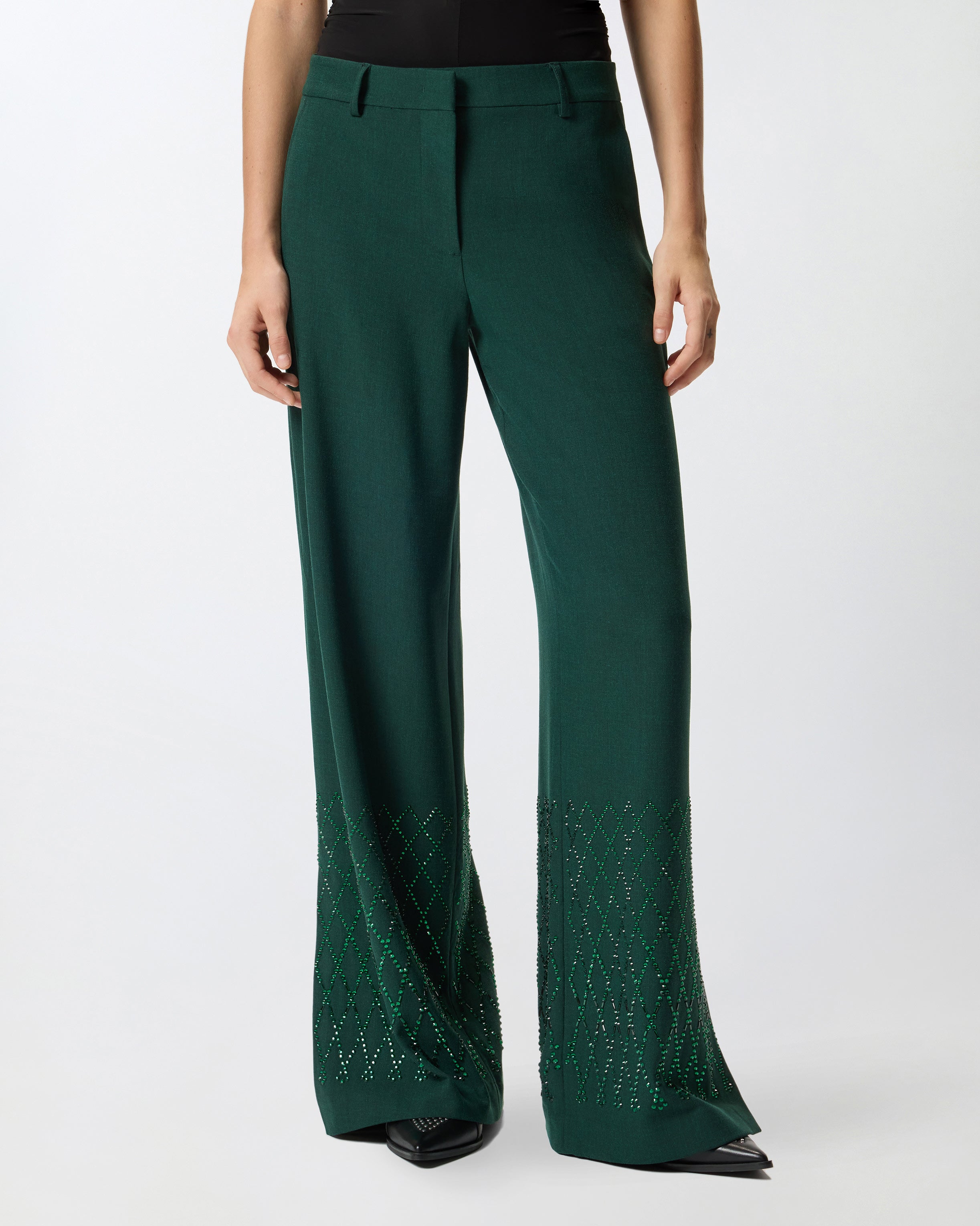 Wide-fit trousers with a slit on the hem and welt pockets on the back. The style features rhinestone appliqué in different shapes and sizes that creates a sophisticated geometric design on the hem. The detailing gives the garment a fine, luminous effect that elevates the understated quality of the silhouette. Opt for a refined, scintillating total look with the matching skirt for the most special occasions.