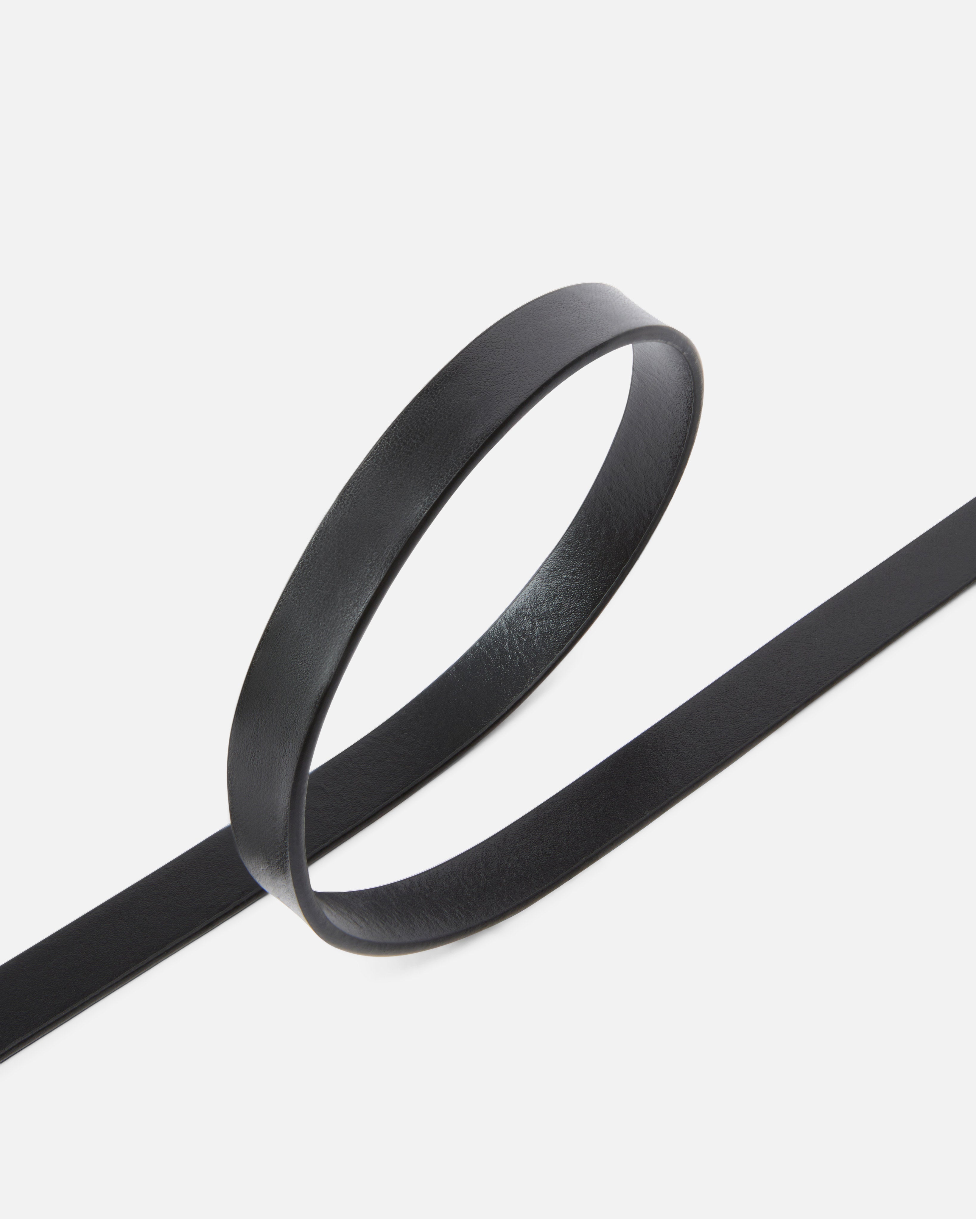 Slim, 1.2-cm belt in soft, polished leather. The silver-plated metal details are located on the buckle with a simple design and personalise the model with the brand name. The interior is partly made from a material derived from regenerated leather fibres. Understated and modern, this accessory is the missing piece from your daytime looks and more.
