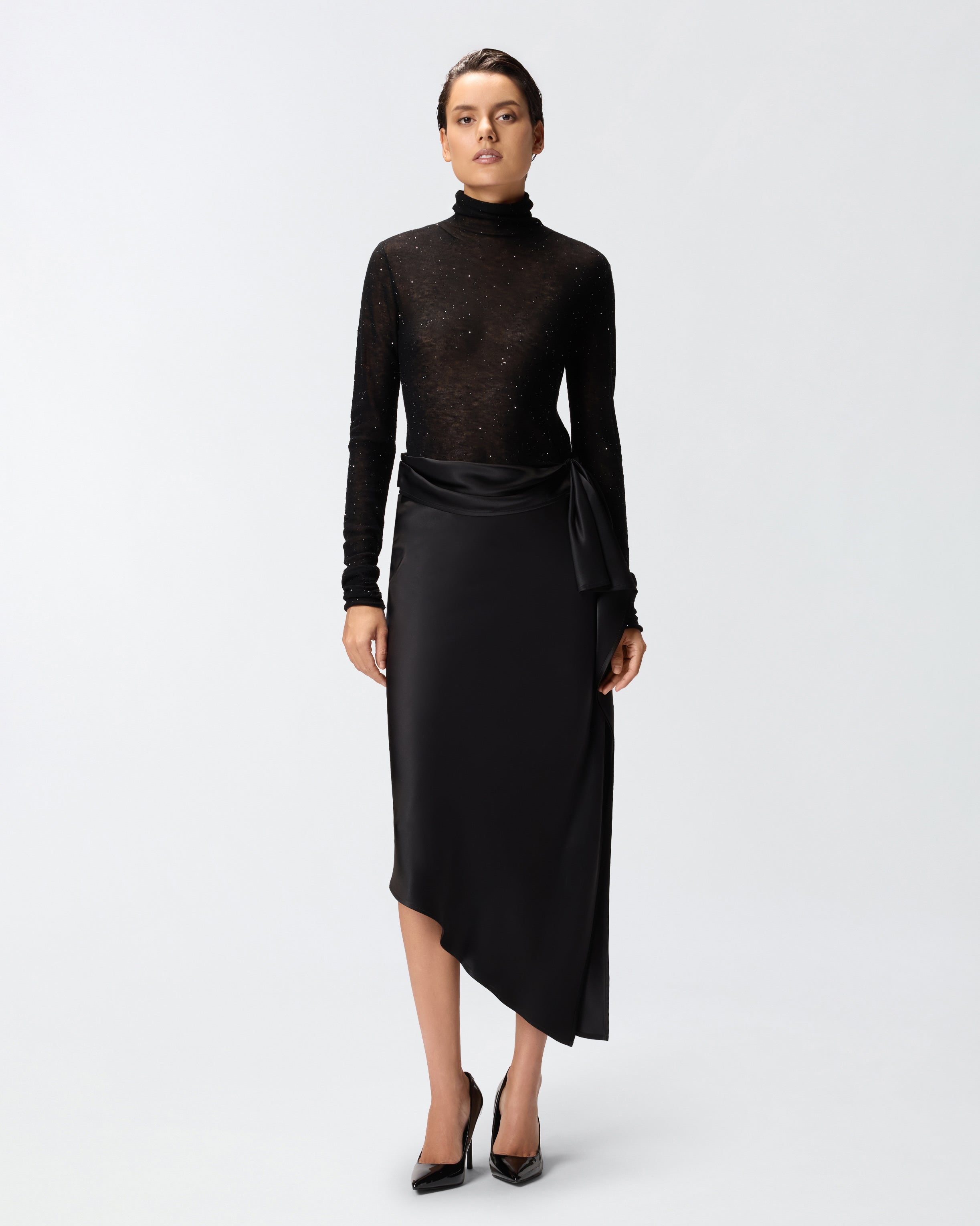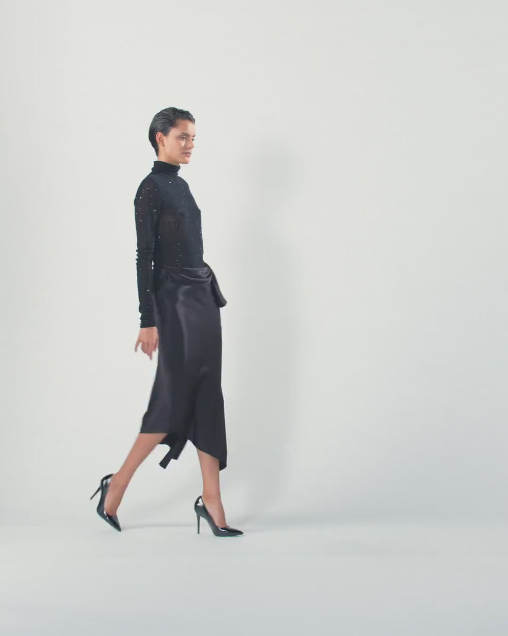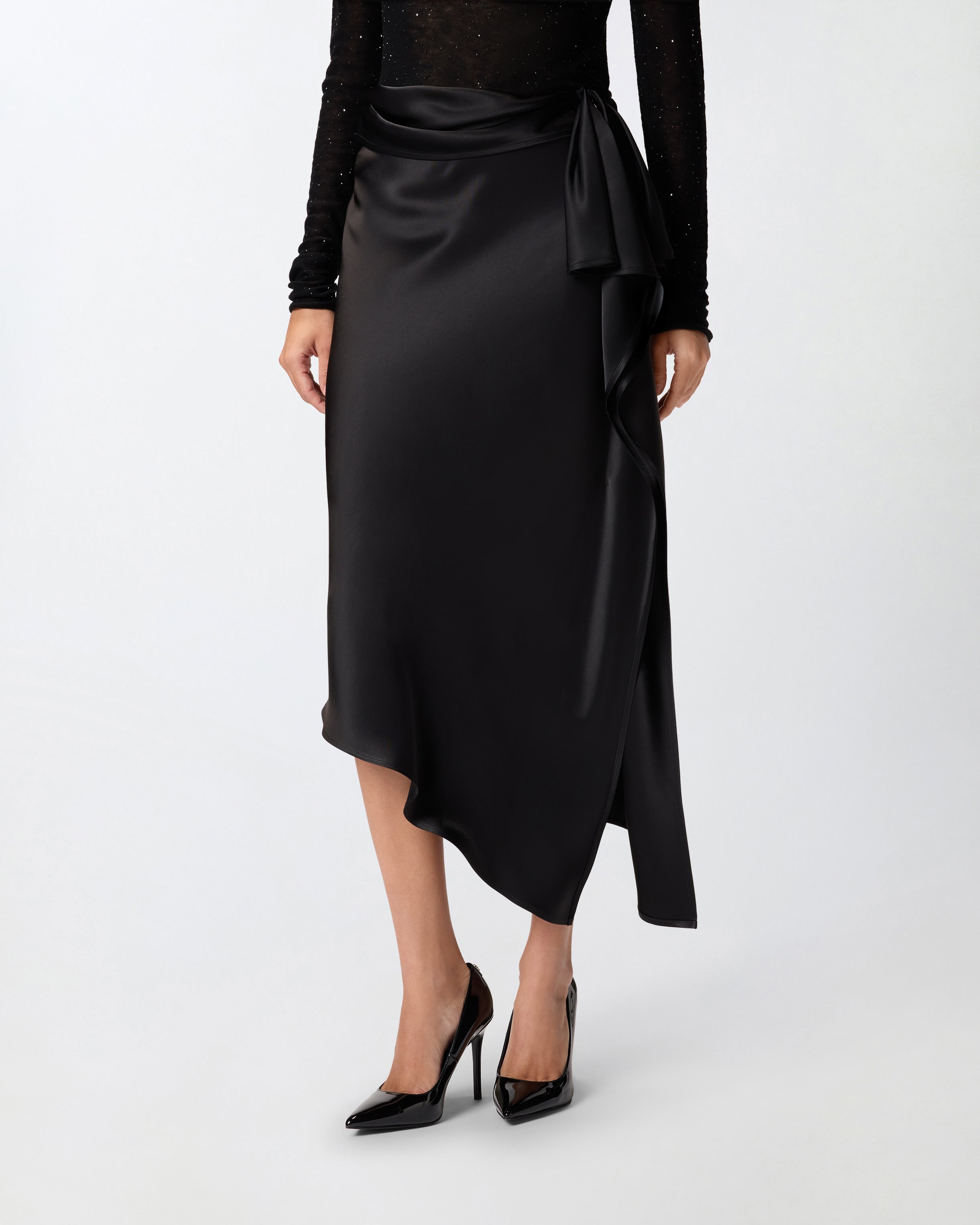 Full satin midi skirt with a tie belt on the waist. The shiny satin gives the piece unique shimmer and a particularly soft hand. The asymmetrical cut creates a dramatic effect, which is also accentuated by the flounces on the sides, creating a sensual and striking look. Wear this design for a fluid, slinky effect that elegantly enhances the lines with sophistication and the comfortable, feminine silhouette that is perfect for any occasion.
