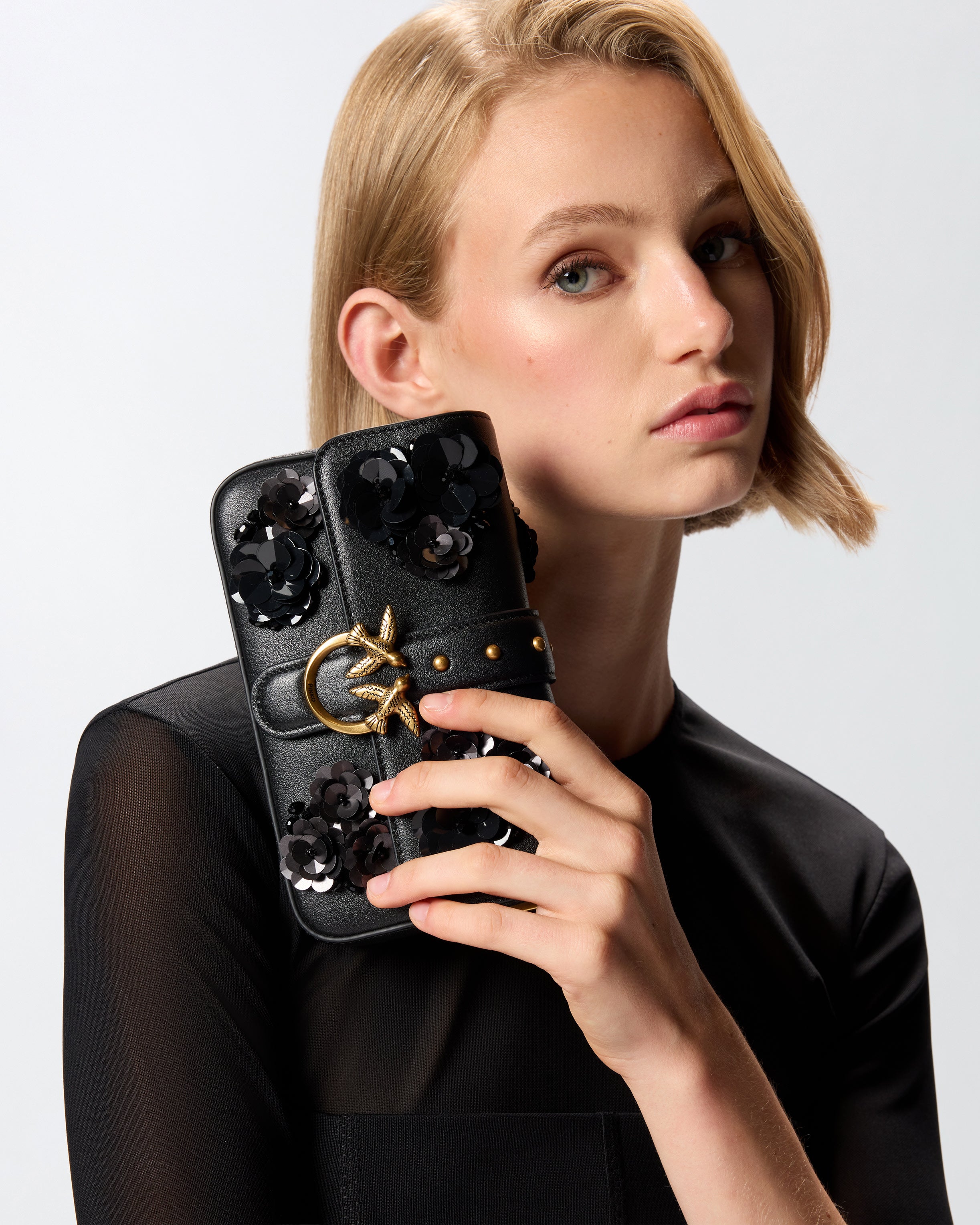 Baby Love Bag Slouchy leather shoulder bag. Featuring an adjustable leather and chain strap for shoulder or crossbody wear, this bag is very refined and practical. This evening piece features a number of embroidered sequinned flowers to give your look sparkle, while the finishing touch is provided by the Love Birds Diamond Cut buckle symbolising the brand's singular style. The accessory features a cotton drill-lined interior and a zipped slip pocket. Activate your PINKO accessory: verify the authenticity of your product and access a personalised experience by scanning the Love Birds embroidery on the back with your smartphone!