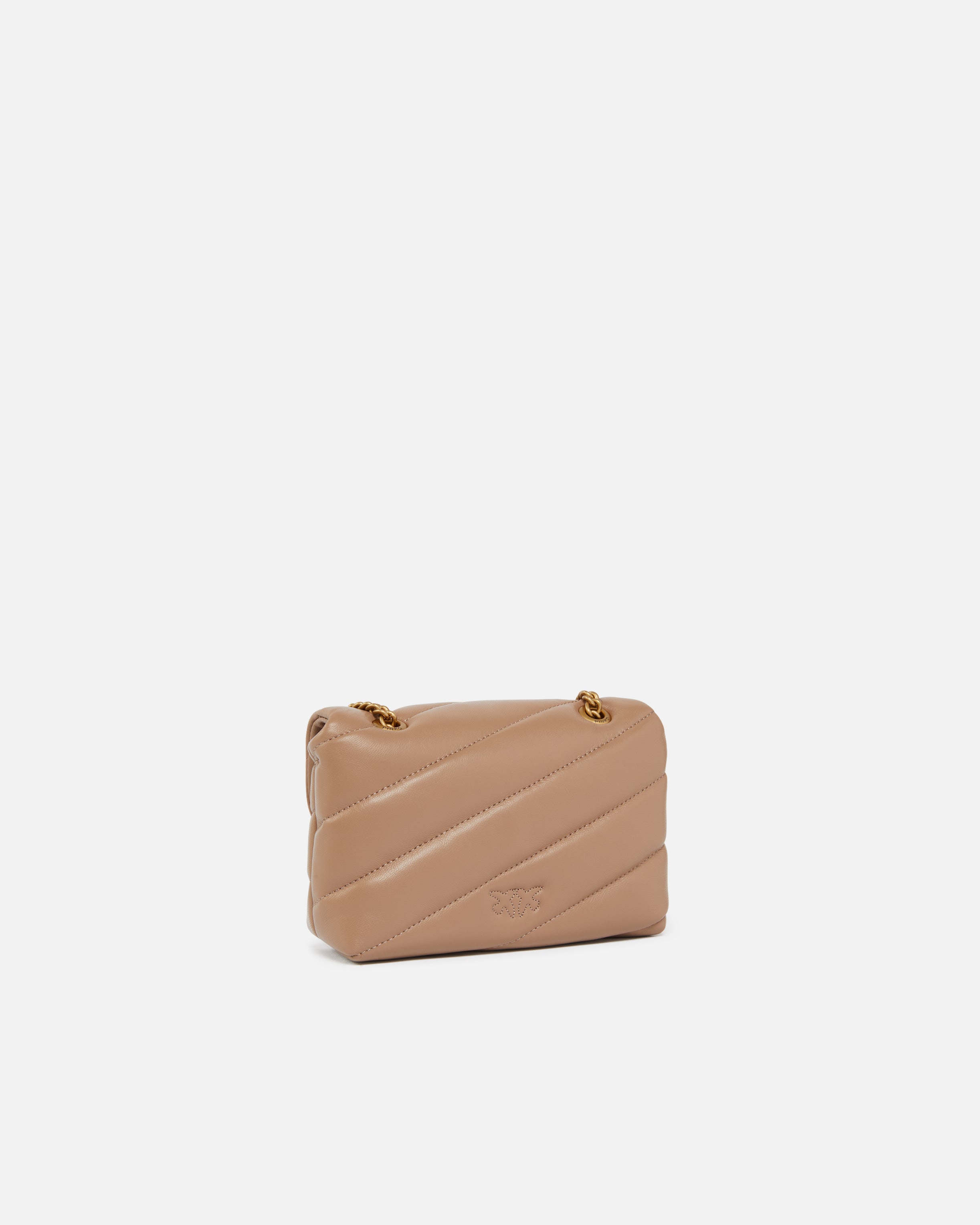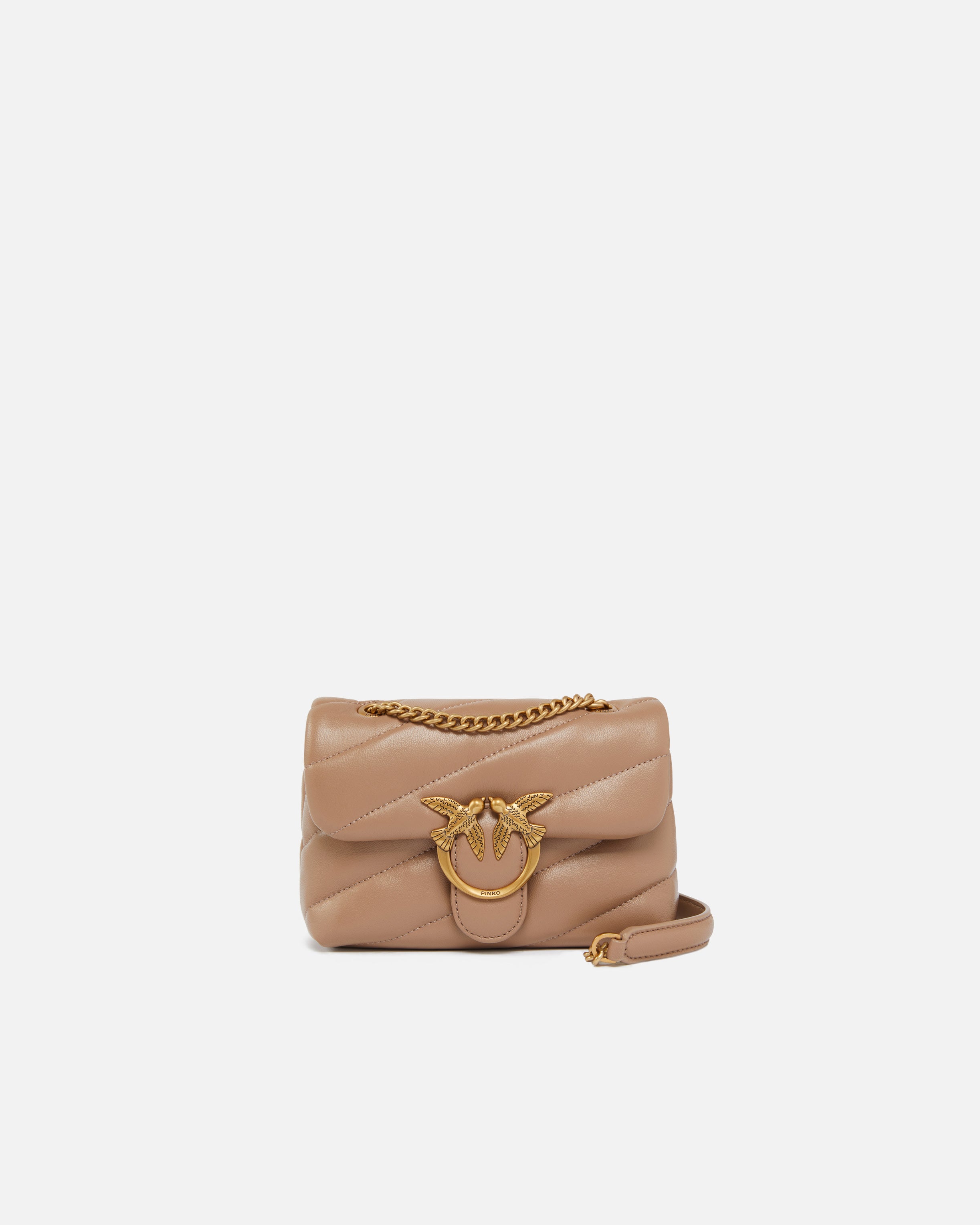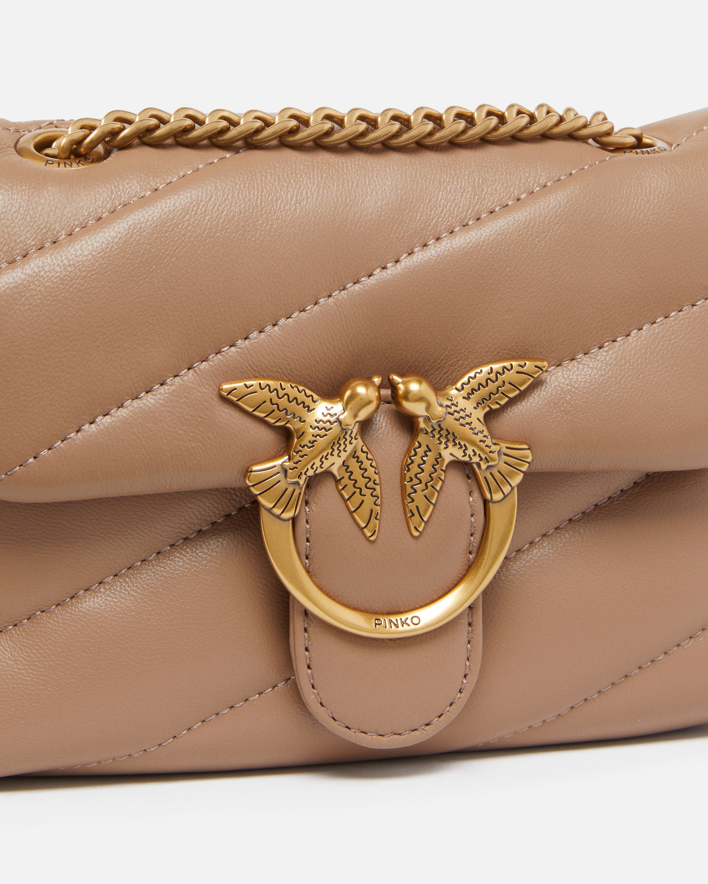 Baby Love Bag Puff in soft nappa leather with diagonal maxi quilting. The fastening is embellished with the iconic metal Love Birds Diamond Cut buckle. The accessory boasts a microsuede-lined interior and a zipped slip pocket. Complete with thin metal-chain shoulder strap.