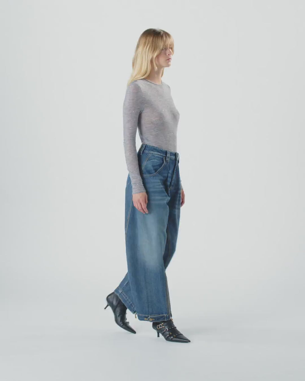 Balloon-fit jeans with a soft balloon leg that is rounded at the top and more cinched on the hem. The style is made from blue float-woven cotton denim, for a more fluid hand, and features a stonewash with manual sanding, localised sprayed detailing and brush strokes for a decidedly lived-in effect. The label with the Love Birds logo heat-pressed on the back of waistband and the brand’s lettering logo embroidered on the back right pocket add pure PINKO style to the design. Complete your wardrobe with these workwear-inspired jeans, finished with a rear strap and an adjustable fastening and zip on the hem to adjust the fit. Mid-rise with belt loops, a dropped crotch and zip and button fastening.
