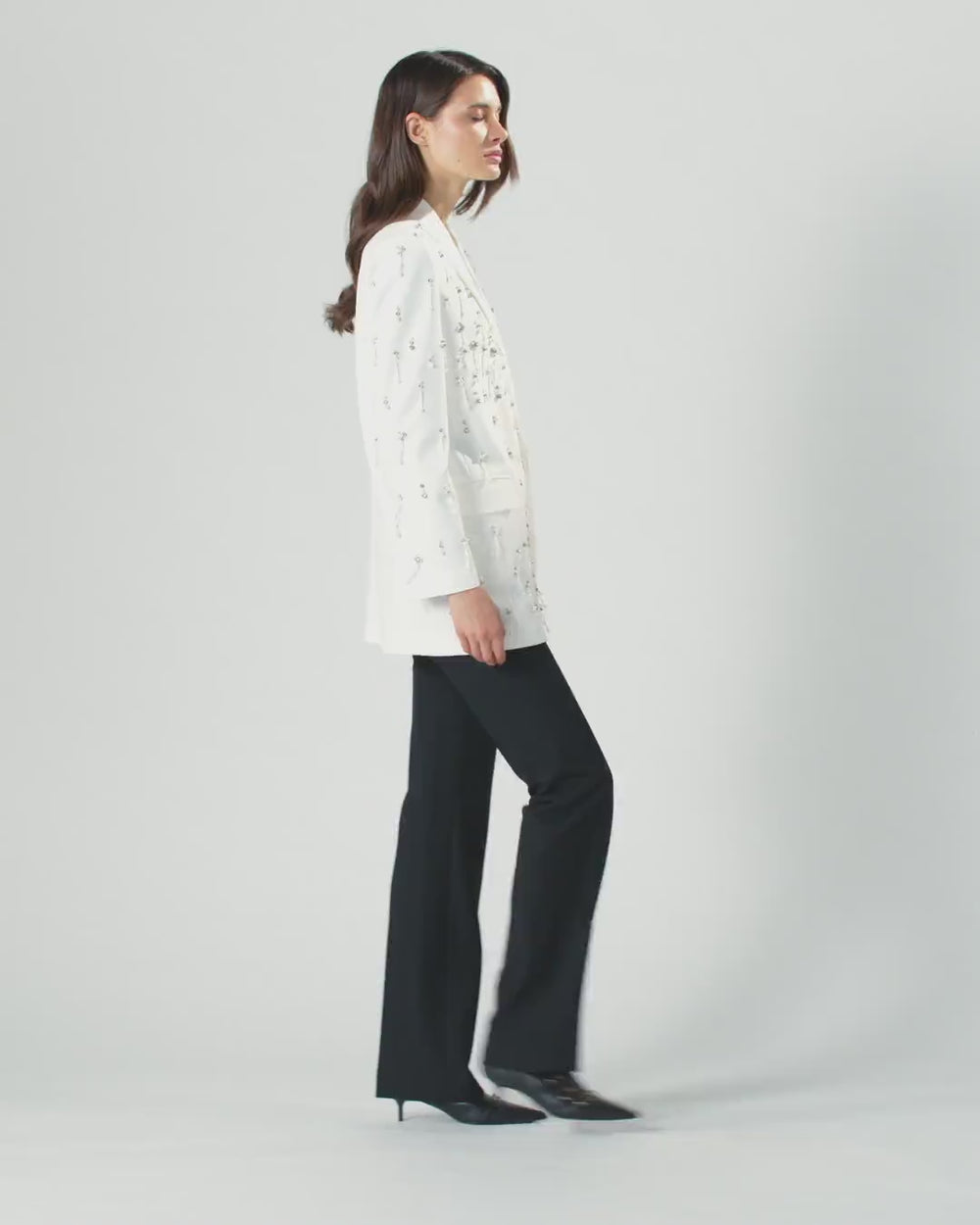 Straight-fit blazer with invisible button, front pockets and chest pocket, made of fine poly viscose fabric. A perfect blend of elegance and craftsmanship, this style is embellished with sparkling crystals and pearls on the front and sleeves: in addition to giving unparalleled brightness, they add a fluid and contemporary movement. The elegant fit and the finish with attention to every detail make this jacket a unique piece, ideal for special evenings and high-class occasions.