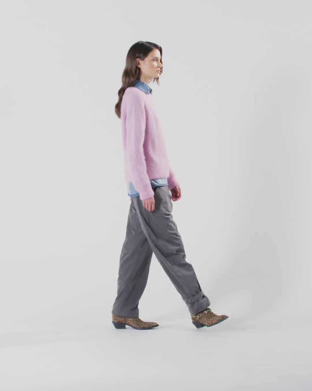 Long-sleeved sweater with a boat neck made from a mohair wool blend. The crew-neck, hem and cuffs are ribbed, while the final touch is given by the tone-on-tone label with PINKO lettering logo on the back of the design. The piece has undergone finishing tests to minimise the possible formation of pilling, ensuring greater fabric softness and durability. This understated design will become a go-to piece for your everyday looks.