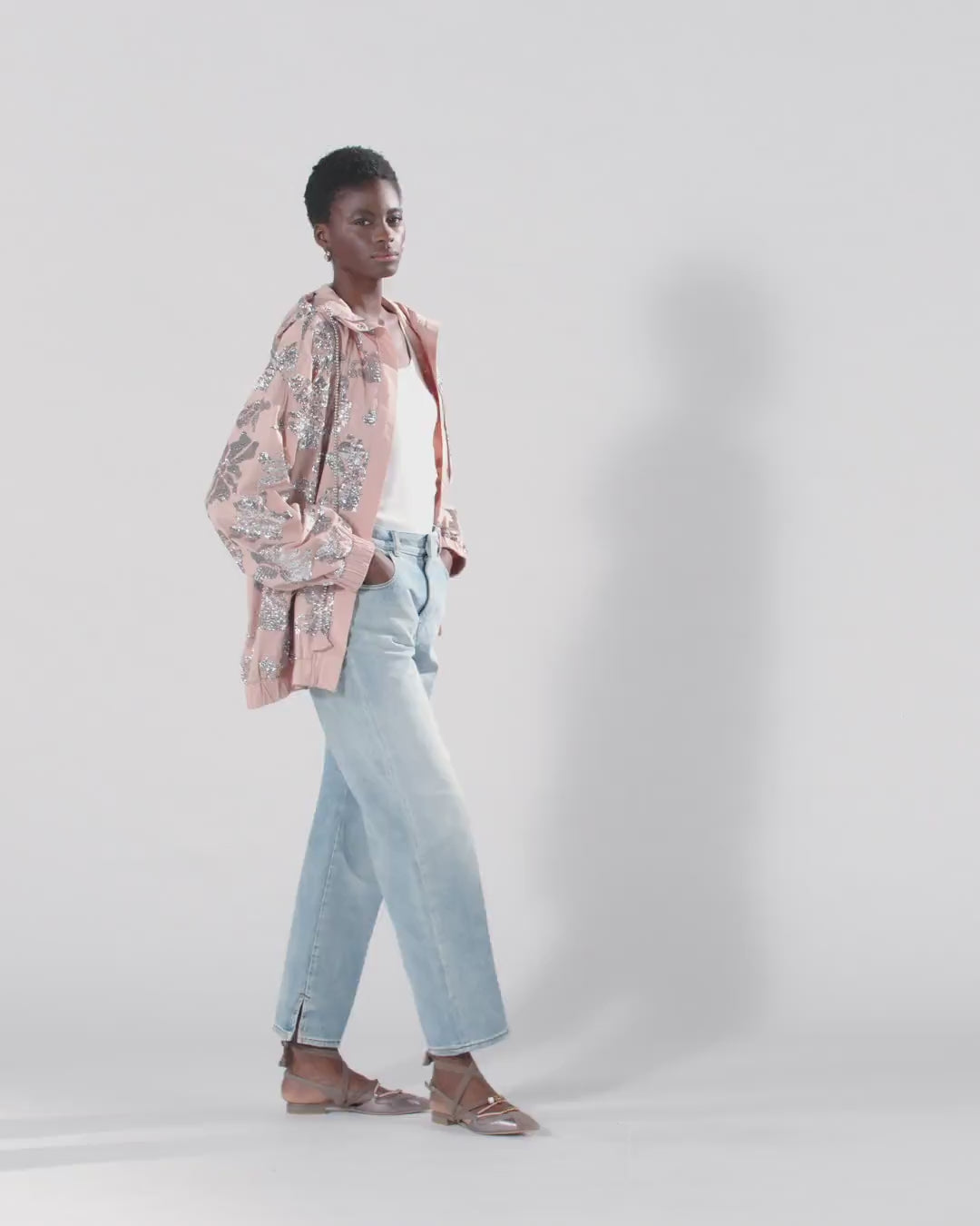 Bomber jacket in comfortable, durable technical poplin embellished with refined, silver-sequin floral embroidery all over to give the garment shine and dainty charm. This model features an elasticated hem and cuffs, concealed zip fastening and a hood with an adjustable drawstring comprising shiny beads and a fabric tip. The flawless combination of practicality and glamour makes this bomber jacket a must-have garment for those who like to stand out with elegant style, even in everyday looks.