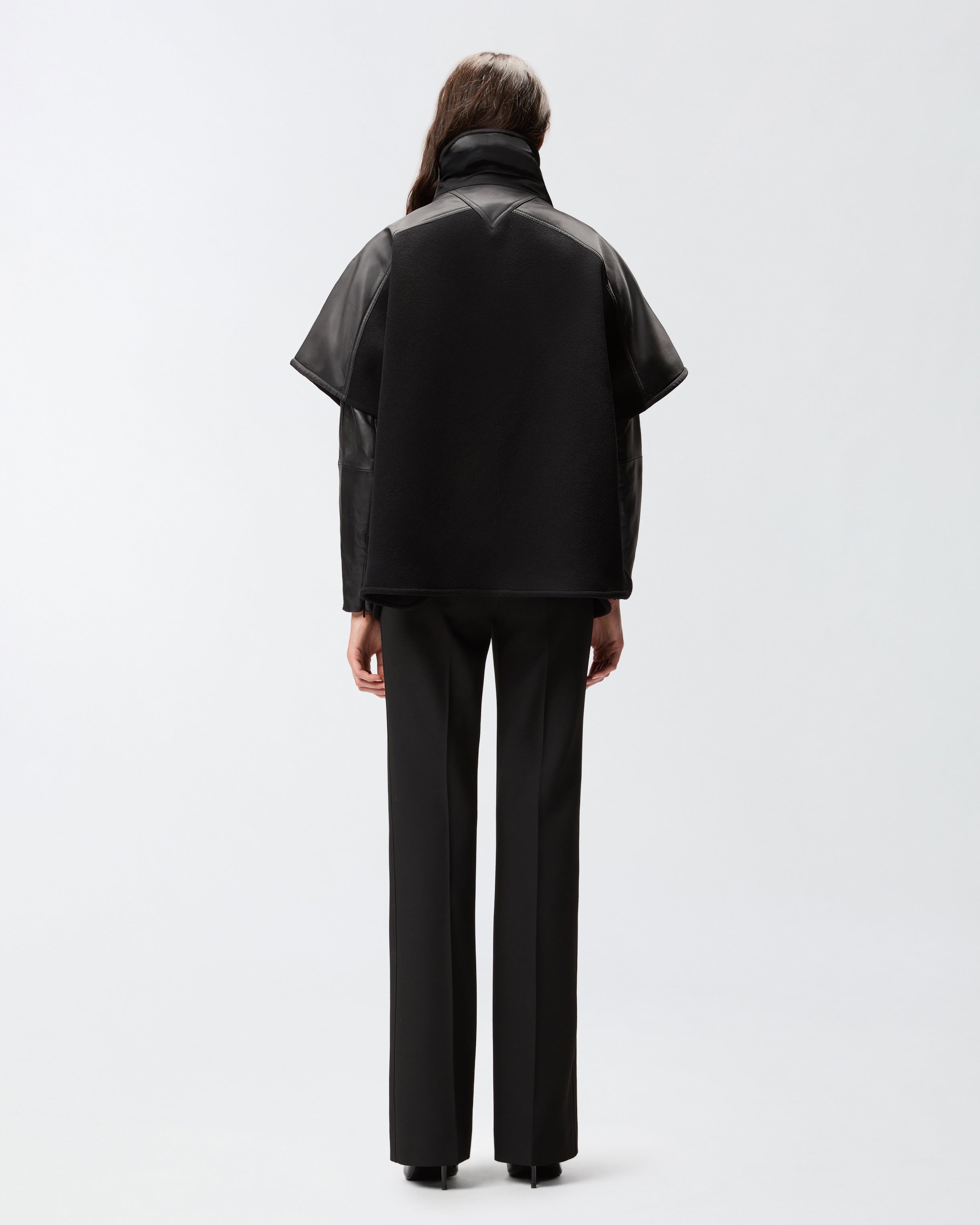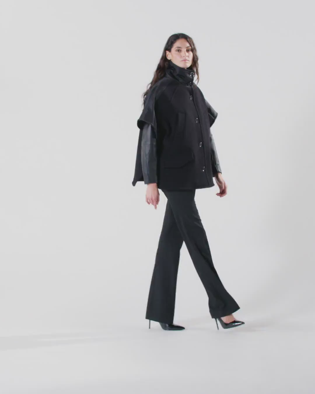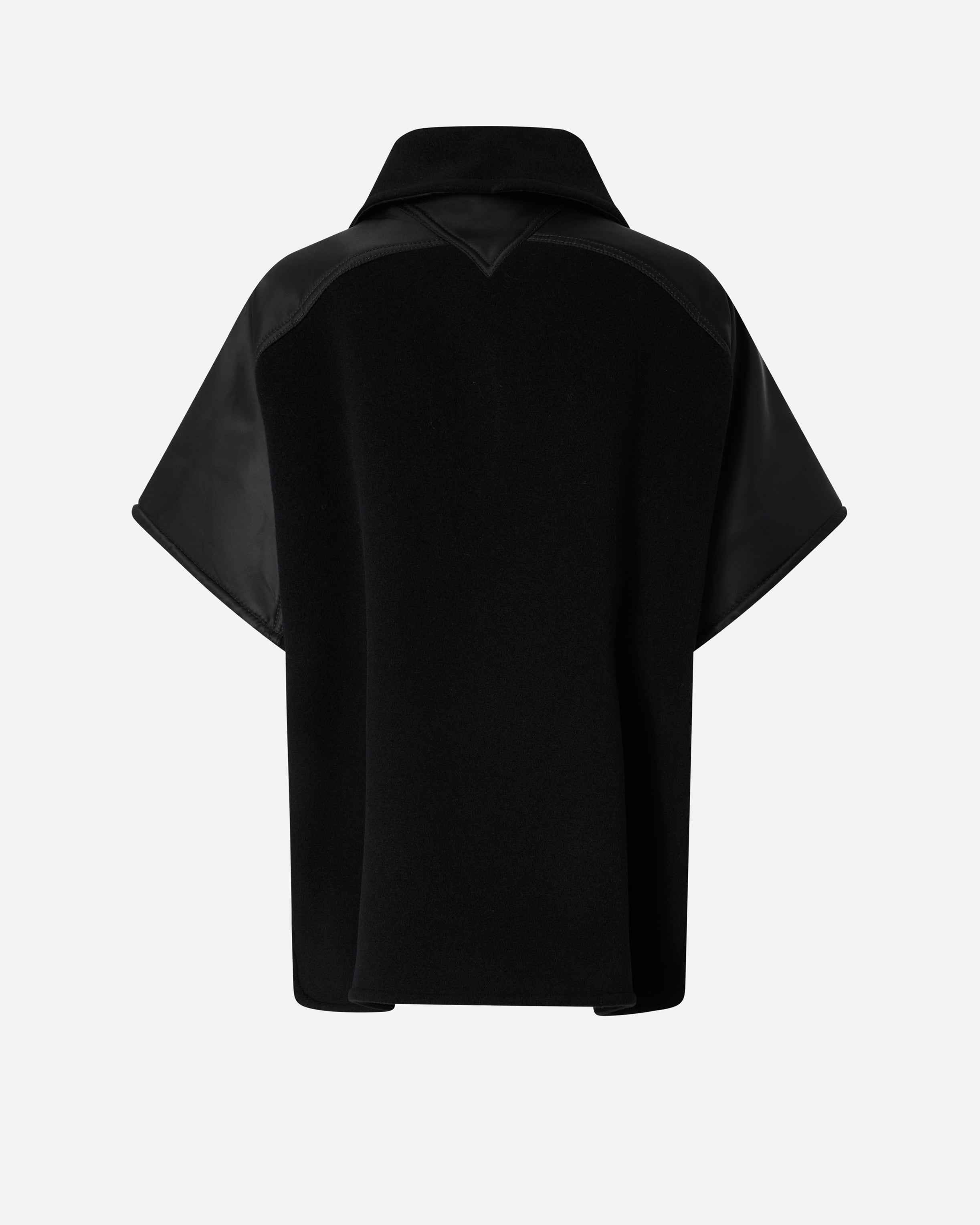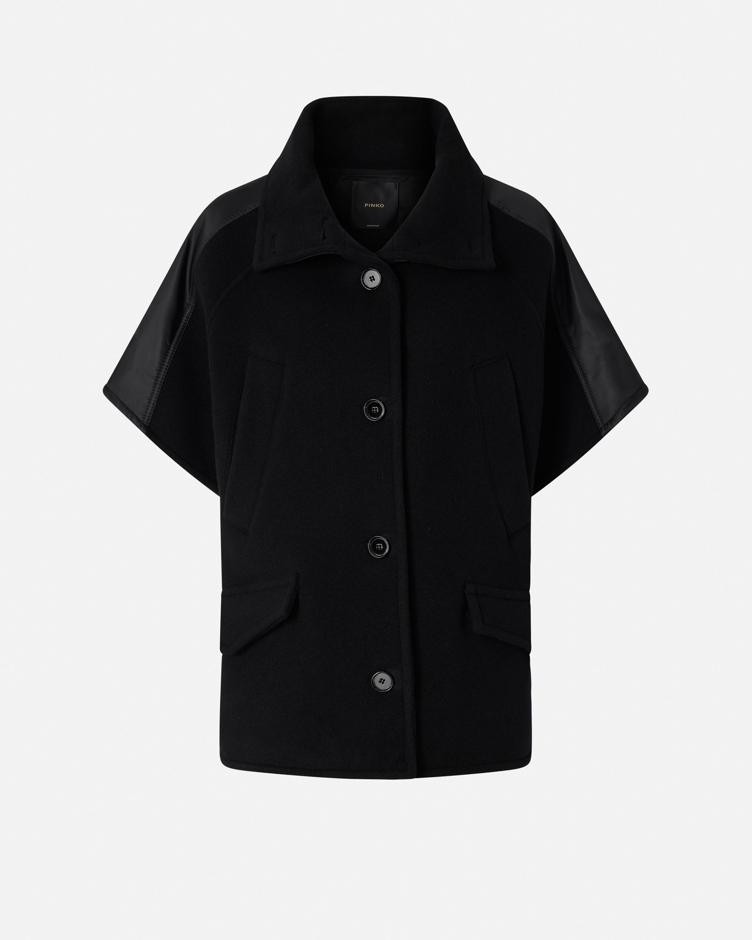 Short cape with short sleeves and double flap and welt pockets on the front. The style is made from warm, soft wool-blend cloth with a high neck, shoulders and yoke in technical satin. Front button fastening. Thanks to its original but functional design, this cape is ready to become your new favourite outerwear piece in pure PINKO style.