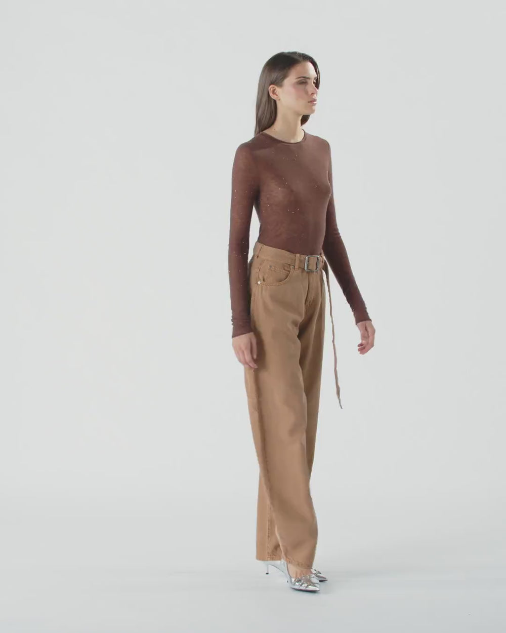 Crew-neck sweater made from a semi-sheer wool blend: a lightweight and soft yarn that is almost impalpable, which helps create a sensual and striking look. The design is embellished with micro-sequins inserted in the thread and manages to be shiny and understated and extremely comfortable to wear. The piece has undergone finishing tests to minimise the possible formation of pilling, ensuring greater fabric softness and durability. The final touch is given by the label with PINKO lettering logo on the back.