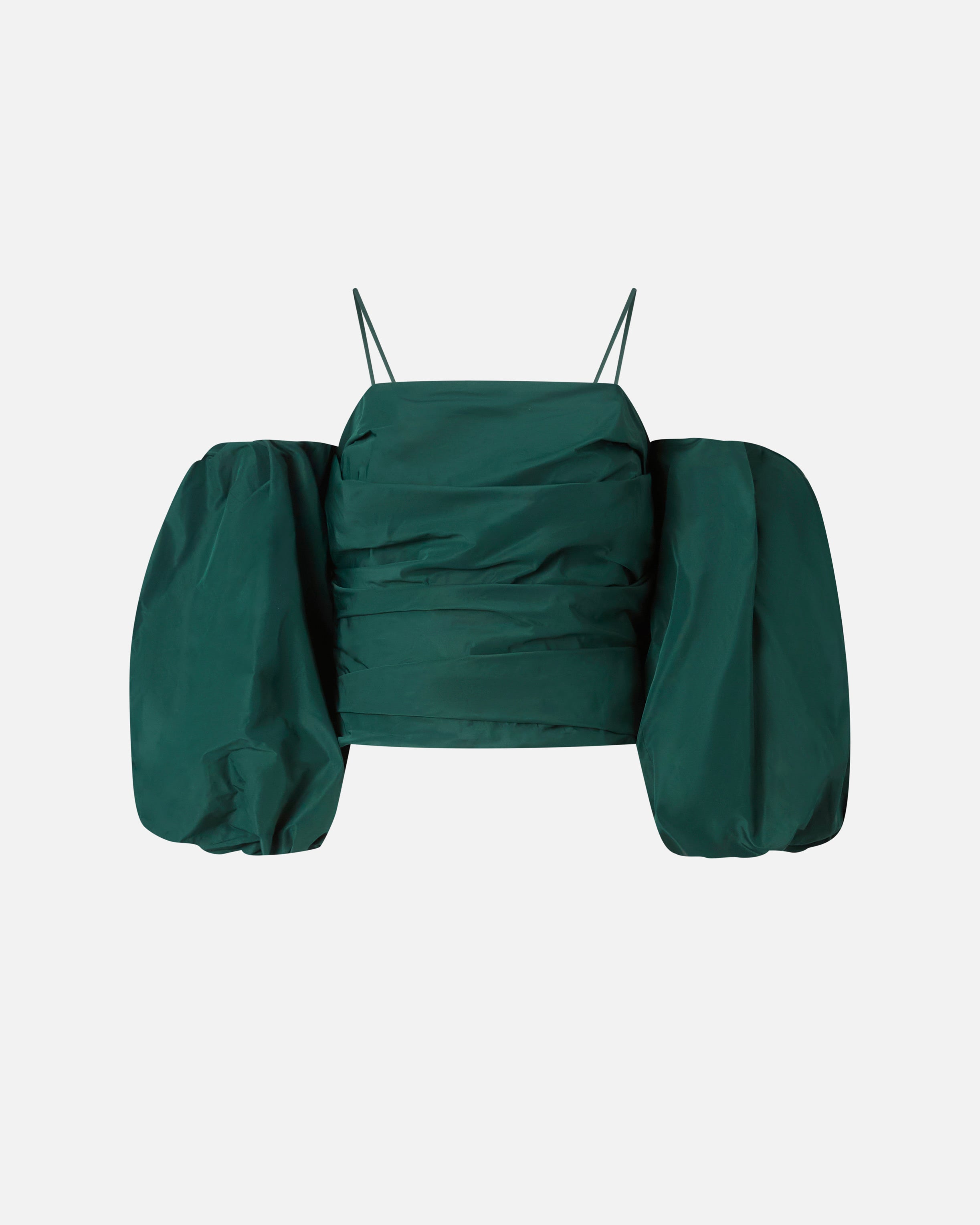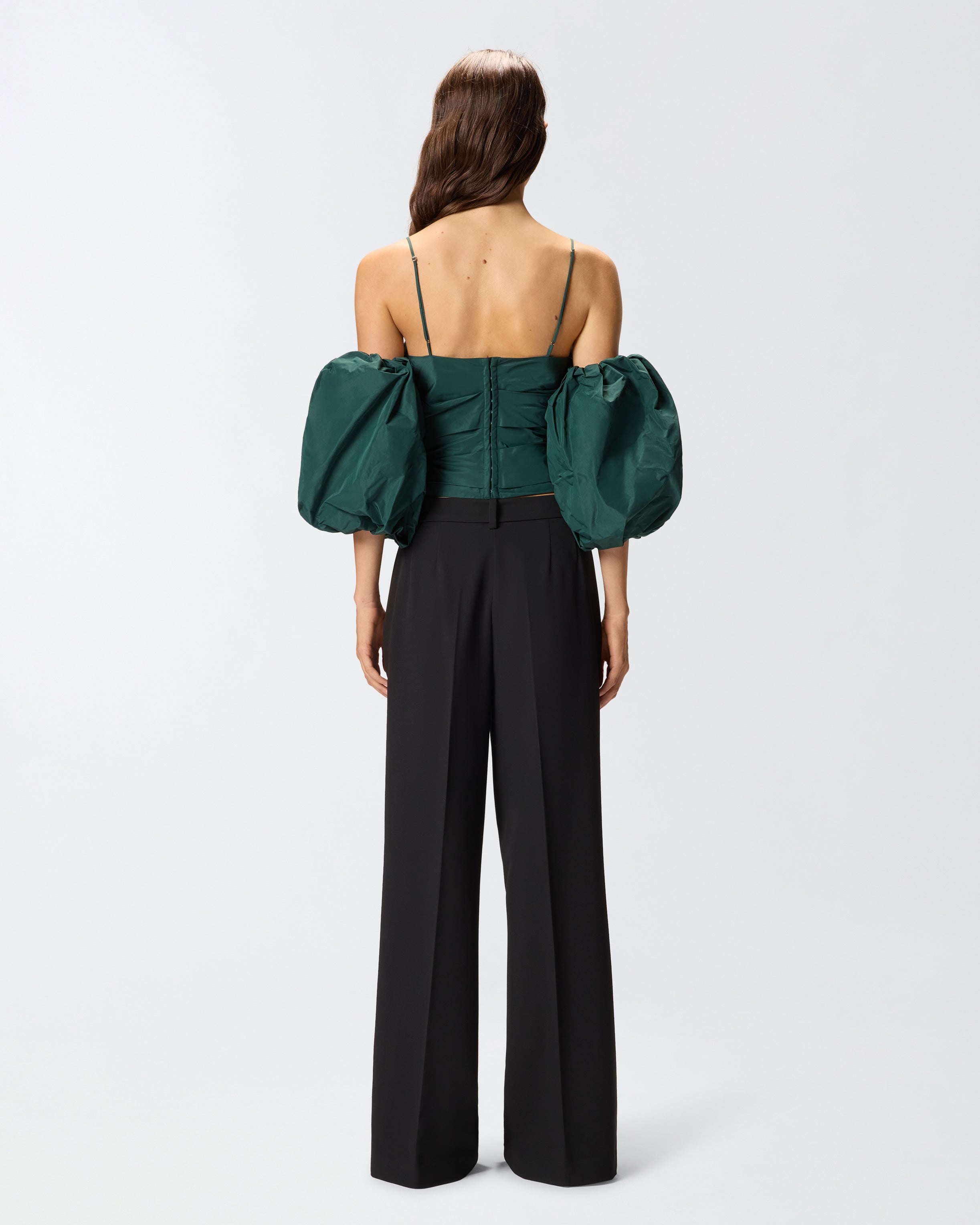 Taffeta crop top with slim shoulder straps and detachable sleeves, offering different styling options. The material is light and shiny and blends perfectly with the dynamic-volume design that distinguishes the garment. The meticulous cuts and modern lines of the design are embellished by distinctive elements, such as the seductive bustier details on the back and the puff sleeves. It creates an outfit with a dramatic and striking effect, which is also accentuated by the slightly gathered fabric of this distinctive top.