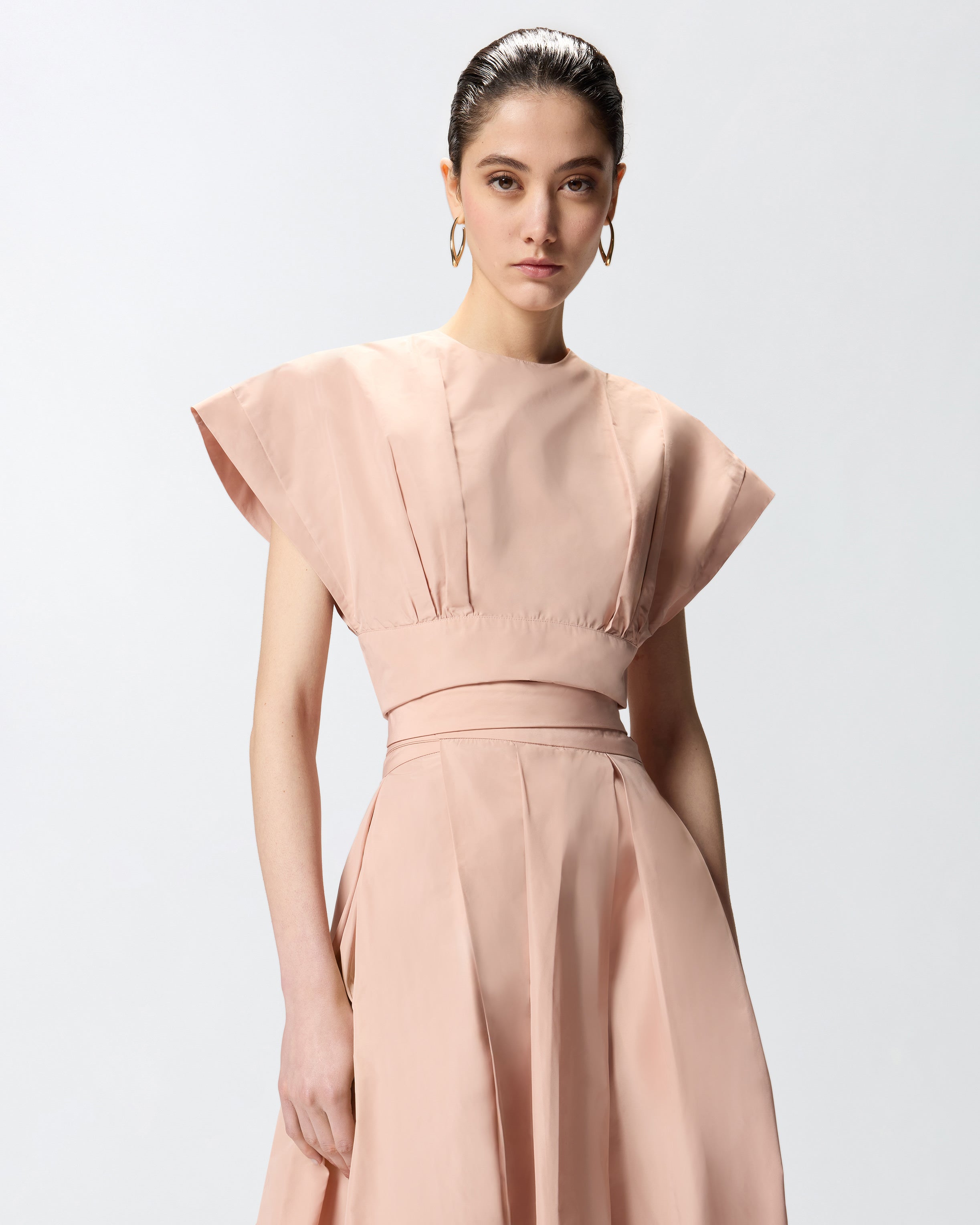 Cropped crew-neck top with a contemporary silhouette, featuring short, wide sleeves and a wide band under the bust. This garment is made from taffeta, a lustrous fabric with a crisp, structured feel that fully embodies PINKO’s DNA, and is finished with elegant front darts that add extra structure. On the back there is a double fastening: a small button in tone placed behind the neck and two bra-style waist hooks that allow two different options for adjustment. This top is the perfect complement to your special-occasion outfits for the summer, paired with a refined midi skirt.