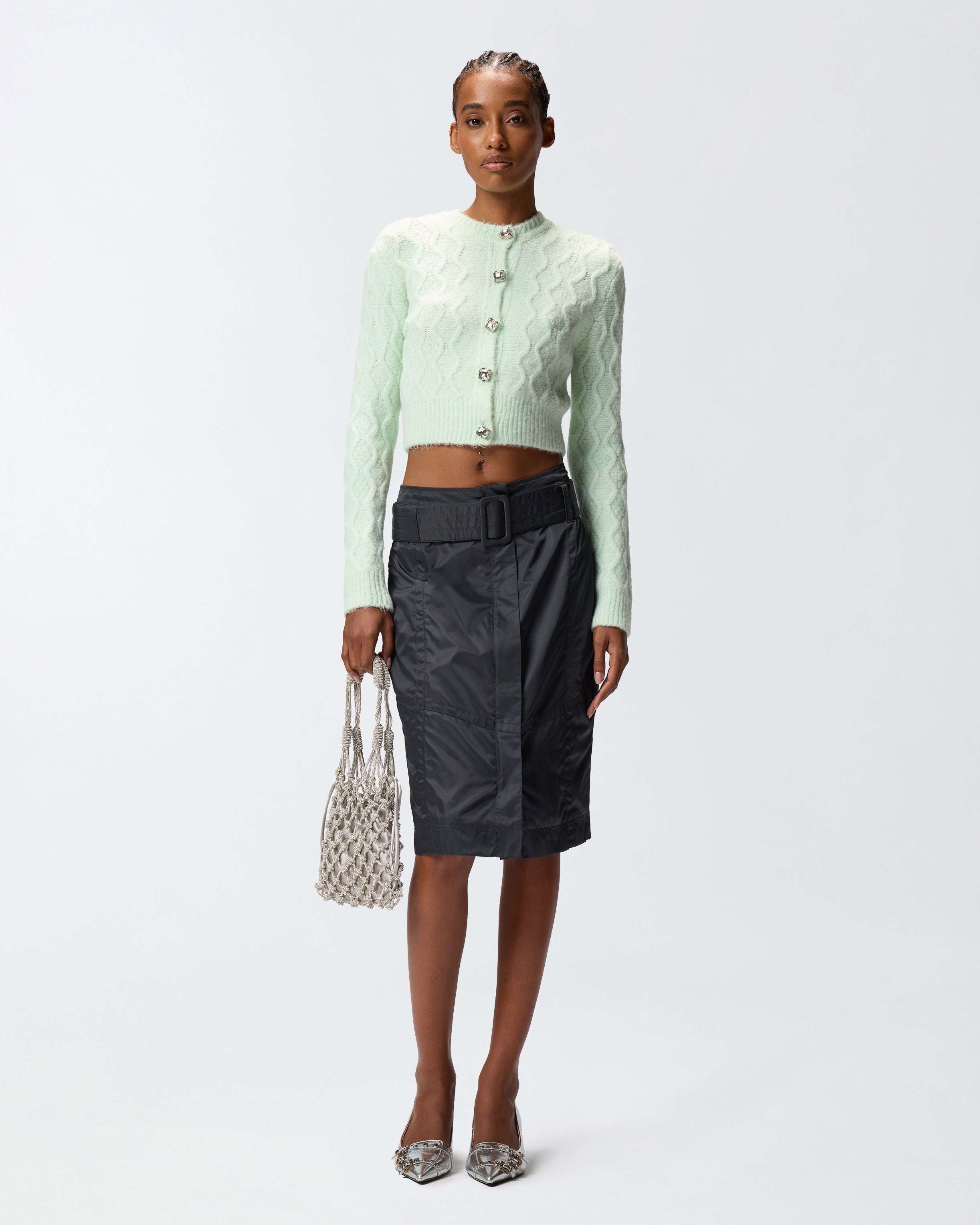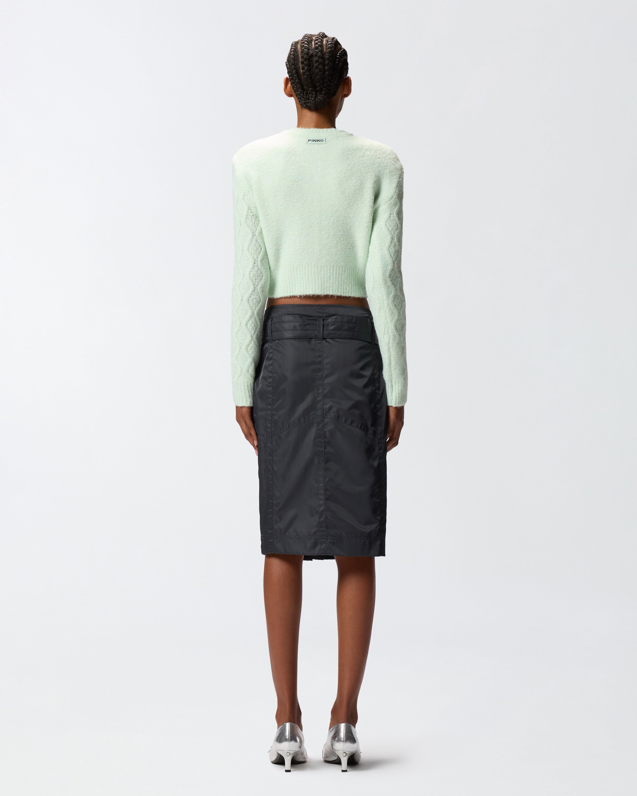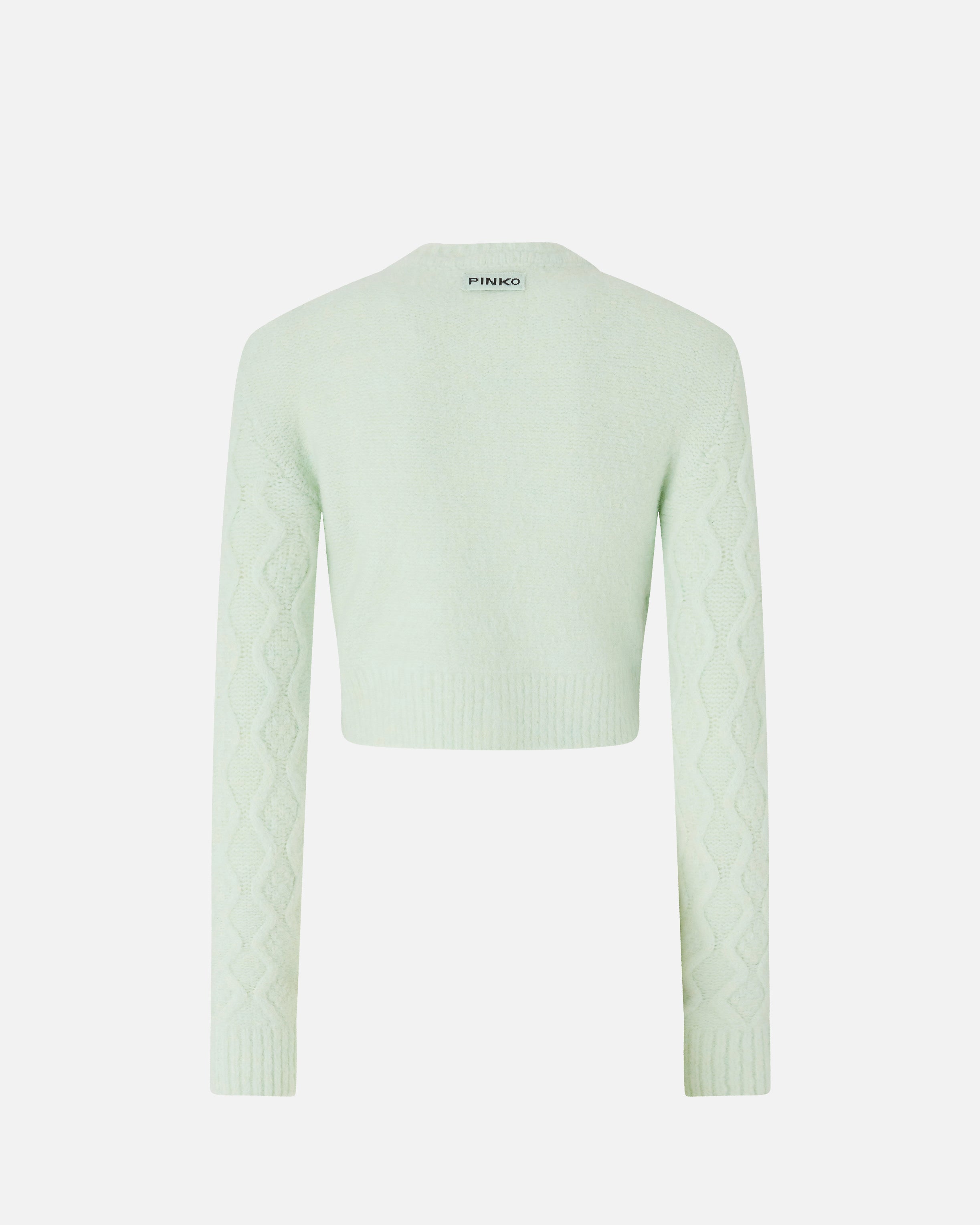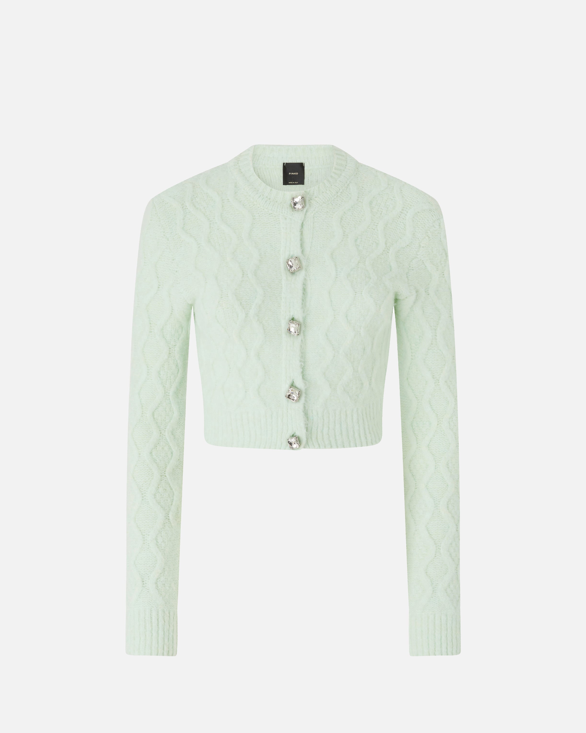 Cropped crew-neck cardigan with chunky-knit woven detailing on the front and long sleeves that's striking, ultra-lightweight and very pleasant to the touch. This piece is enhanced by large jewel buttons down the front placket and customised with a rear label featuring the PINKO logo lettering. The piece has undergone finishing tests to minimise the possible formation of pilling, ensuring greater fabric softness and durability.