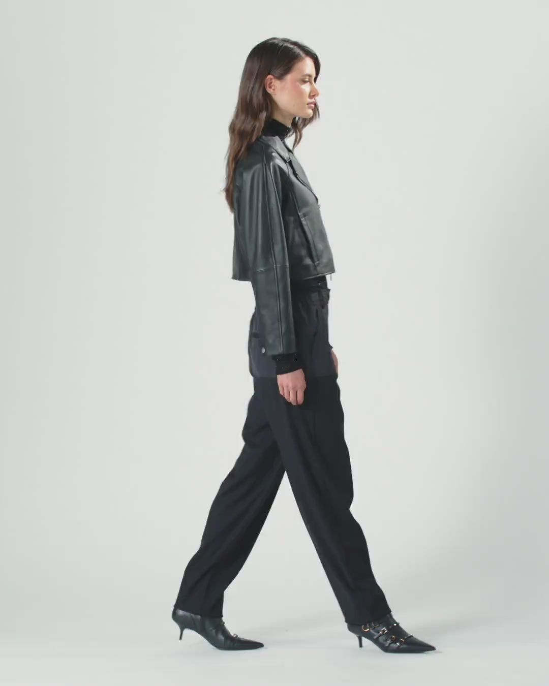 Biker-style jacket in soft, smooth nappa leather with metal buttons at the neck. Off-centre zip fastening. This jacket offers a fresh, modern take on the classic leather biker jacket, with a slightly more relaxed and rounded cropped cut, making it ideal to pair with everyday looks and elevate them with the style this piece of outerwear brings.