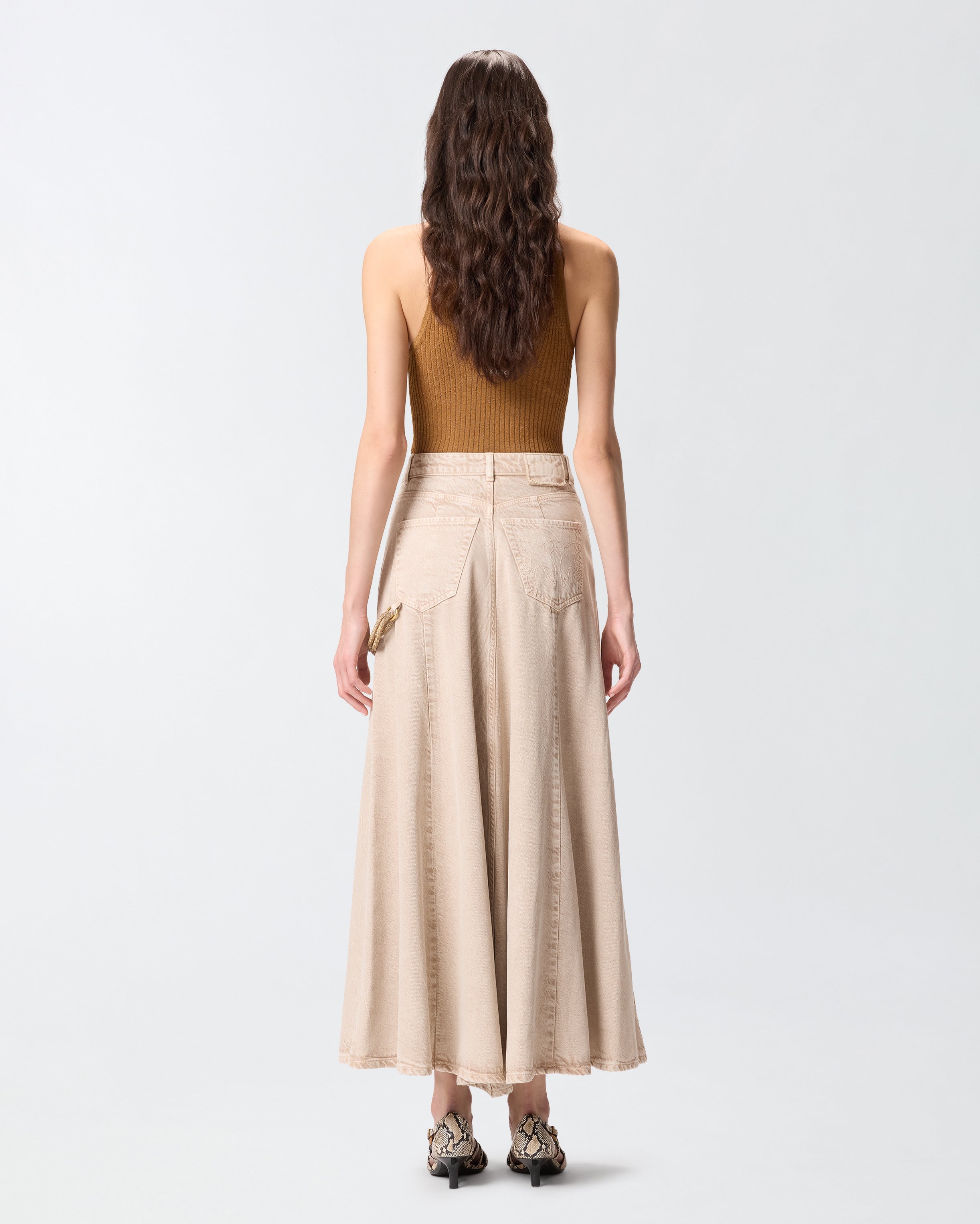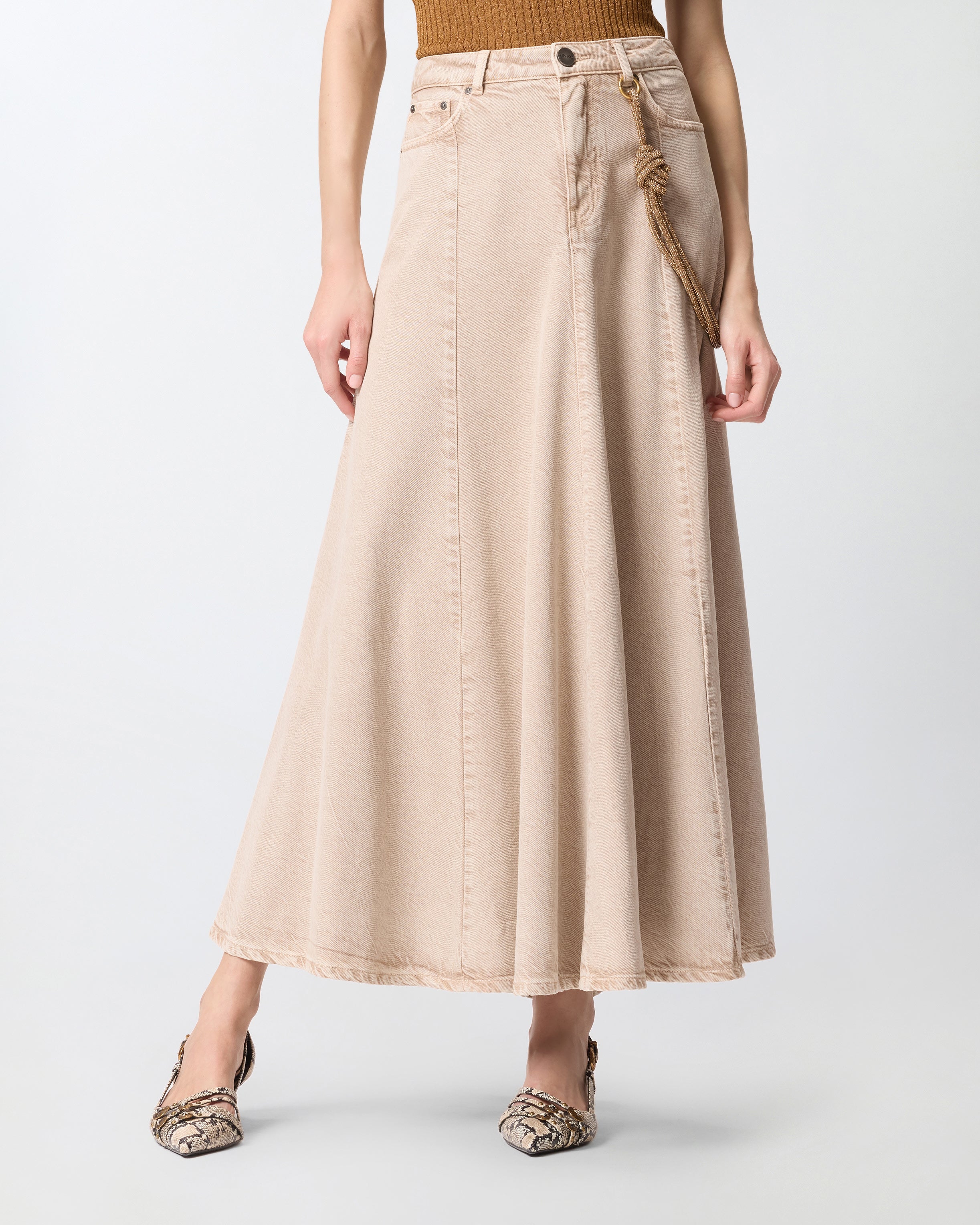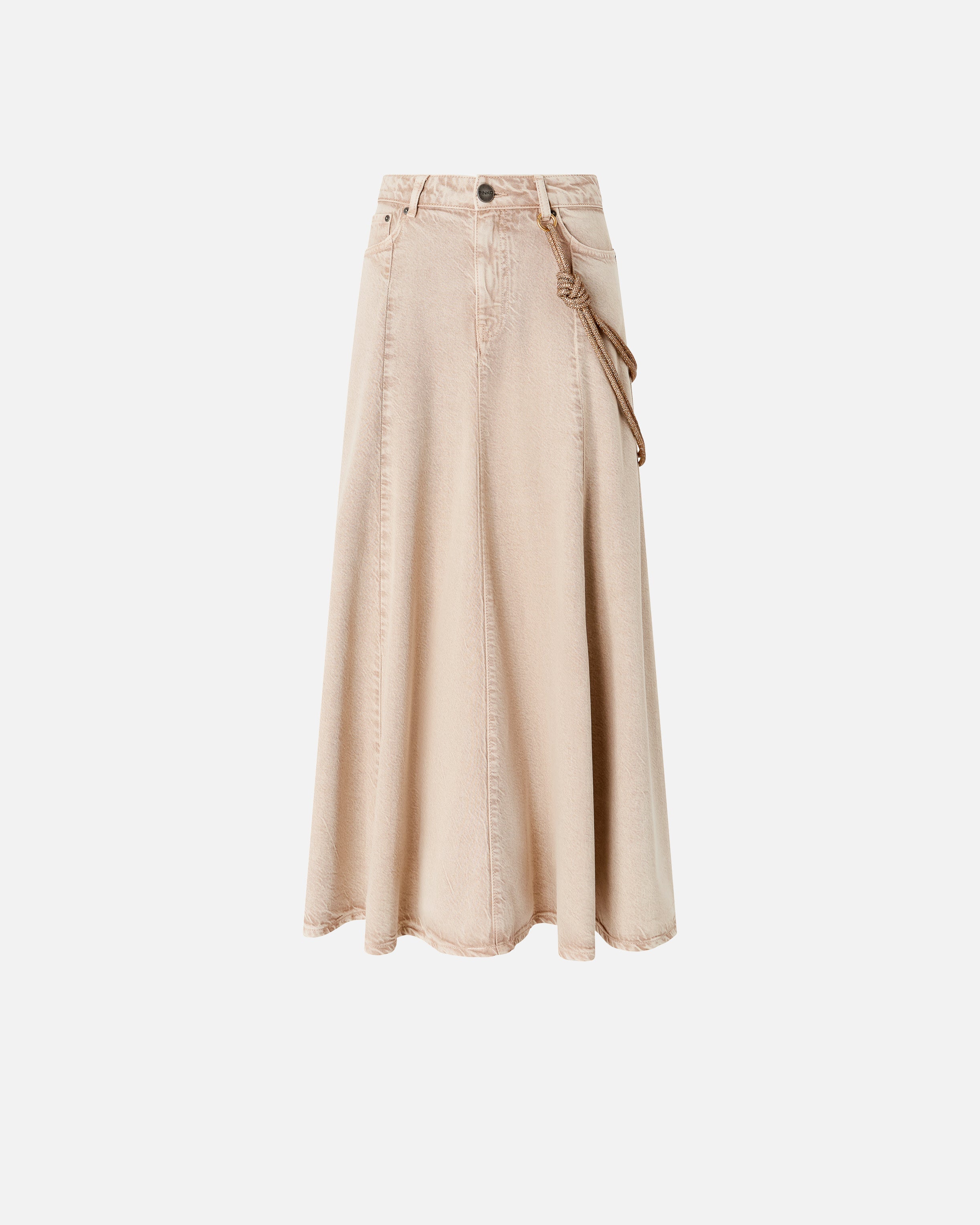 Five-pocket midi skirt made of cotton and lyocell denim with a fluid feel and a slightly flared cut with soft pleats at the hem. Equipped with a convenient concealed zip and visible button fastening at the front, the style is decorated with a special detail: a removable jewel cord to attach to the front and back loop, lit up with small rhinestones. The design is finished with a matching embroidered Love Birds logo on one of the rear pockets. The skirt is ideal with a shirt for an everyday outfit with a personal, feminine touch—one you can also wear to the office. - HURGHADA SKIRT