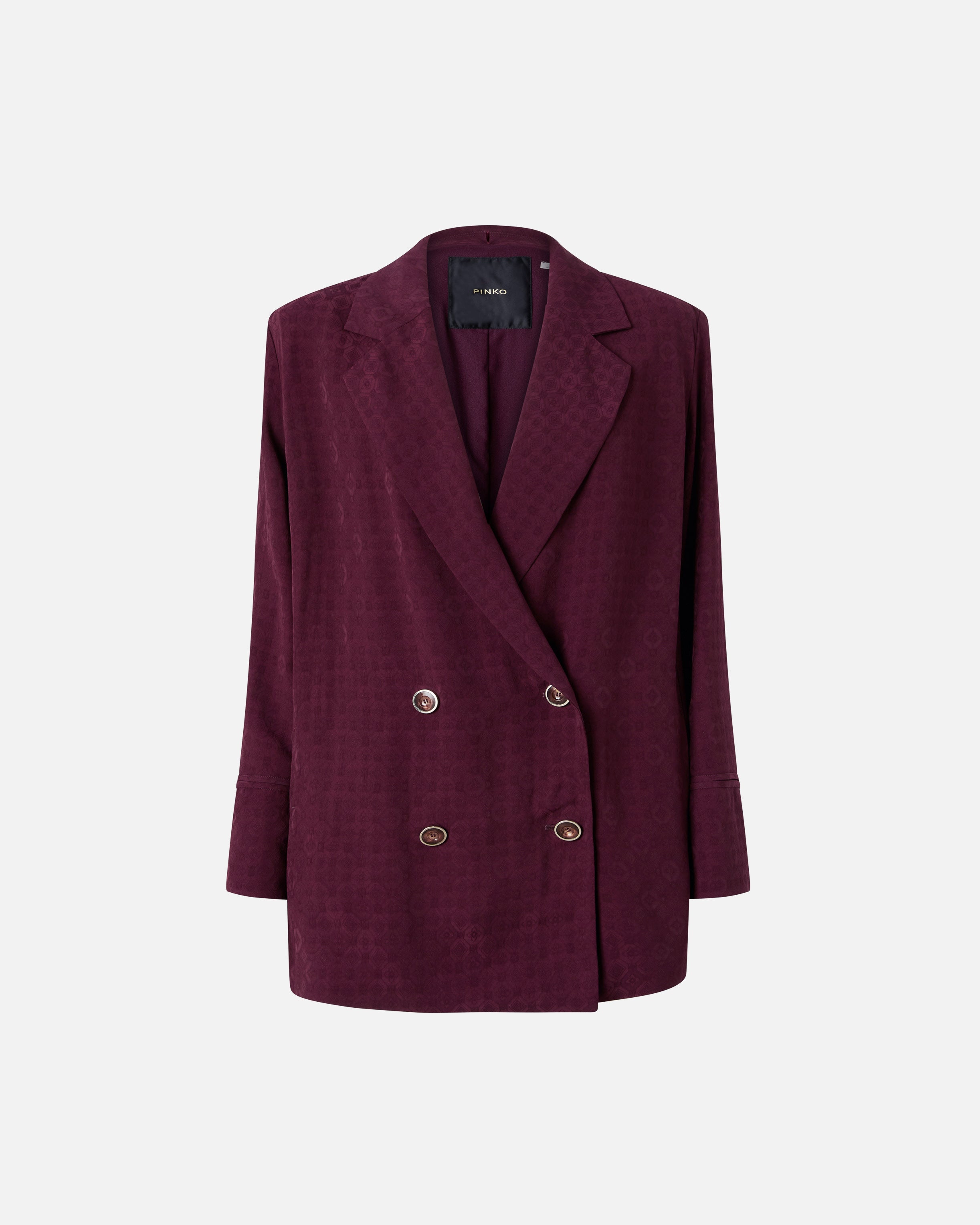 Deconstructed double-breasted jacket in soft and silky jacquard fabric featuring a refined tone-on-tone all-over tie motif. This style, with a fluid cut, features an inner lining for greater comfort when worn, and is complete with hidden side pockets. The jacket can be worn with the matching trousers to make an elegant suit, or with T-shirts and jeans for an everyday look that won't go unnoticed. - GWEN JACKET