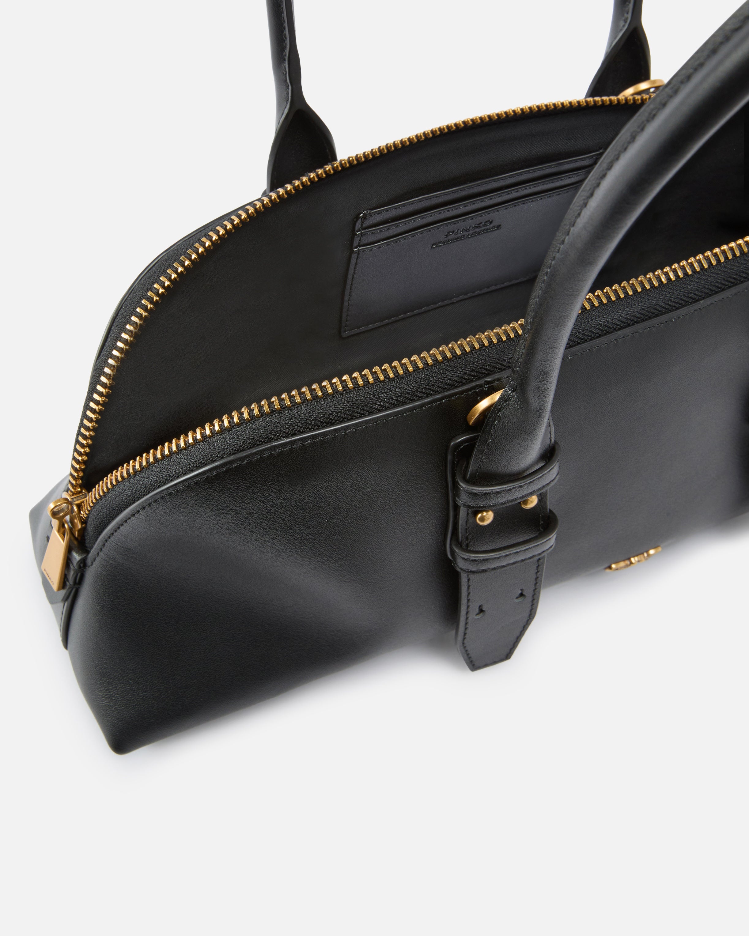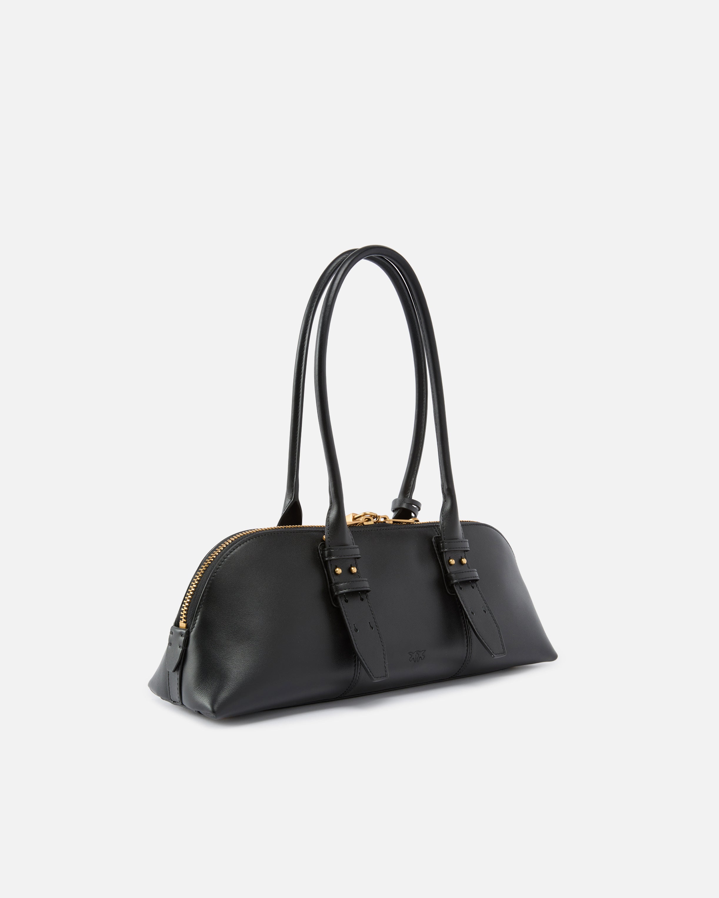Escape Bag Horizontal large bowling bag in soft leather. Ultra-versatile and refined, this bag has two long top handles and an adjustable and removable leather shoulder strap that allow you to carry it three ways: on the shoulder, crossbody or by hand. The two-way zip fastening on top is personalised with an original detail: a padlock decorated with the iconic Love Birds logo that can be opened and closed thanks to the key contained in the leather charm that completes the bag. The accessory features a cotton drill-lined interior with a slip pocket and slots for cards and documents. Activate your PINKO bag: verify the authenticity of your product and access a personalised experience by scanning the Love Birds embroidery on the back of the bag with your smartphone! - BOWLING HORIZONTAL BIG
