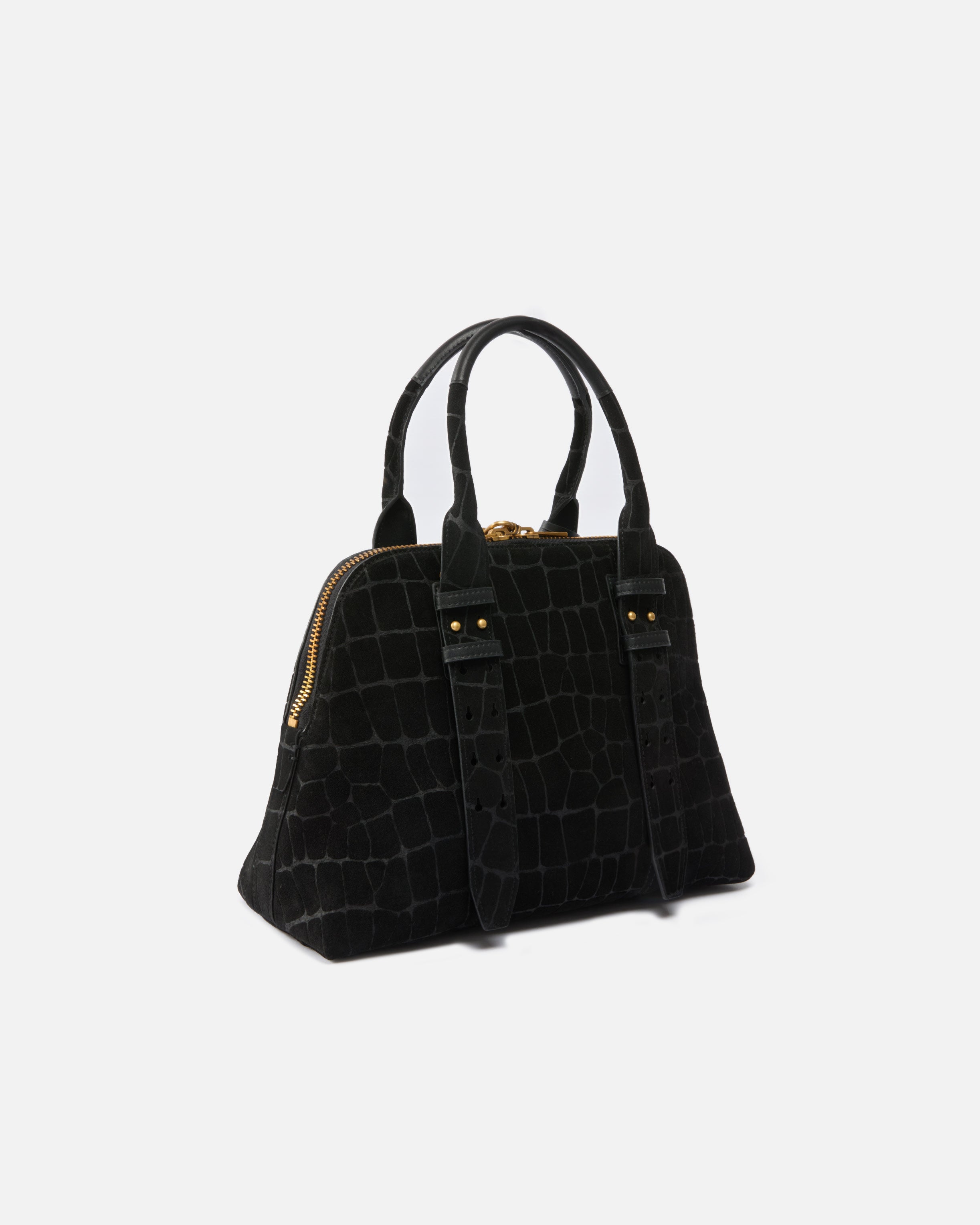 Escape Bag small bowling handbag in crocodile-print nubuck leather. Featuring an adjustable and detachable leather shoulder strap and double handle so it can be carried by hand or on the shoulder, the bag is very versatile and practical. The model features a functional padlock that opens and closes with a key contained in the matching charm, while the finishing touch is provided by the small Love Birds logo plaque symbolising the brand's singular style. The zip fastening at the top opens to reveal a cotton-lined interior with a single zipped slip pocket. Activate your PINKO bag: verify the authenticity of your product and access a personalised experience by scanning the Love Birds embroidery on the back of the bag with your smartphone!
