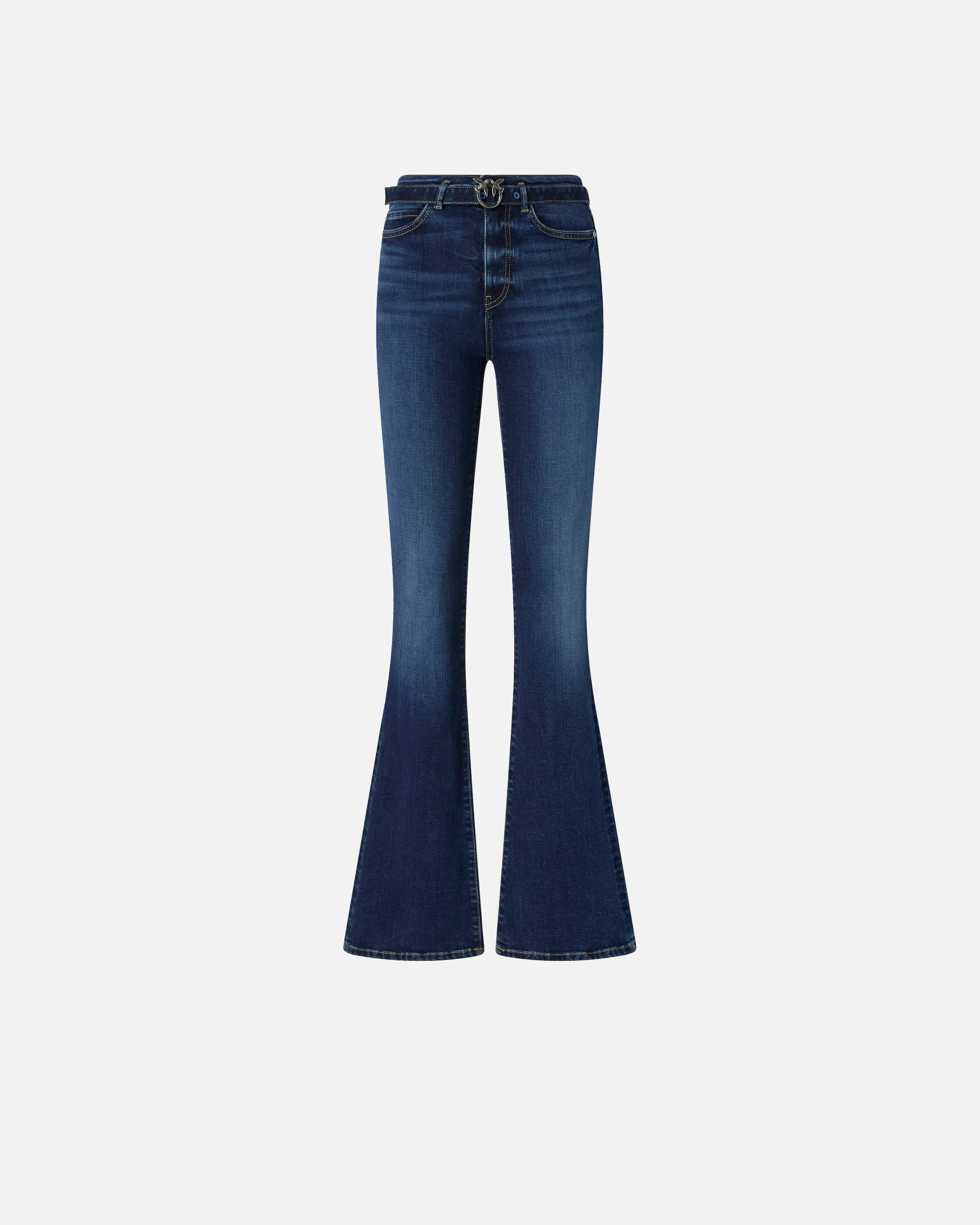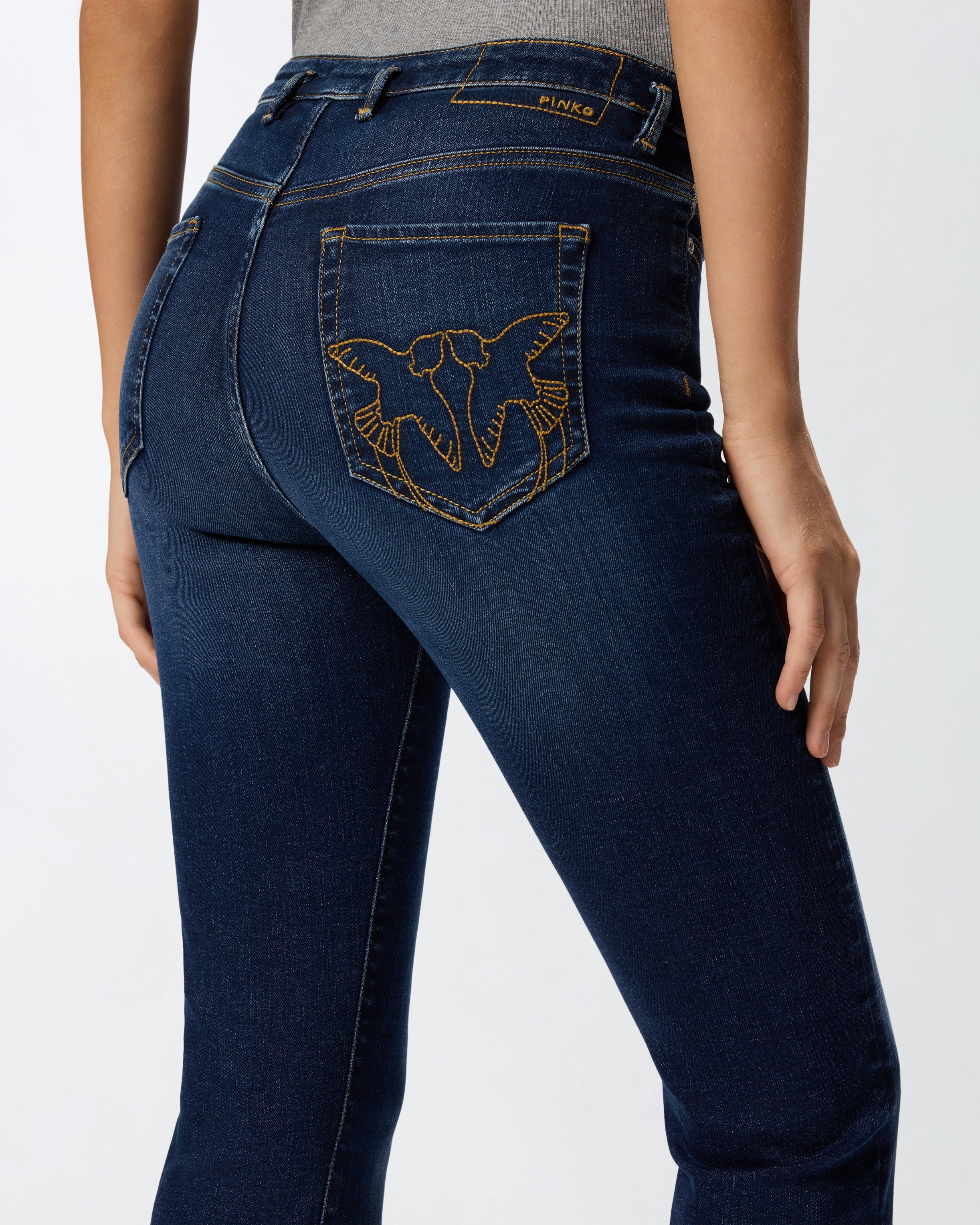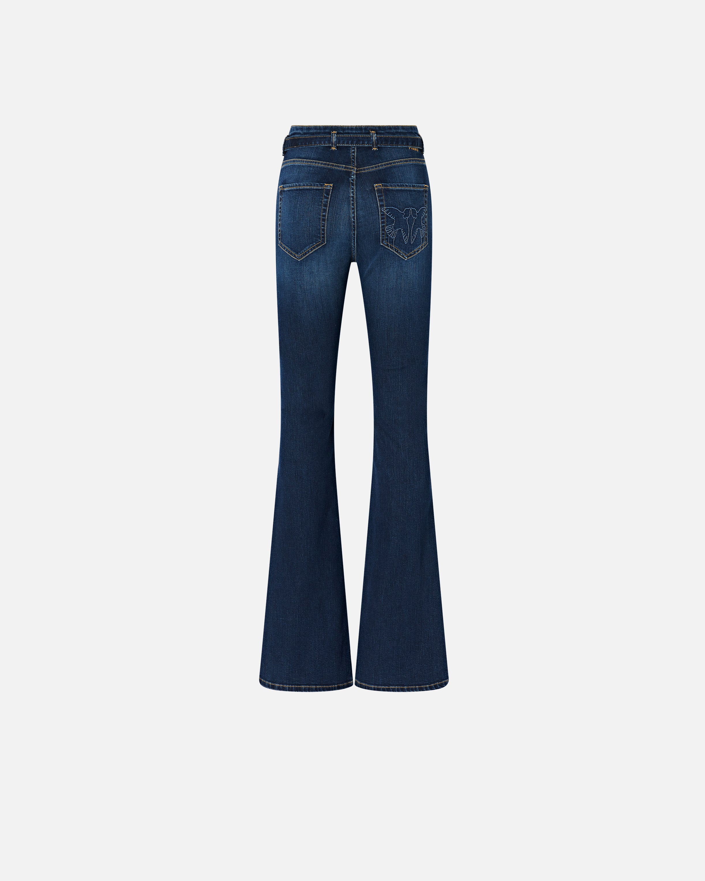 Flared five-pocket jeans with a fitted leg to the knee that flares on the hem, made from cotton-blend power stretch denim with a soft hand. The fabric used is a high recovery denim that does not lose its shape easily and thus will retain its original shape over time. The brand's lettering logo embroidered on the back of the waistband and the Love Birds logo with embroidered birds on the right back pocket add pure PINKO style to the design. Complete with a matching-fabric belt with the metal Love Birds Diamond Cut buckle. Mid-rise with belt loops and a zip and button fastening.