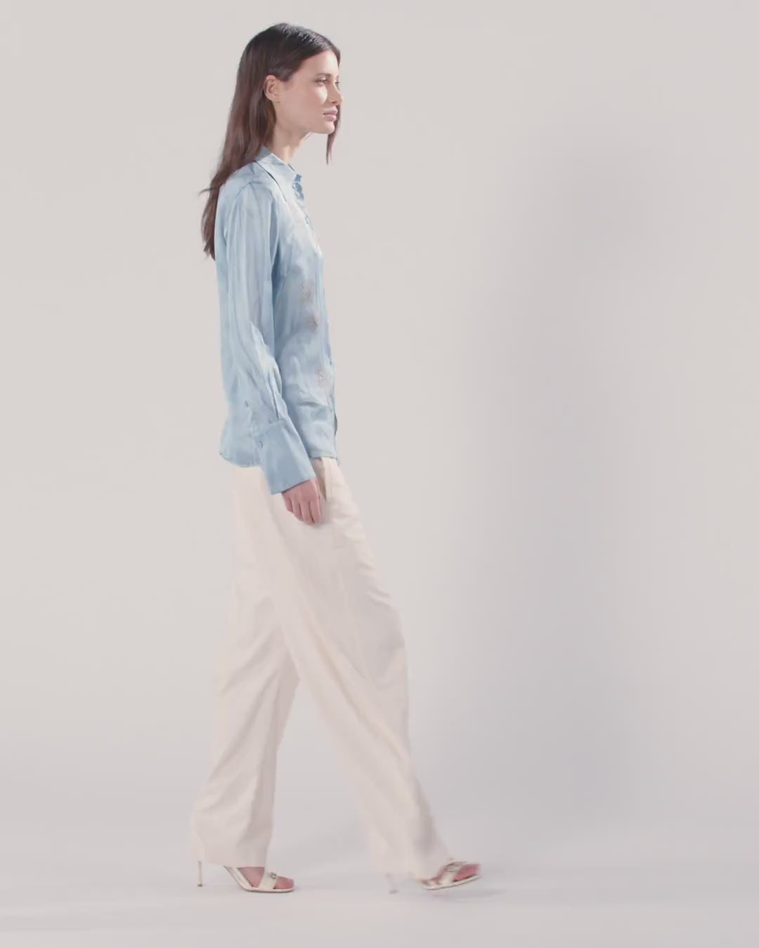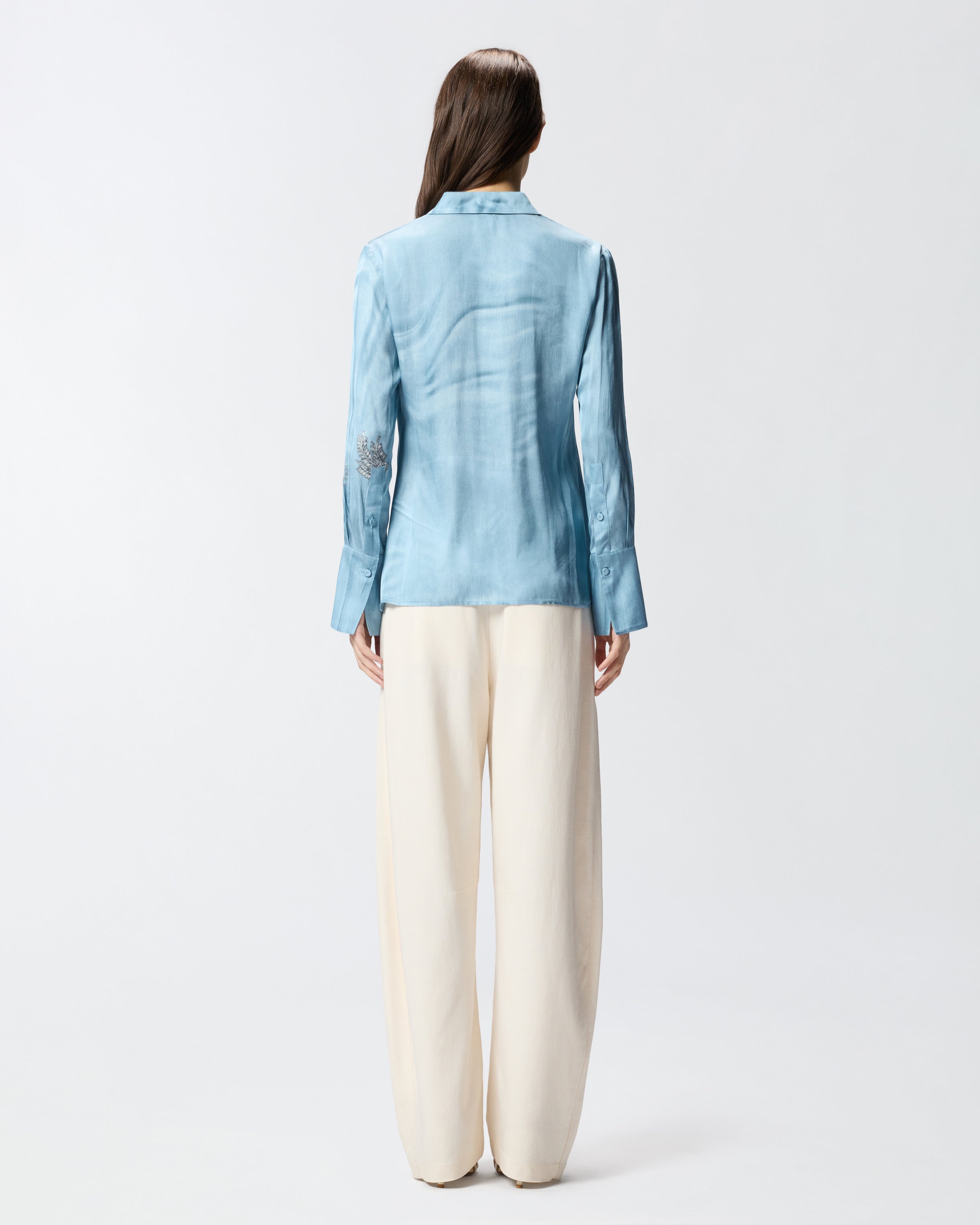 Flowing shirt with classic collar, long sleeves with buttoned long cuffs and fabric-covered button fastening at the front. This model is made from fluid viscose satin featuring a placed, denim-effect trompe-l'œil effect print enhanced by a jewel-brooch motif. Turn your outfit into a work of art and wear this shirt with its matching trousers for an original head-to-toe look that won't go unnoticed. - CHRISTA SHIRT