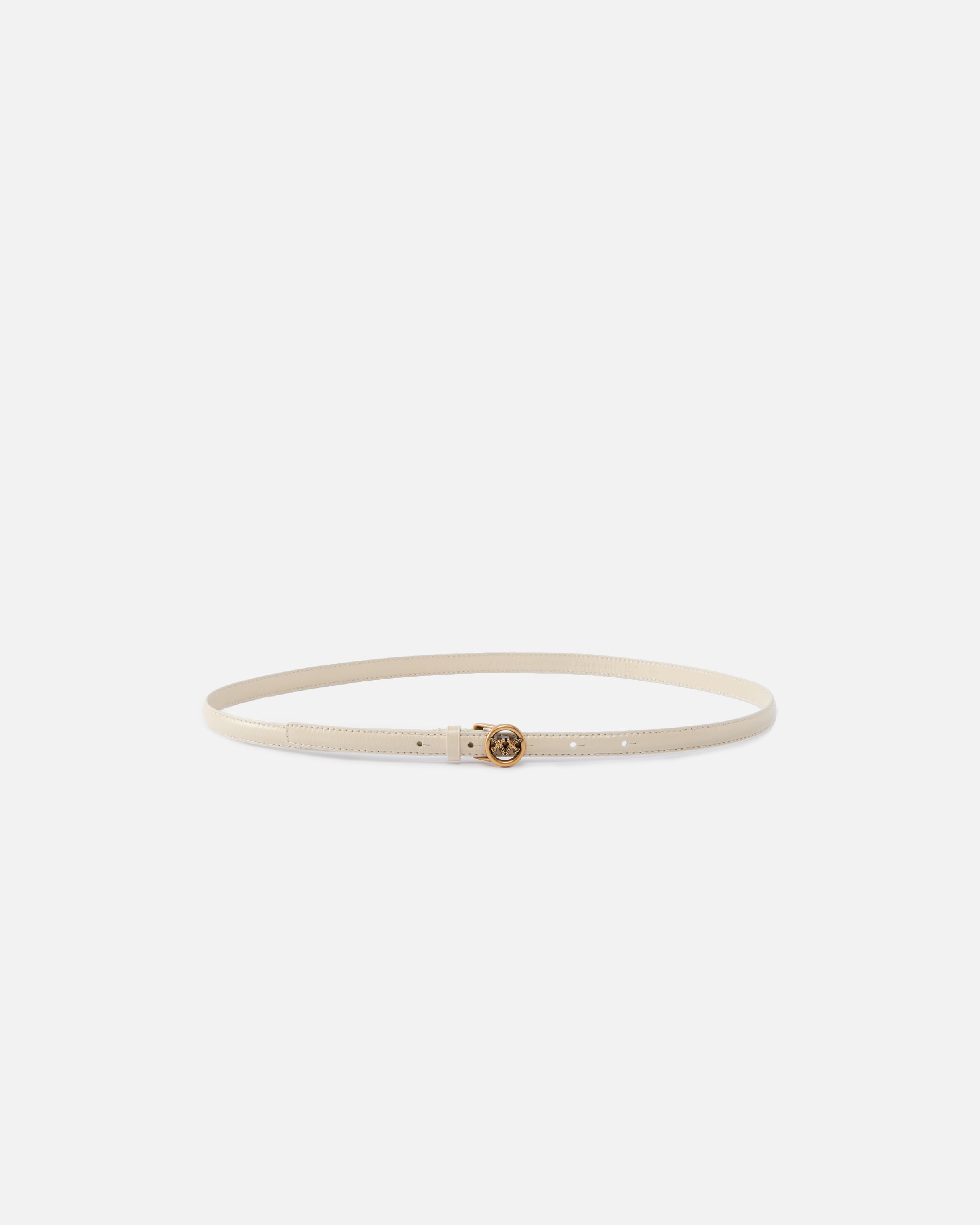 1-cm slim belt in soft, polished leather. This piece, perfect for elevating a daytime outfit or to give an elegant evening look a finishing touch, is customised with a small circular buckle featuring the iconic Love Birds.