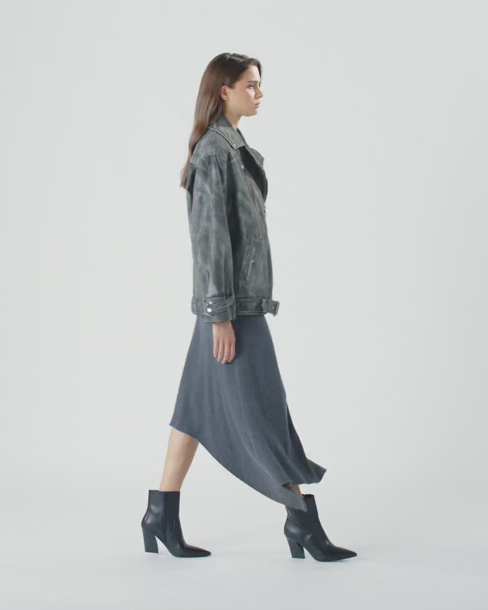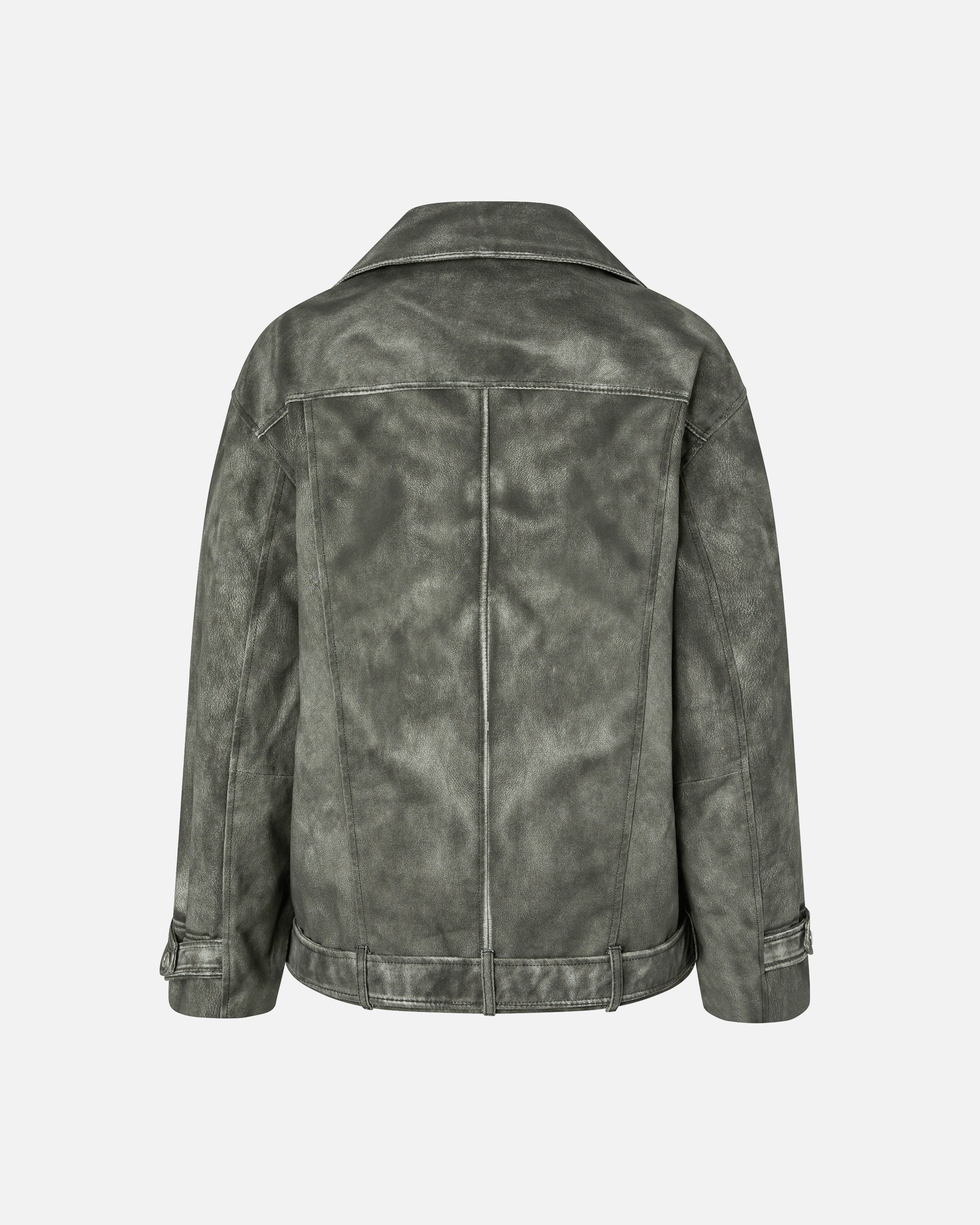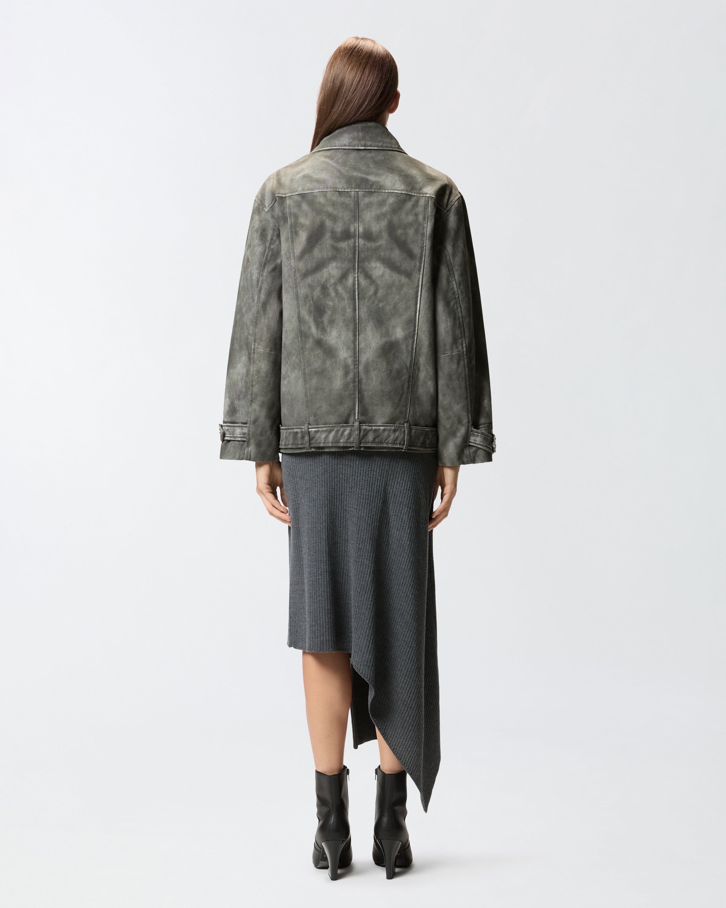 Oversized jacket in 100% cotton fabric with trompe-l'œil print that creates the illusion of genuine leather with a vintage look. This piece, complete with off-centre zip fastening, side pockets, chest pocket and waist belt, is further enhanced by biker-style details, including topstitching, studs and decorative zips, which are also printed. Be daring and give your casual looks a rock'n'roll edge.